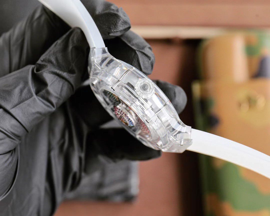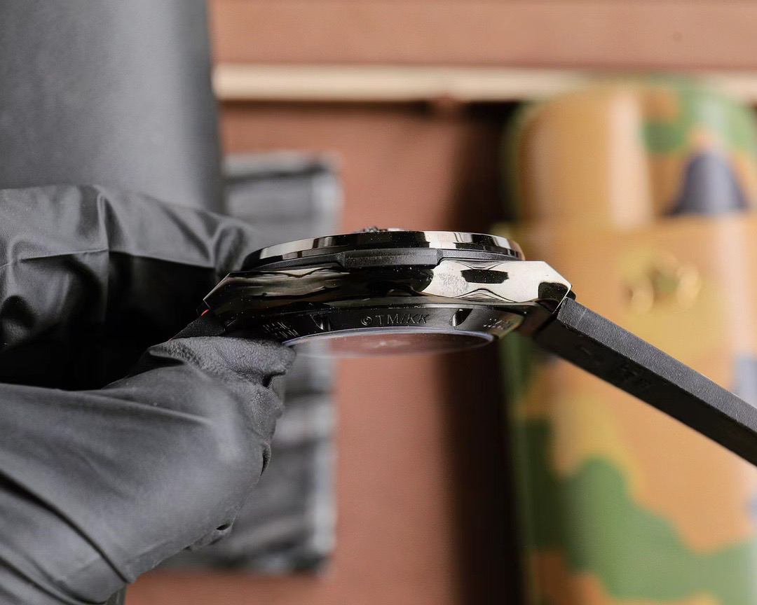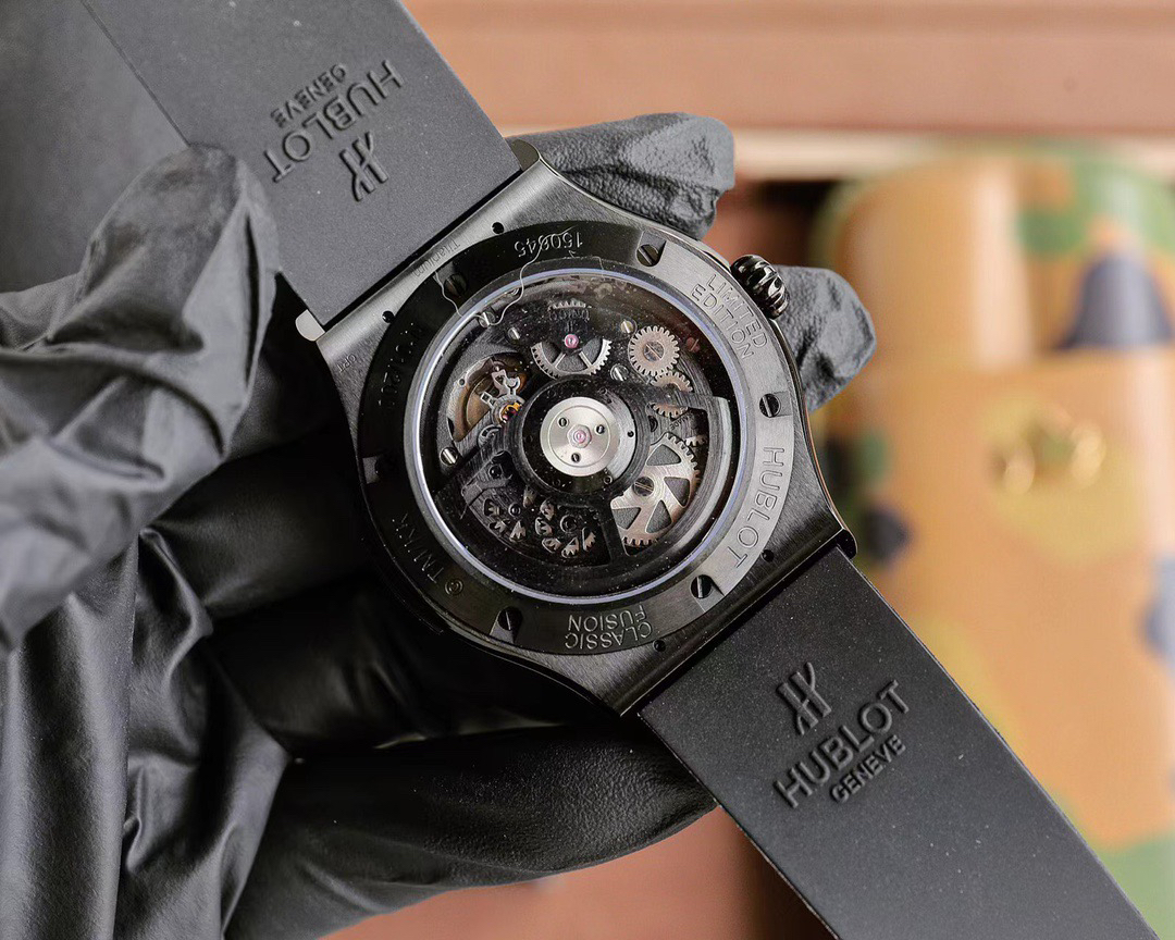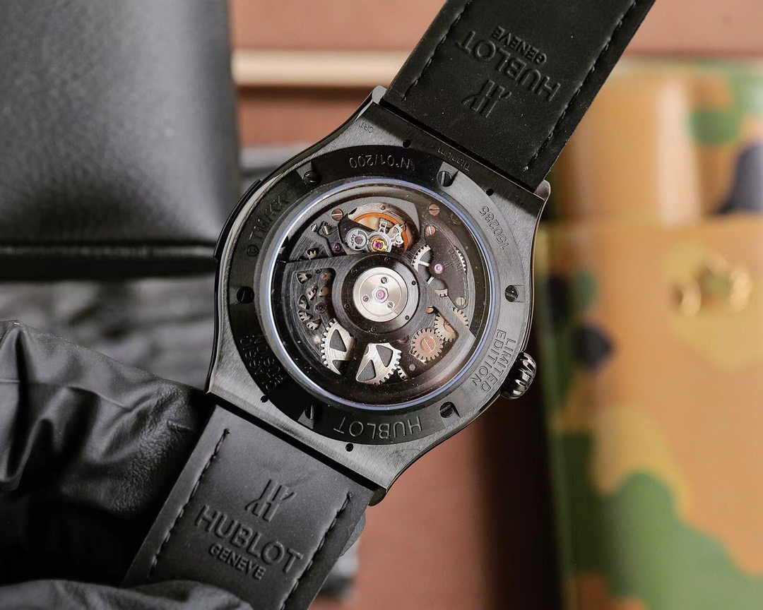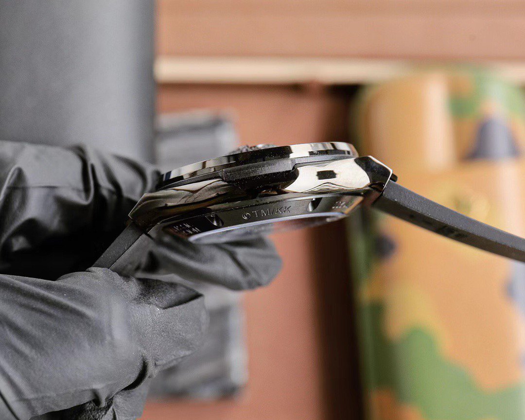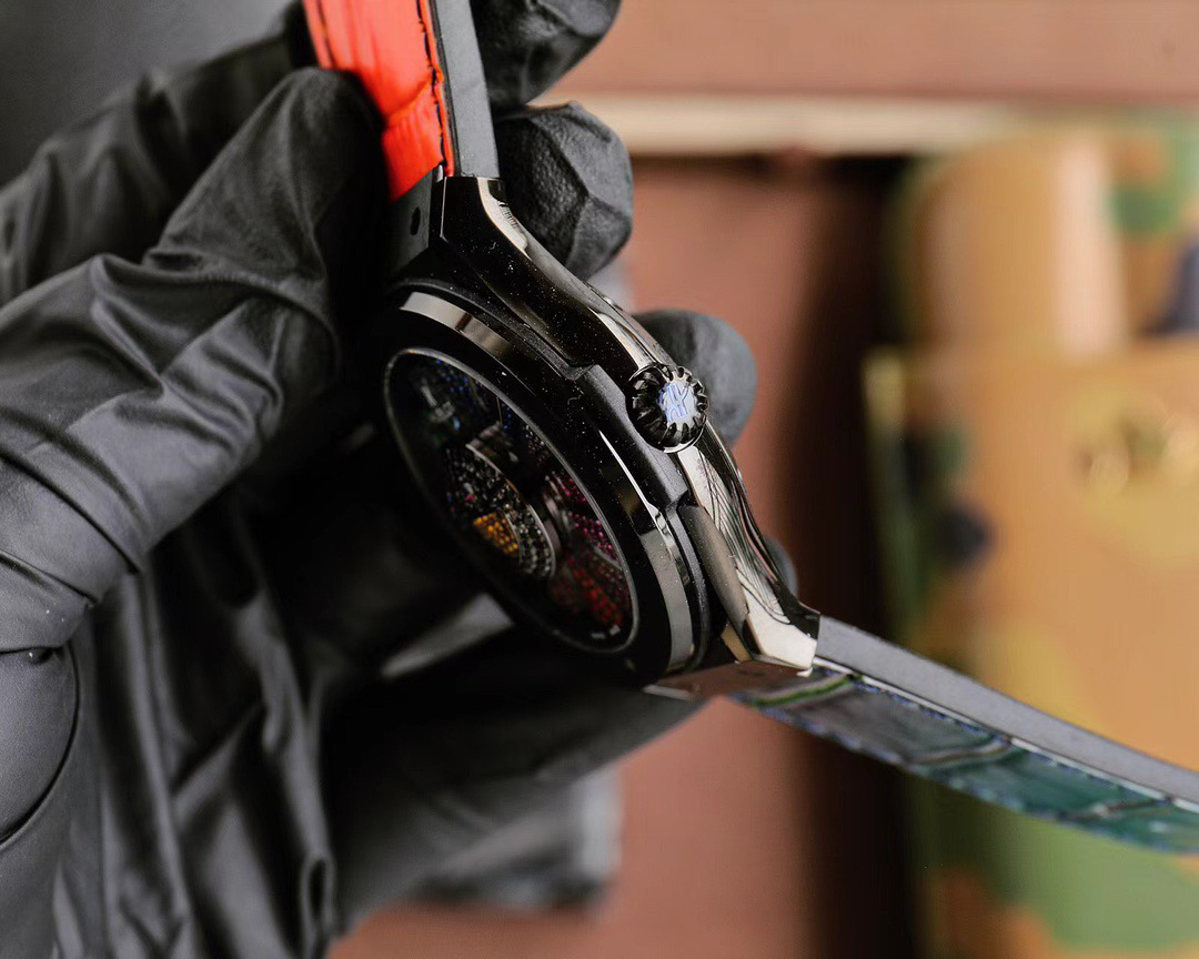 首先,让我们聚焦于这款腕表的外观设计。表壳采用缎面及抛光黑色处理,45 毫米的直径搭配 13.45 毫米的厚度,展现出大气而稳重的姿态。黑色陶瓷表圈,同样经过缎面及抛光工艺,散发着低调奢华的光泽。而表背则是缎面黑色陶瓷搭配蓝宝石镜面,不仅坚固耐用,更让你可以一窥内部复杂而精美的机芯构造。