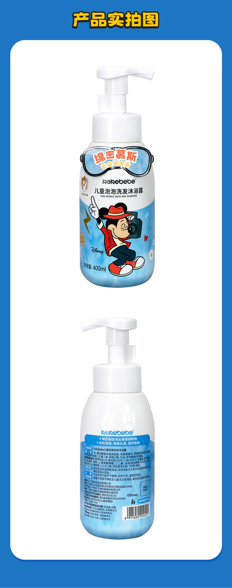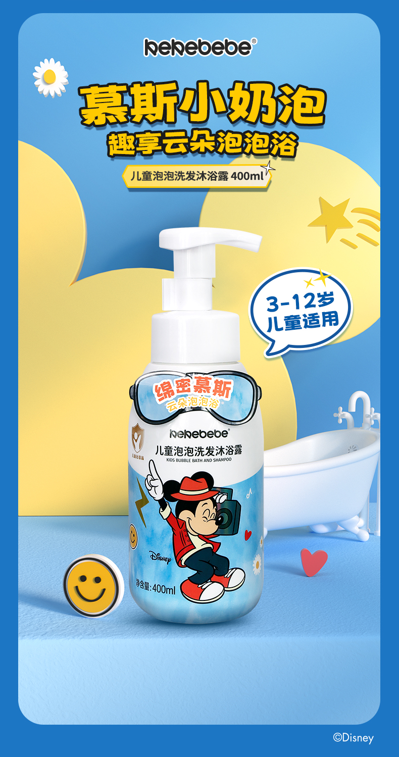 迪士尼kekebebe儿童洗发水丰富细密泡泡洗发沐浴露400ml