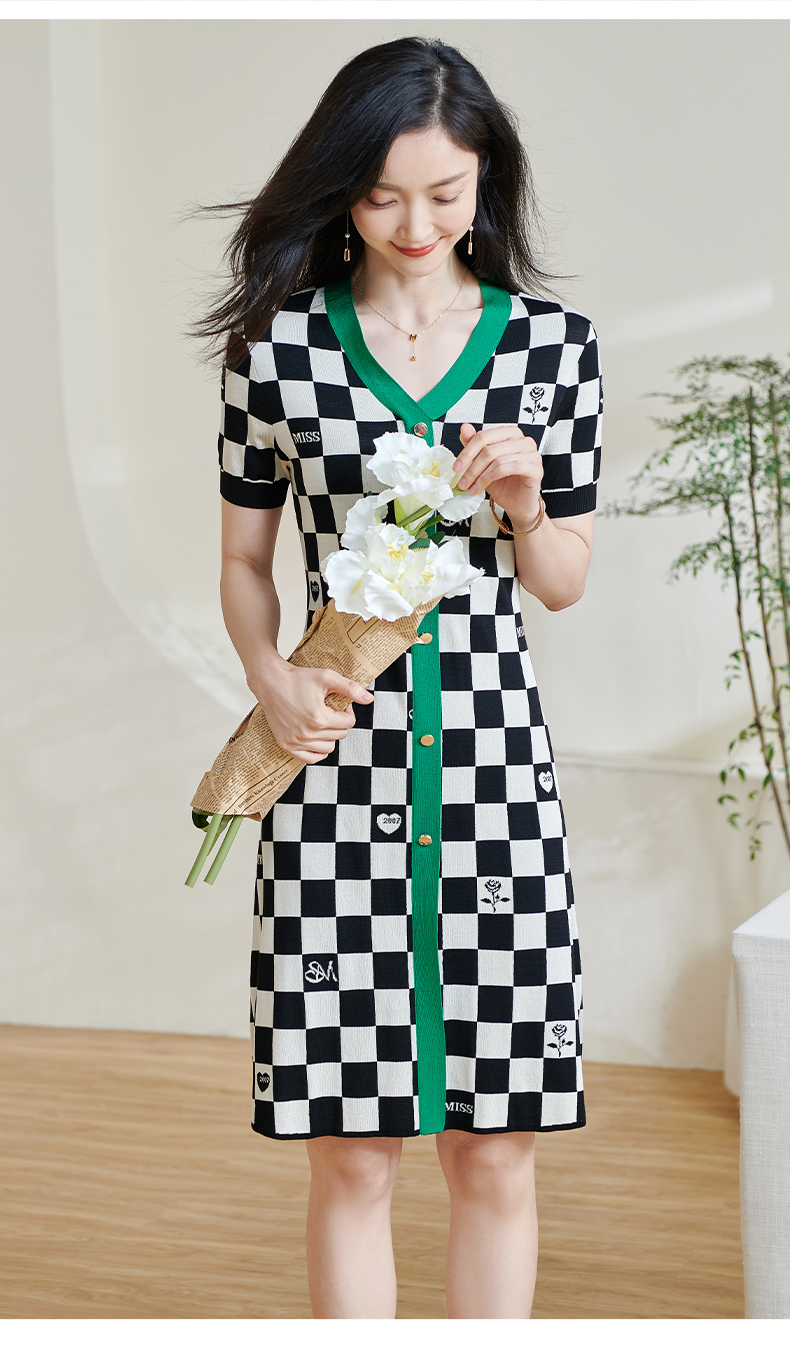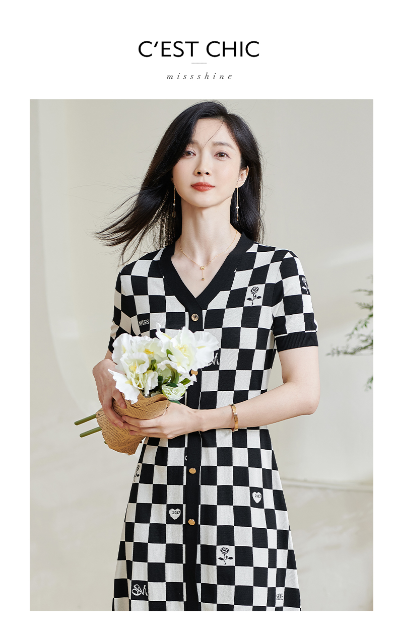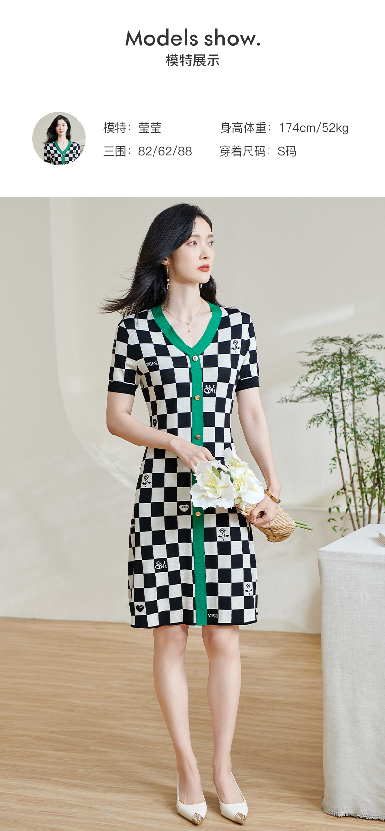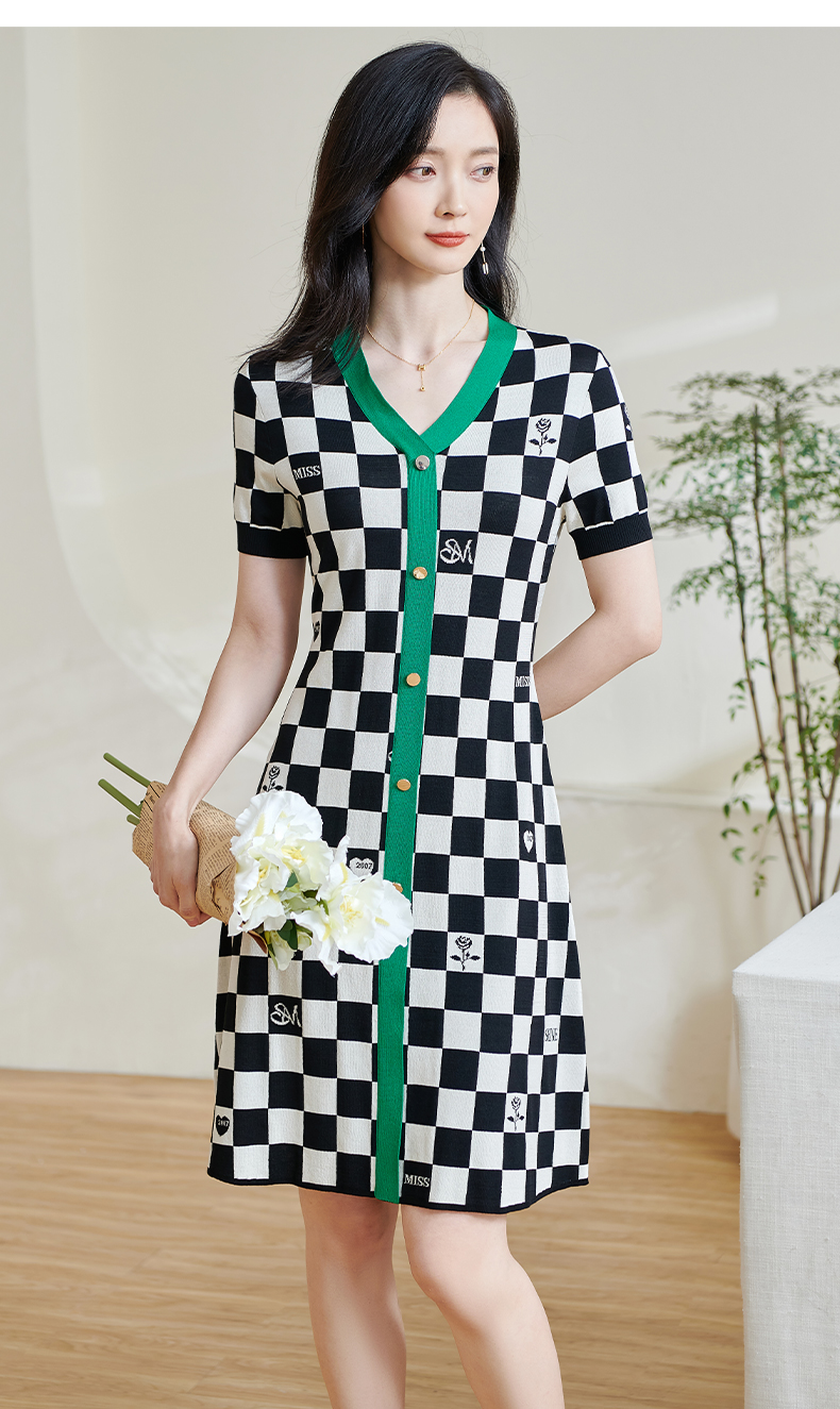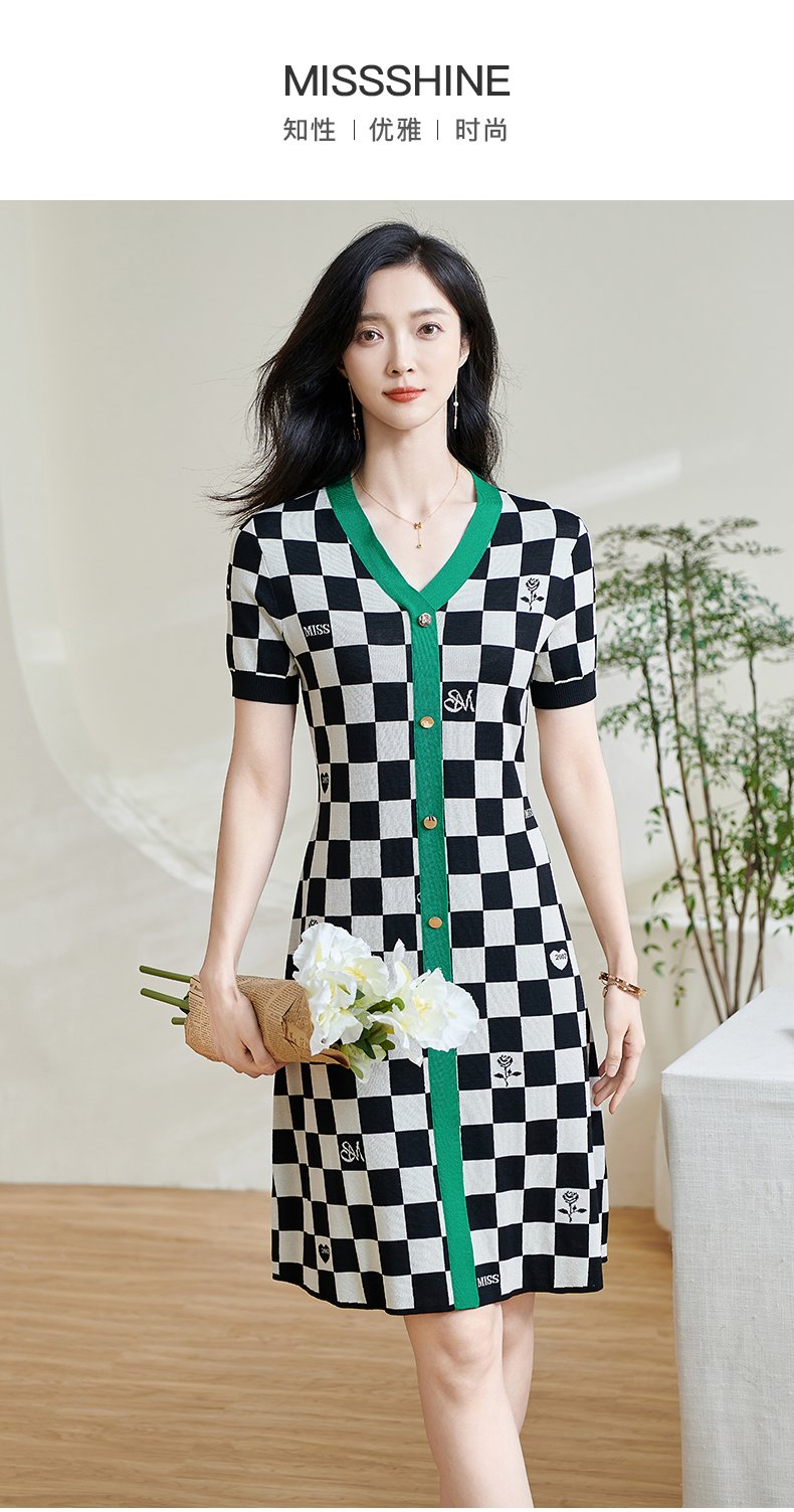 米思阳2026春夏新款时尚别致拼接连衣裙棋盘格弹力针织a字裙0571