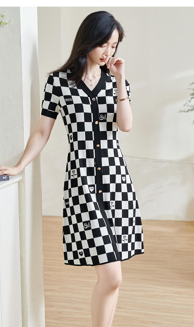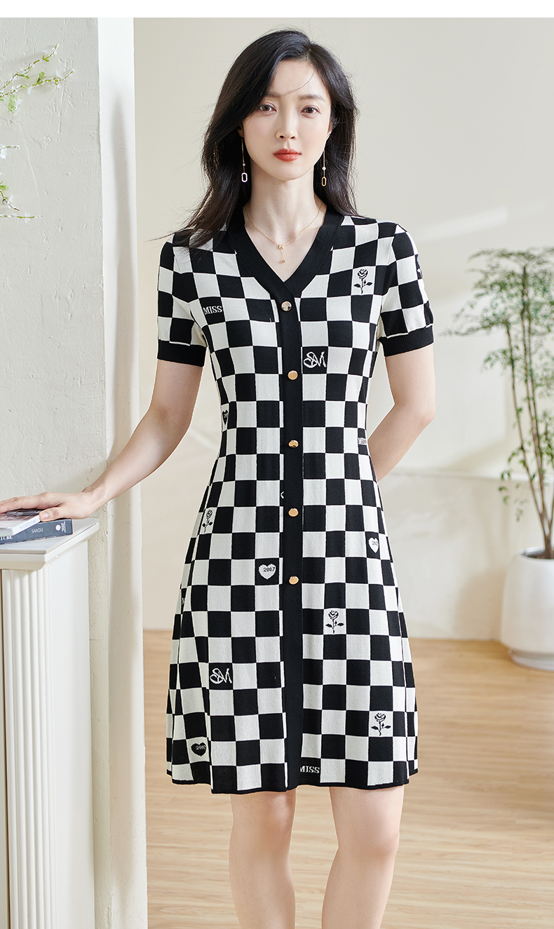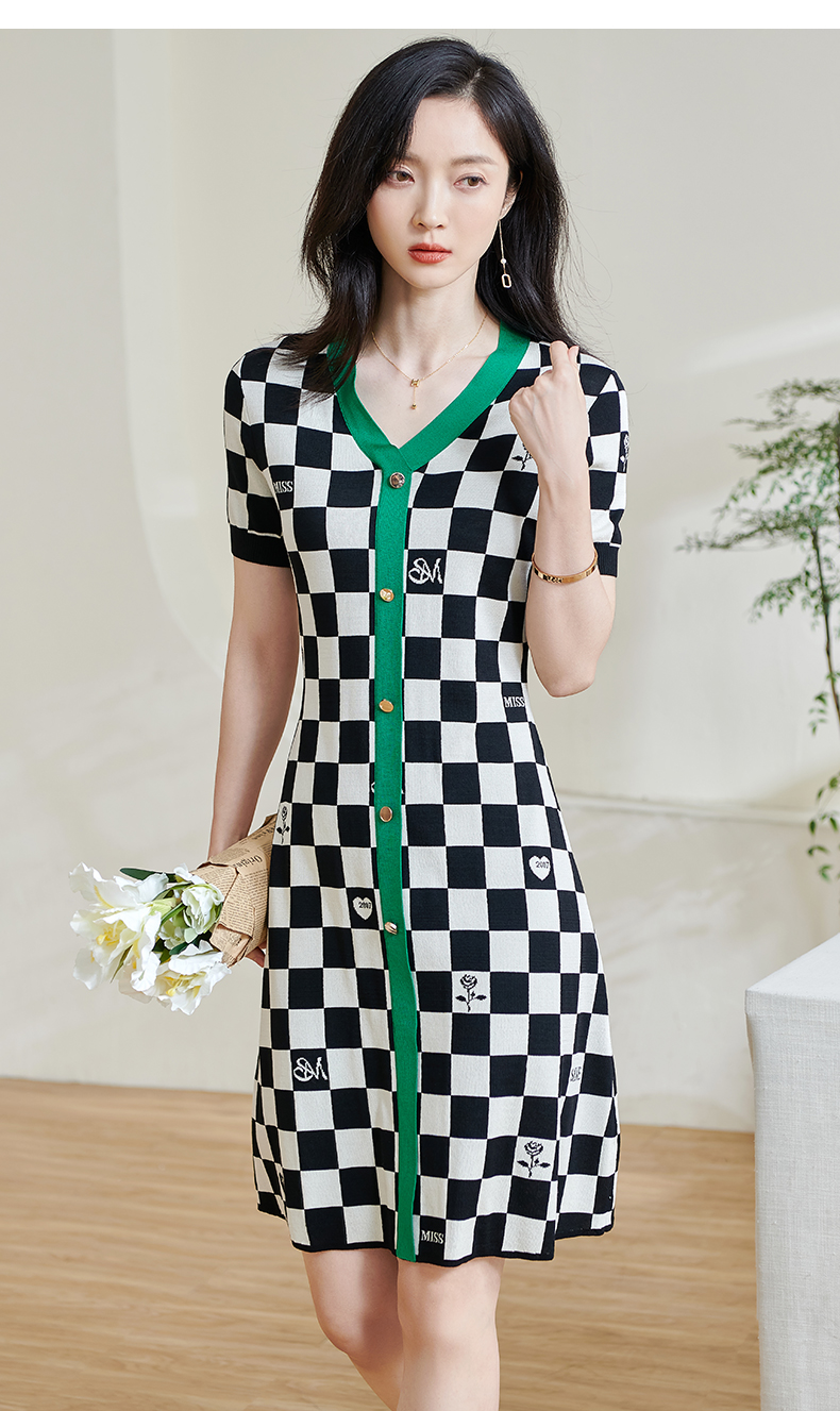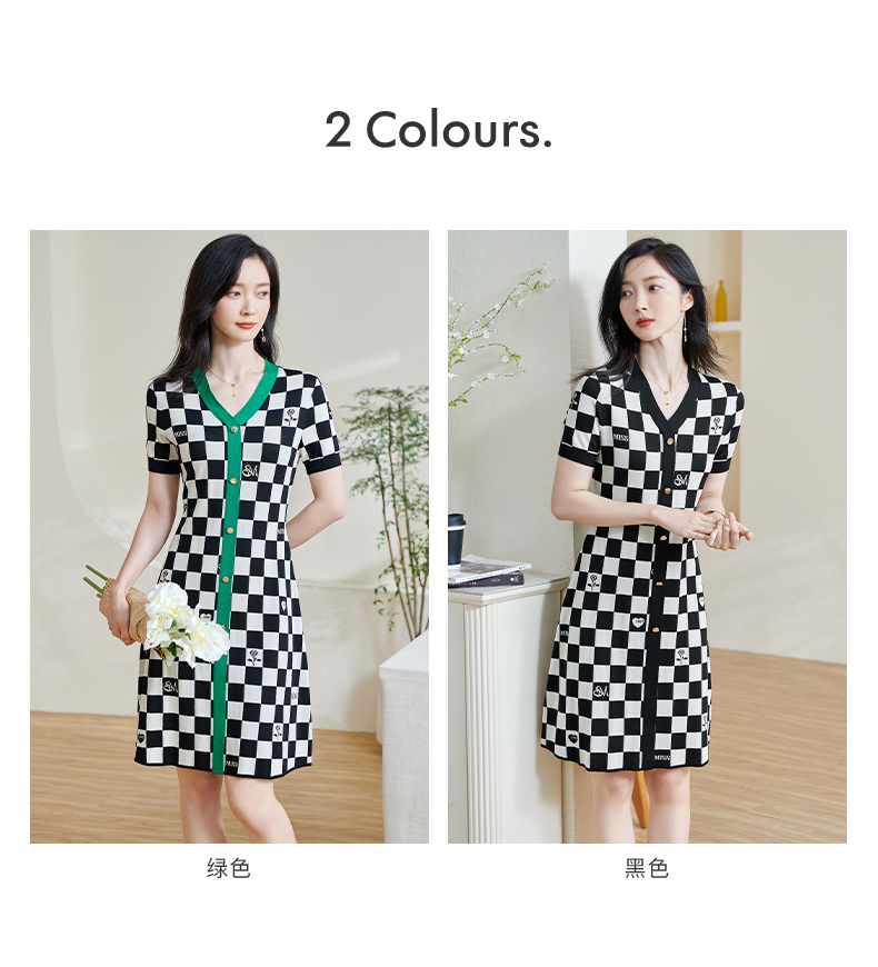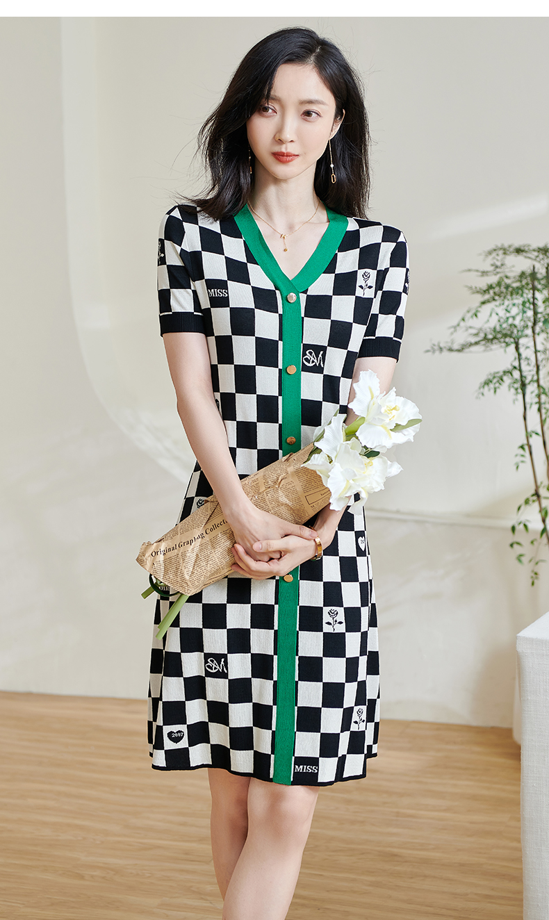 米思阳2026春夏新款时尚别致拼接连衣裙棋盘格弹力针织a字裙0571