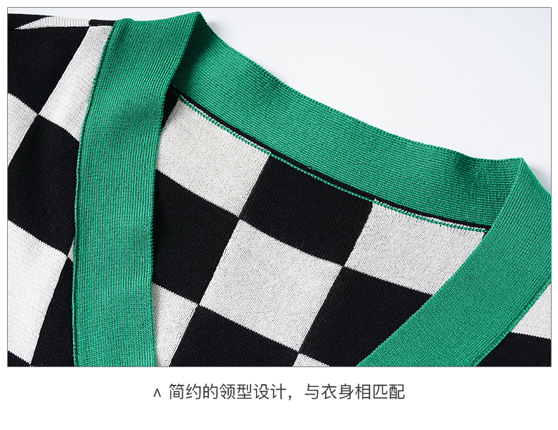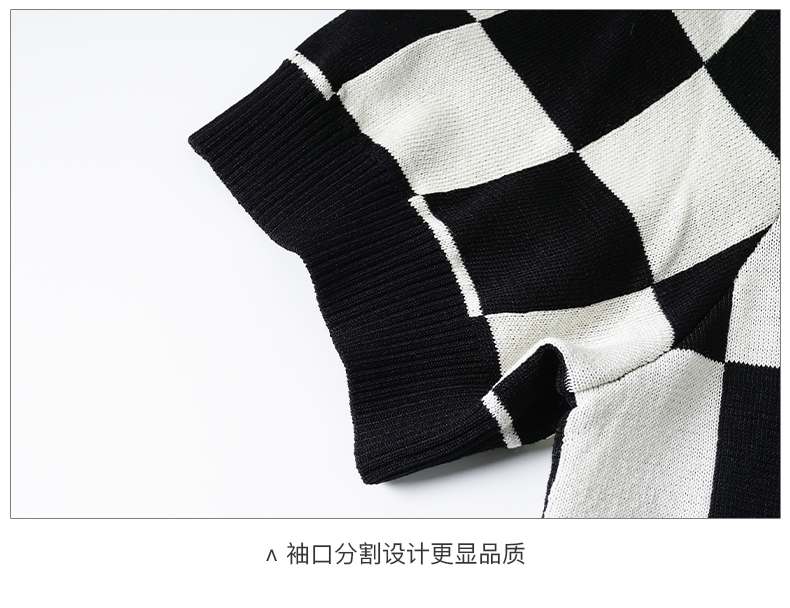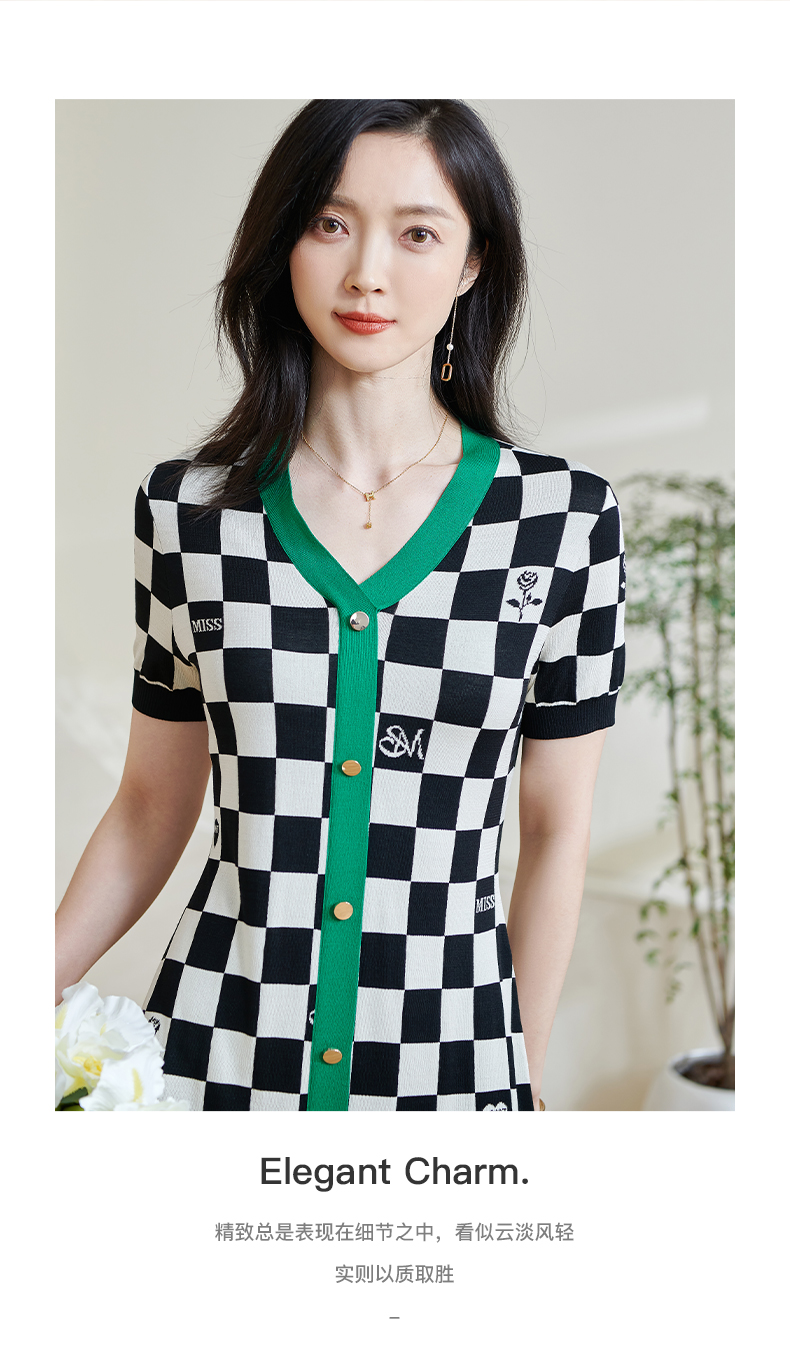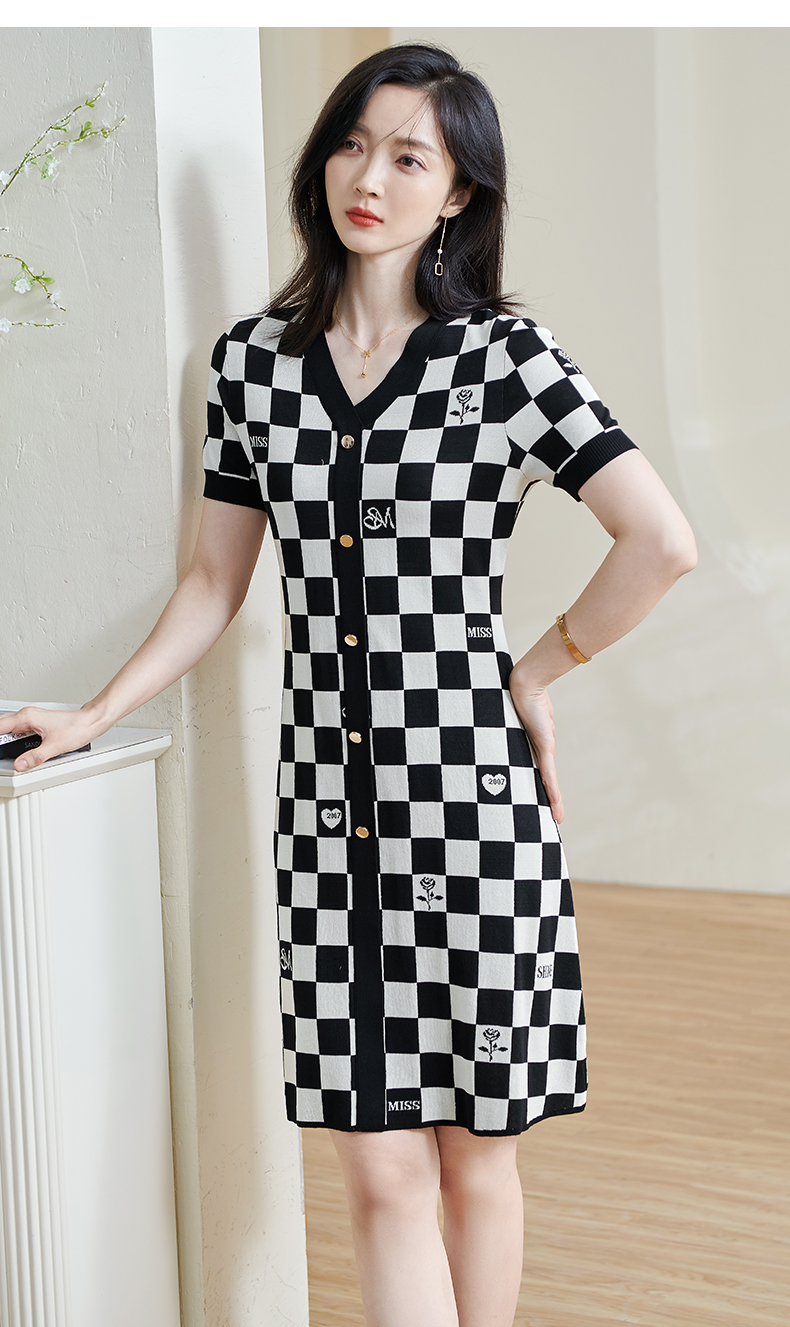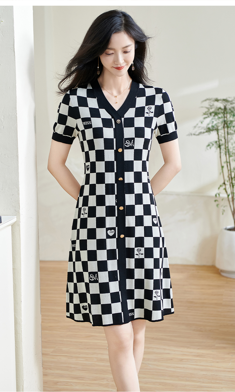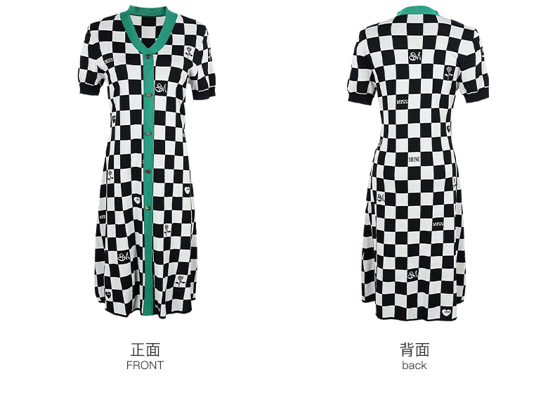 米思阳2026春夏新款时尚别致拼接连衣裙棋盘格弹力针织a字裙0571