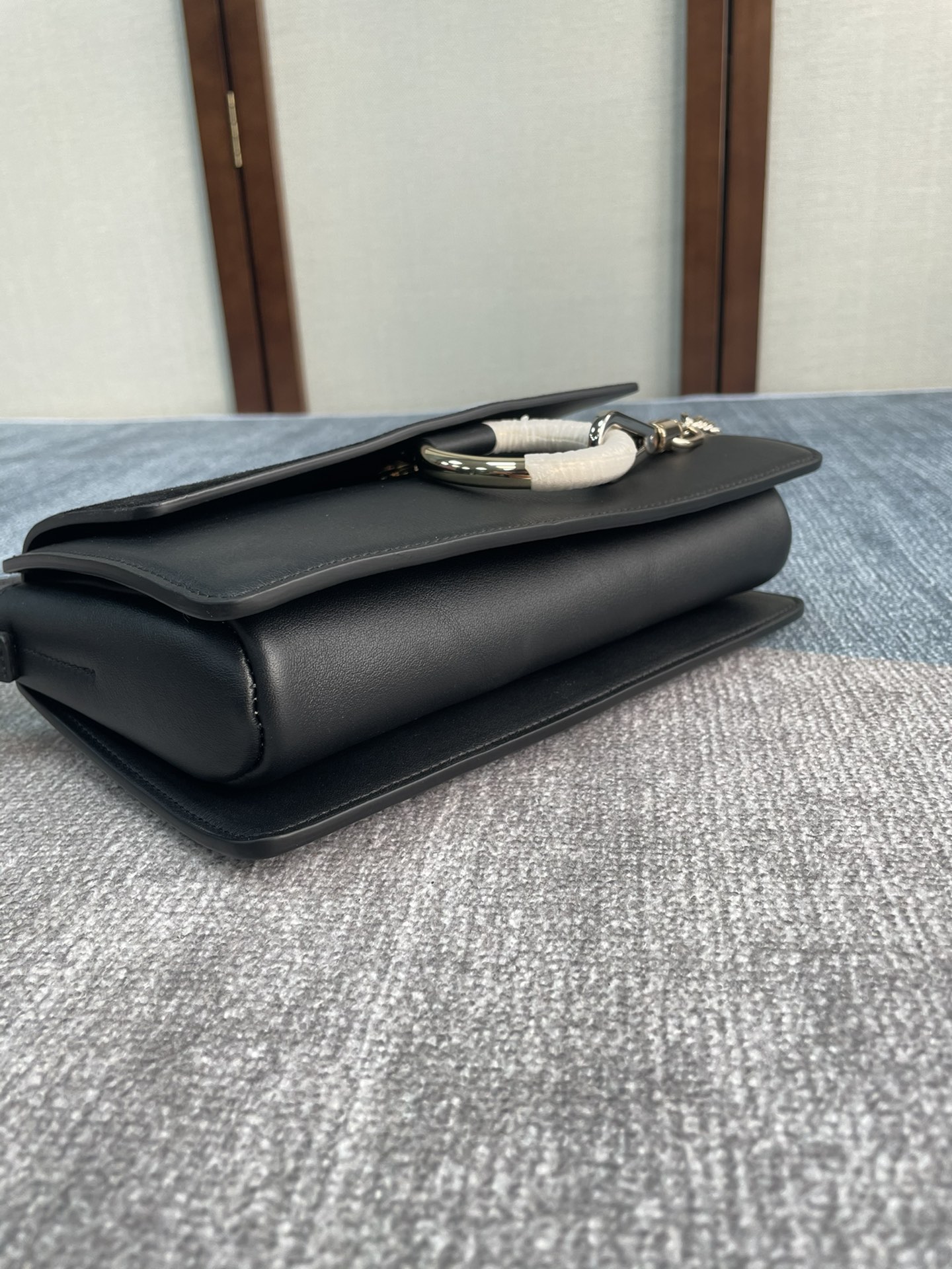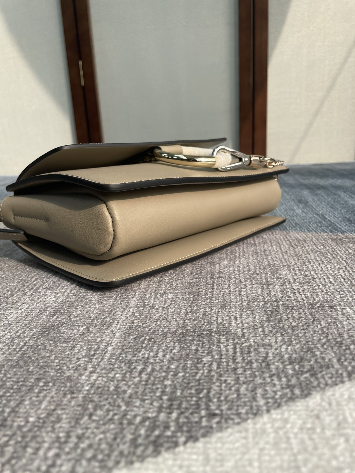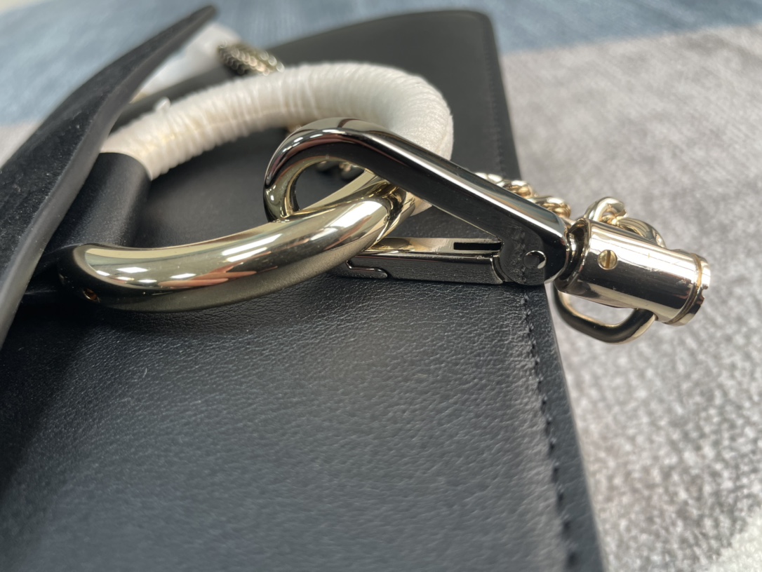 手袋随性自然 简洁的梯形包 ,配上大圈双色金属环和金属链,五金由金 银色双搭配链条扣组合而成,刮起了一股纯净复古时髦风