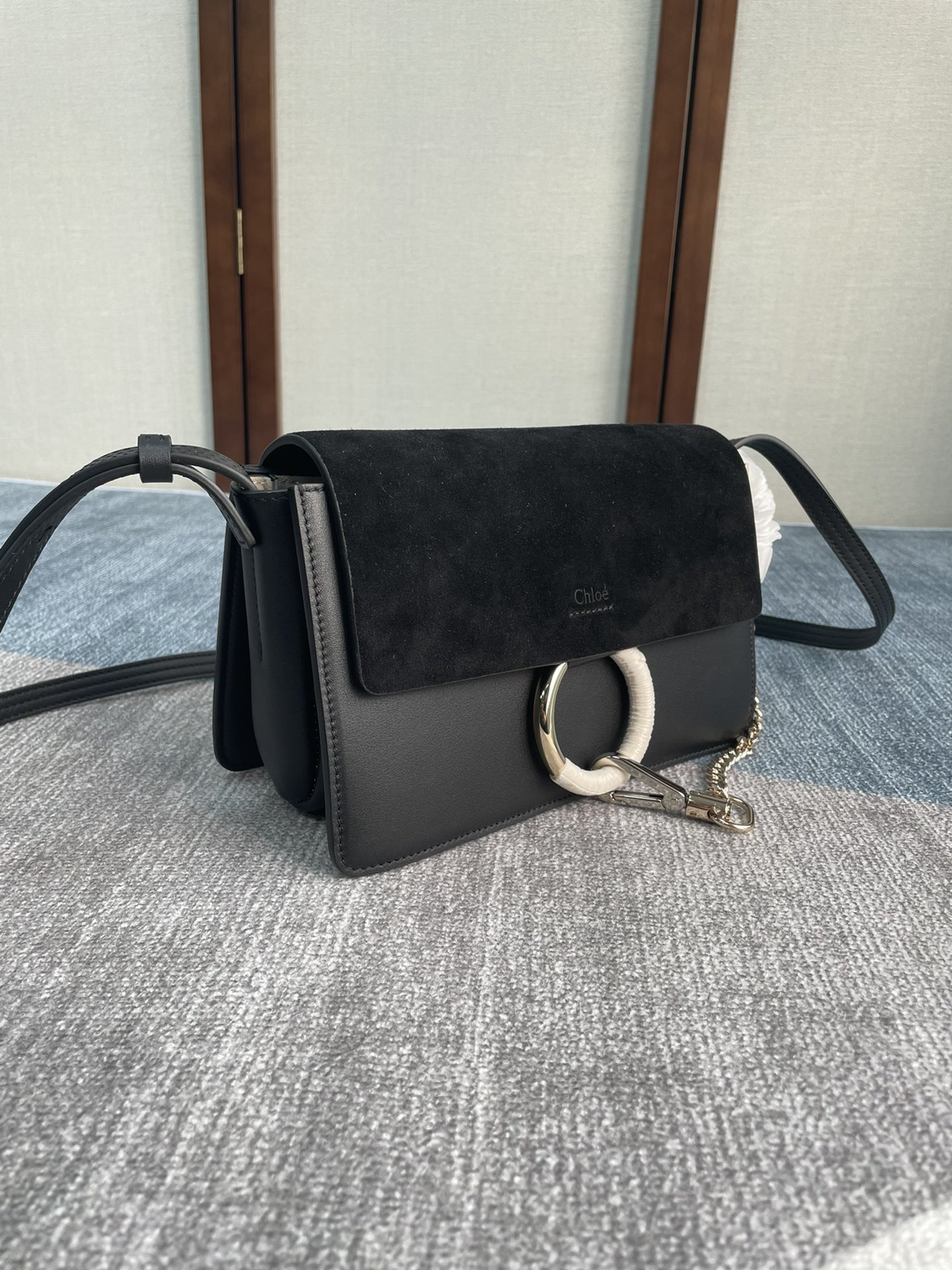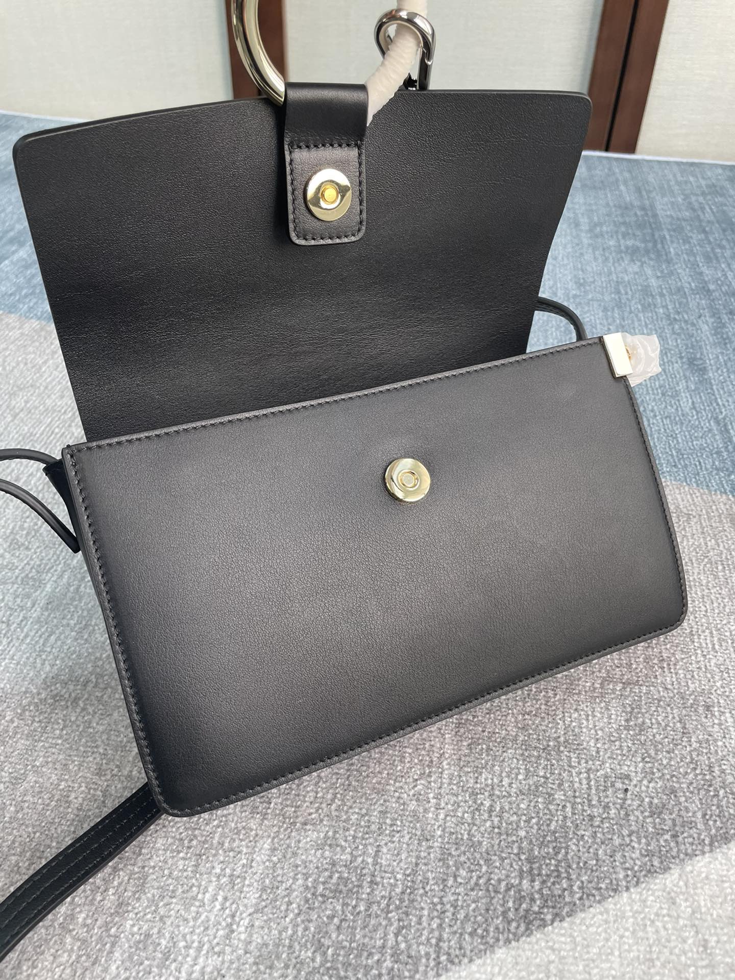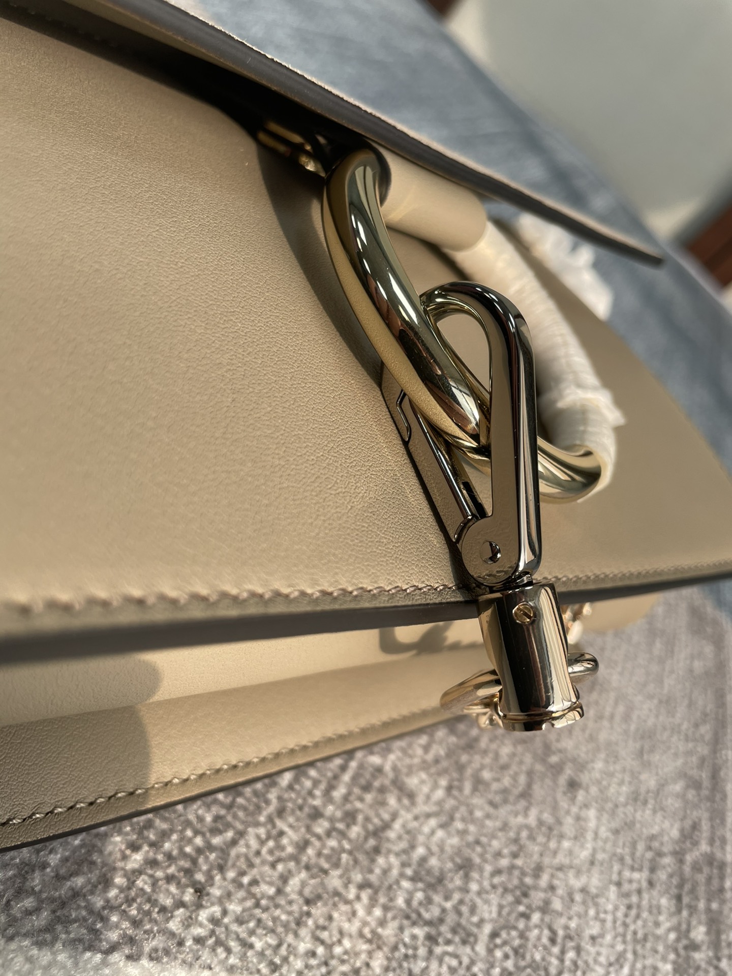 手袋随性自然 简洁的梯形包 ,配上大圈双色金属环和金属链,五金由金 银色双搭配链条扣组合而成,刮起了一股纯净复古时髦风