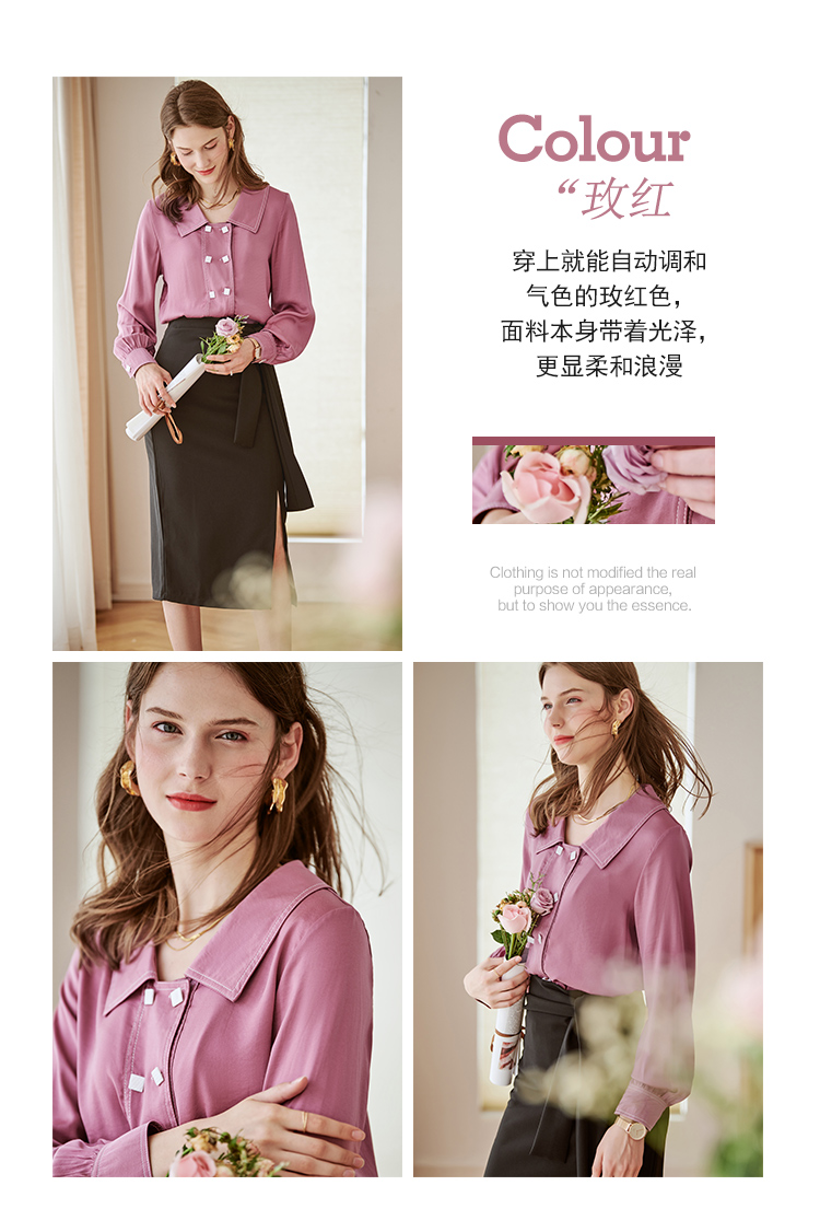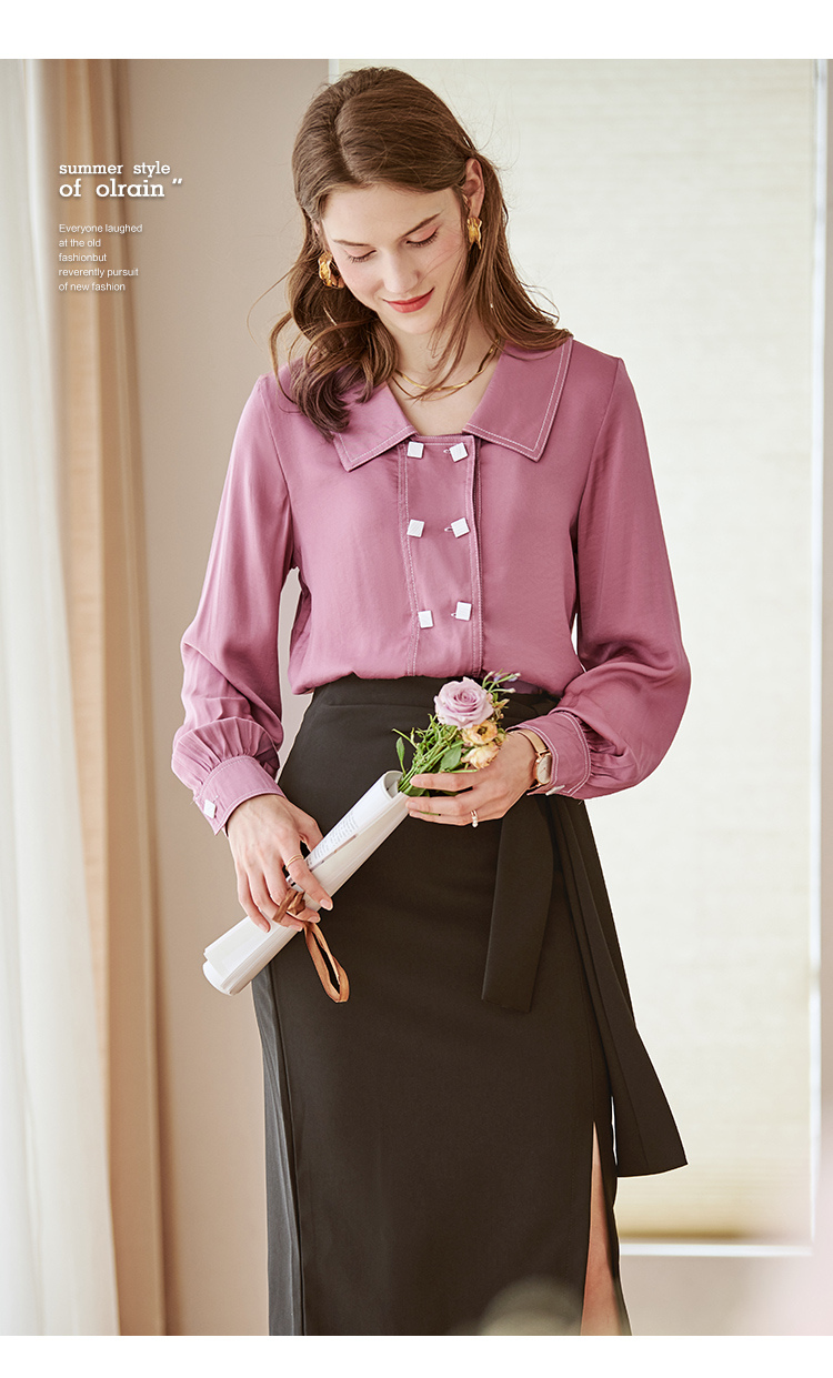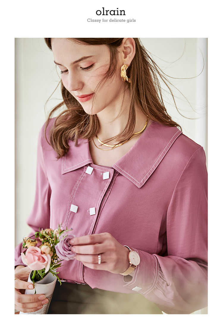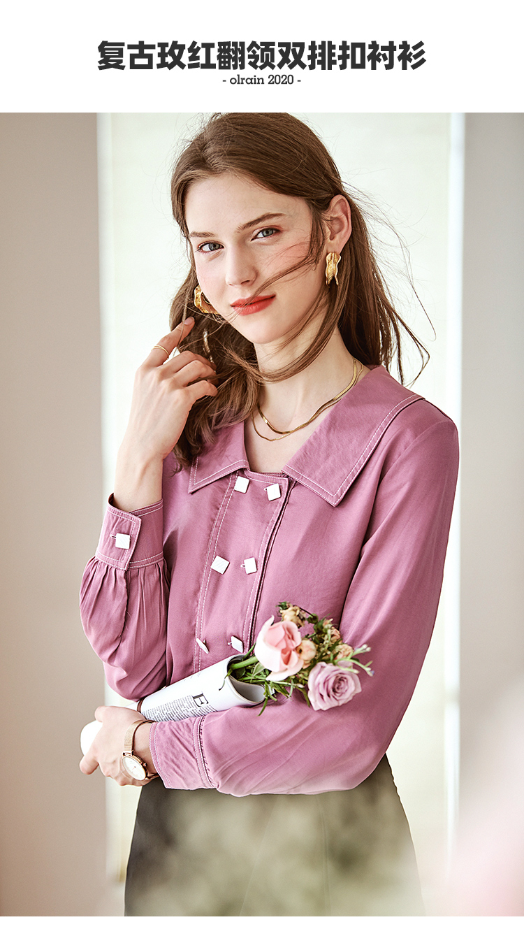 欧芮儿长袖衬衫女新款韩版百搭玫红色衬衣设计感小众上衣