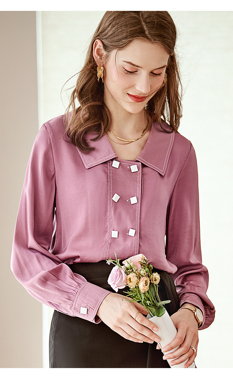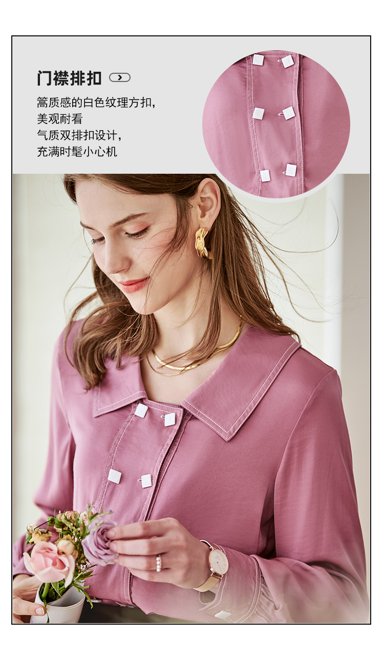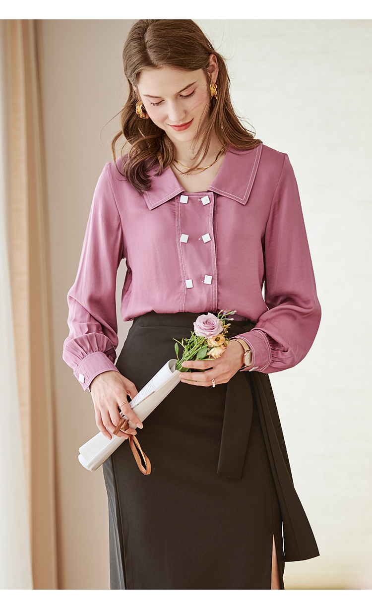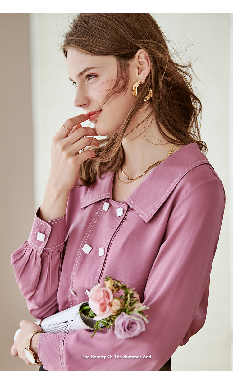 欧芮儿长袖衬衫女新款韩版百搭玫红色衬衣设计感小众上衣