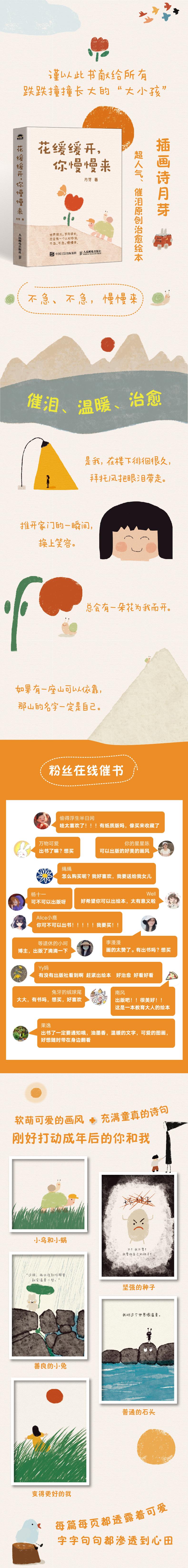 1.治愈漫画:作者插画诗月芽擅长在童话般的故事中描绘现实的温暖,她的作品线条简单、配色温暖,12个直击心灵的故事配上暖萌的插画,如果这个充满钢筋水泥的丛林禁锢了你的内心和灵魂,使你感受不到四季的更迭和万物的可爱,那就打开这本温暖的小书,这世界风景很美,只等你慢慢来欣赏。 2.个人成长:跌跌撞撞长大的大小孩,你还好吗?你快乐吗?你的人生有没有为自己而活? “如果有一座山可以依靠,那山的名字一定是自己”,诠释了现实世界中成年人的脆弱和心酸,充满着成年人破碎后的自愈和思考。 3.人生哲学:这个时代节奏很快,好像高速运转的列车,花时间去等待、慢慢做一件小事已经是很奢侈的事情了,但是只有等待和慢慢来,我们才能静下心来品尝生命的美好。关于等待、关于自我、关于时间、关于情绪……我们都能从这本暖心的绘本中找到答案和共鸣。