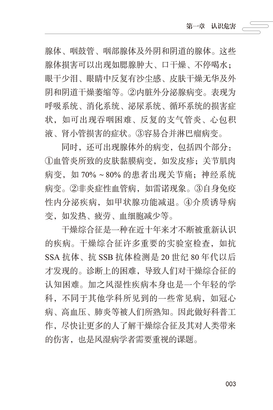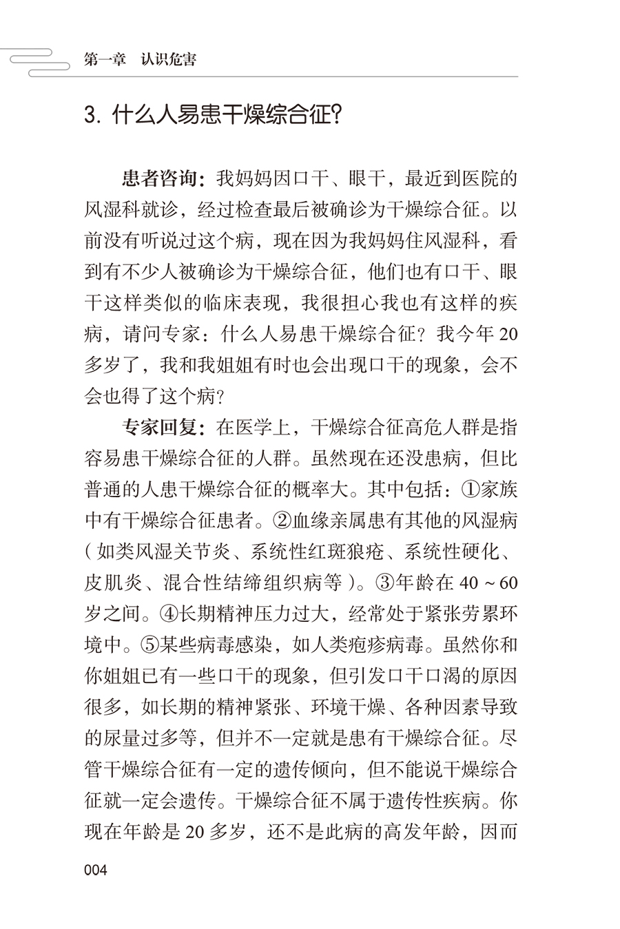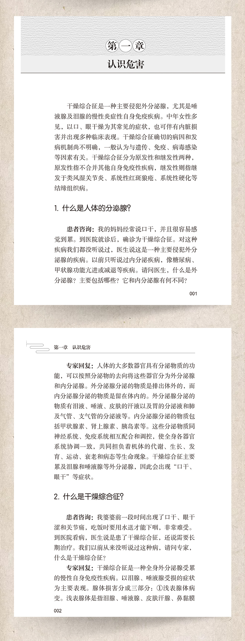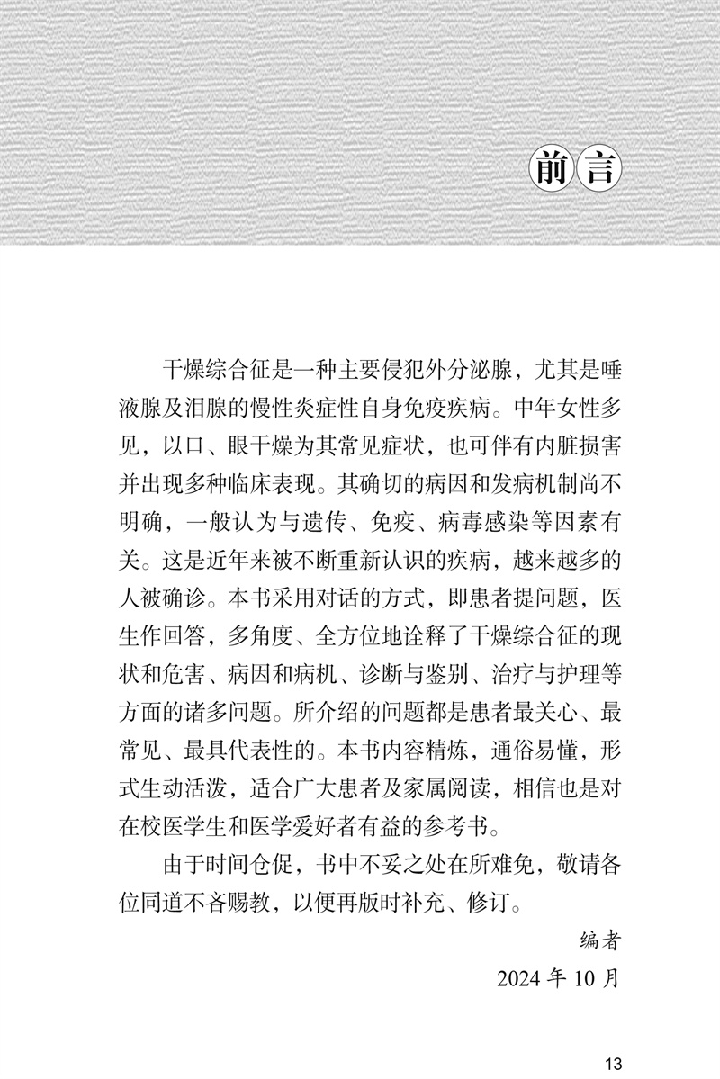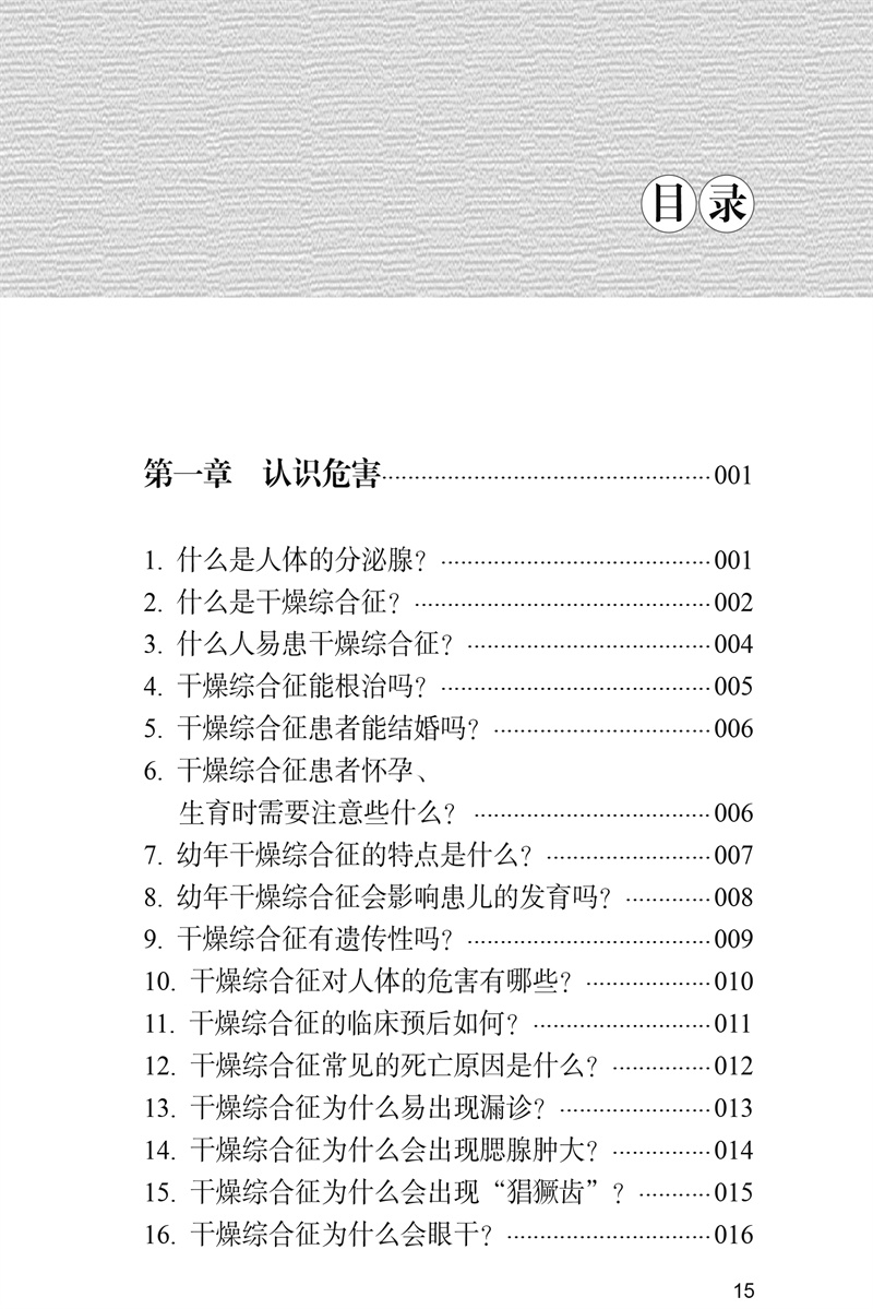 干燥综合征是一种主要侵犯外分泌腺,尤其是唾液腺及泪腺的慢性炎症性自身免疫疾病。中年女性多见,以口、眼干燥为其常见症状,也可伴有内脏损害并出现多种临床表现。其确切的病因和发病机制尚不明确,一般认为与遗传、免疫、病毒感染等因素有关。这是近年来被不断重新认识的疾病,越来越多的人被确诊。本书采用对话的方式,即患者提问题,医生作回答,多角度、全方位地诠释了干燥综合征的现状和危害、病因和病机、诊断与鉴别、治疗与护理等方面的诸多问题。所介绍的问题都是患者最关心、最常见、最具代表性的。 本书内容精炼,通俗易懂,形式生动活泼,适合广大患者及家属阅读,相信也是对在校医学生和医学爱好者有益的参考书。