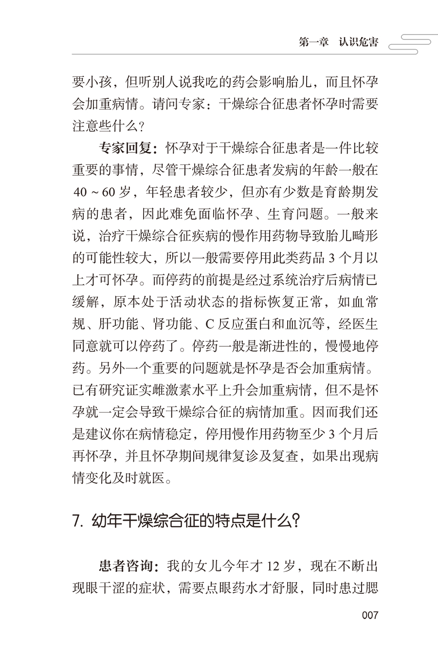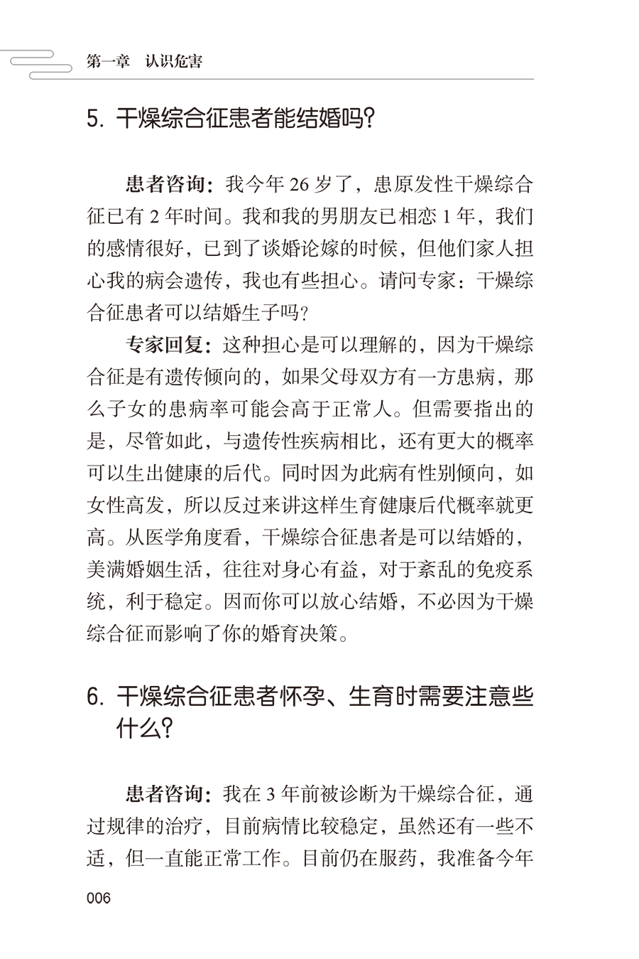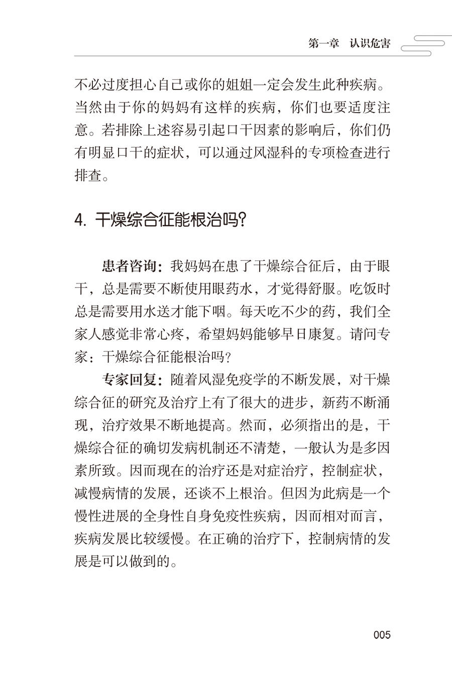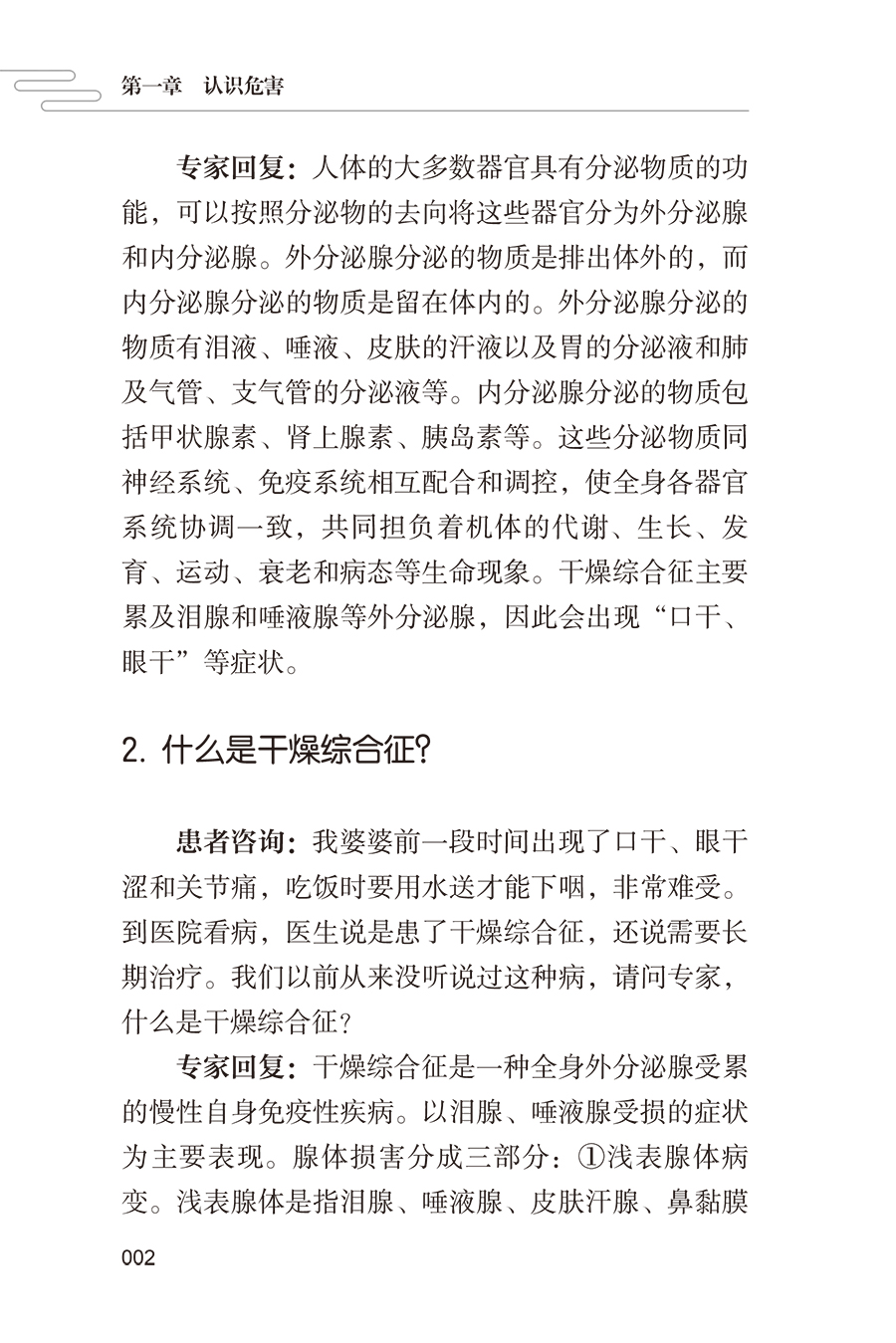 干燥综合征是一种主要侵犯外分泌腺,尤其是唾液腺及泪腺的慢性炎症性自身免疫疾病。中年女性多见,以口、眼干燥为其常见症状,也可伴有内脏损害并出现多种临床表现。其确切的病因和发病机制尚不明确,一般认为与遗传、免疫、病毒感染等因素有关。这是近年来被不断重新认识的疾病,越来越多的人被确诊。本书采用对话的方式,即患者提问题,医生作回答,多角度、全方位地诠释了干燥综合征的现状和危害、病因和病机、诊断与鉴别、治疗与护理等方面的诸多问题。所介绍的问题都是患者最关心、最常见、最具代表性的。 本书内容精炼,通俗易懂,形式生动活泼,适合广大患者及家属阅读,相信也是对在校医学生和医学爱好者有益的参考书。