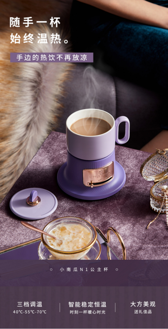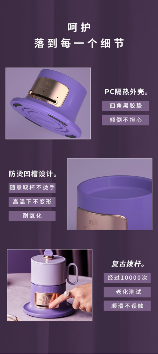 1.送礼和家用或者宿舍都适合的mini暖暖杯,小巧玲珑不占地,方便使用不麻烦。2杯子材质采用优质陶瓷耐热材质,配上高贵的紫色,特显暖暖杯的高贵和贴心,智能恒温、受热均匀。3.杯身和底座分离设计,可直接拿起饮用,更便于清洁。底座拨挡设计,3种档位一目了然,随心选控功能。简洁明了,无需复杂难懂的操作