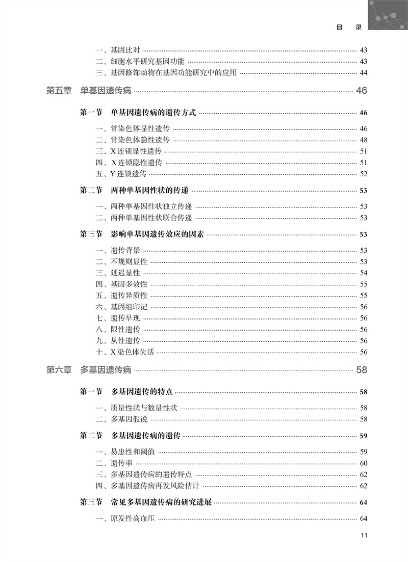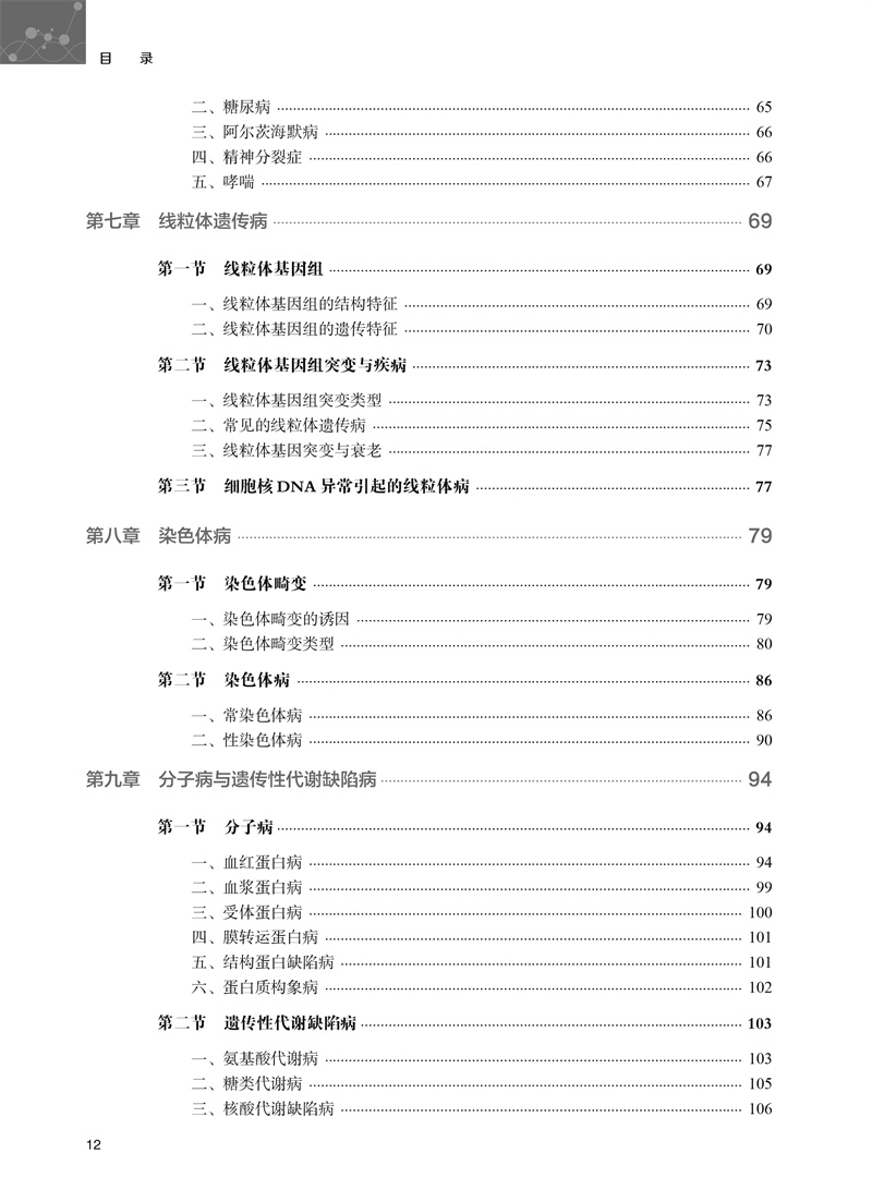 医学遗传学(第6版)内容丰富新颖、科学性强、逻辑性缜密,广泛适用于医学院校五年制不同专业及医学类研究生使用。主要内容包括:医学遗传学概论、遗传的分子基础、遗传的细胞基础、人类基因组学与医学、单基因遗传病、多基因遗传病、线粒体遗传病、染色体病、分子病与先天性代谢缺陷病、群体遗传、肿瘤遗传、免疫遗传、药物遗传、行为遗传、发育遗传、表观遗传、辐射遗传、遗传病的诊断、遗传病的治疗、遗传病的预防及人类疾病的遗传小鼠模型,共21章。