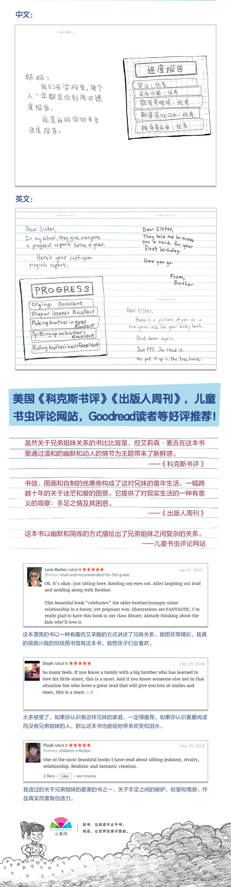 对于这个8岁男孩来说,在妹妹出生之前,生活从来没像现在这么复杂。妹妹出生后,父母便要求他给妹妹写卡片和信件,有时还要附上图画,放在妹妹的宝宝纪念册里。男孩于是真实而幽默地地记录了自己的生活,新生妹妹不停地哭泣,不得不把同一本书给妹妹读了763遍,妹妹戳他的眼睛、揪他的头发,缺乏私人空间······他对这一切表示很沮丧。信里偶尔有几封道歉信,却揭示了父母对他的处境的不理解。然而,在10年的时间里,他写给妹妹的信逐渐反映出他对她的珍爱。他*好的好朋友乔伊搬走时,只有妹妹——一直崇拜他的小女孩,了解他的痛苦。随着情感的增进,他们变得越来越牵挂彼此。作者艾莉森·麦吉基于自己的家庭成长经历,创作了一个二孩相处的温馨、幽默故事。绘者乔·布鲁姆为男孩信里的绘画增添了童趣般的素描,也为故事情节增添了动人的插图。