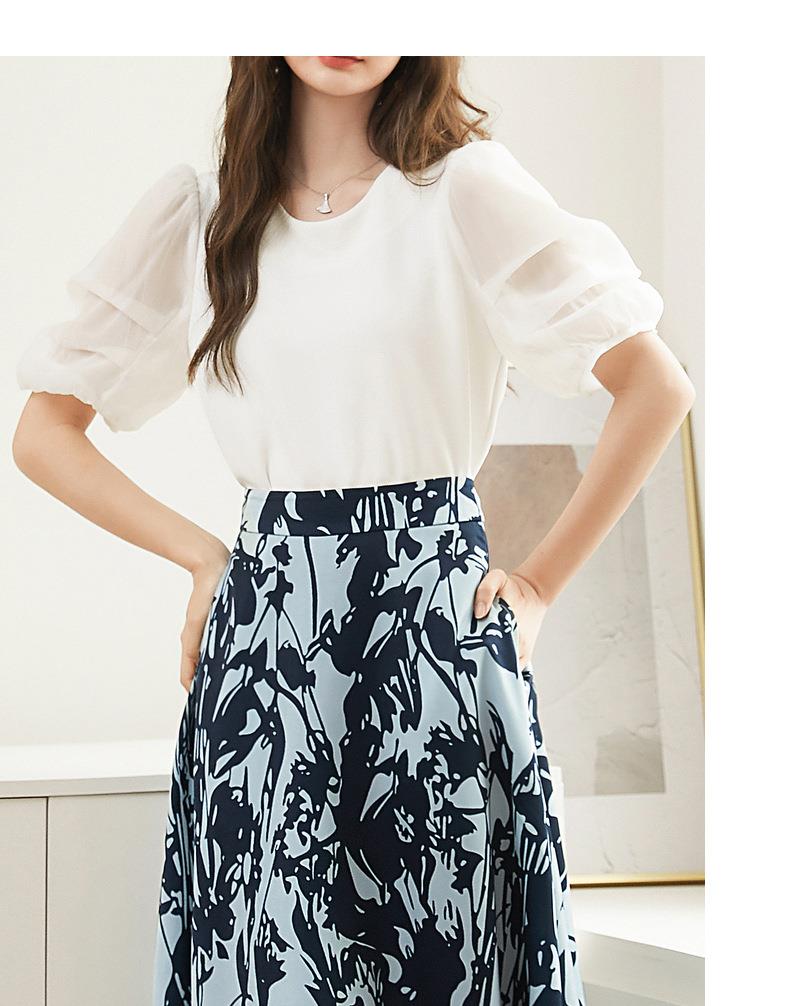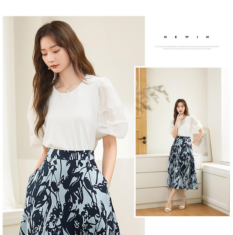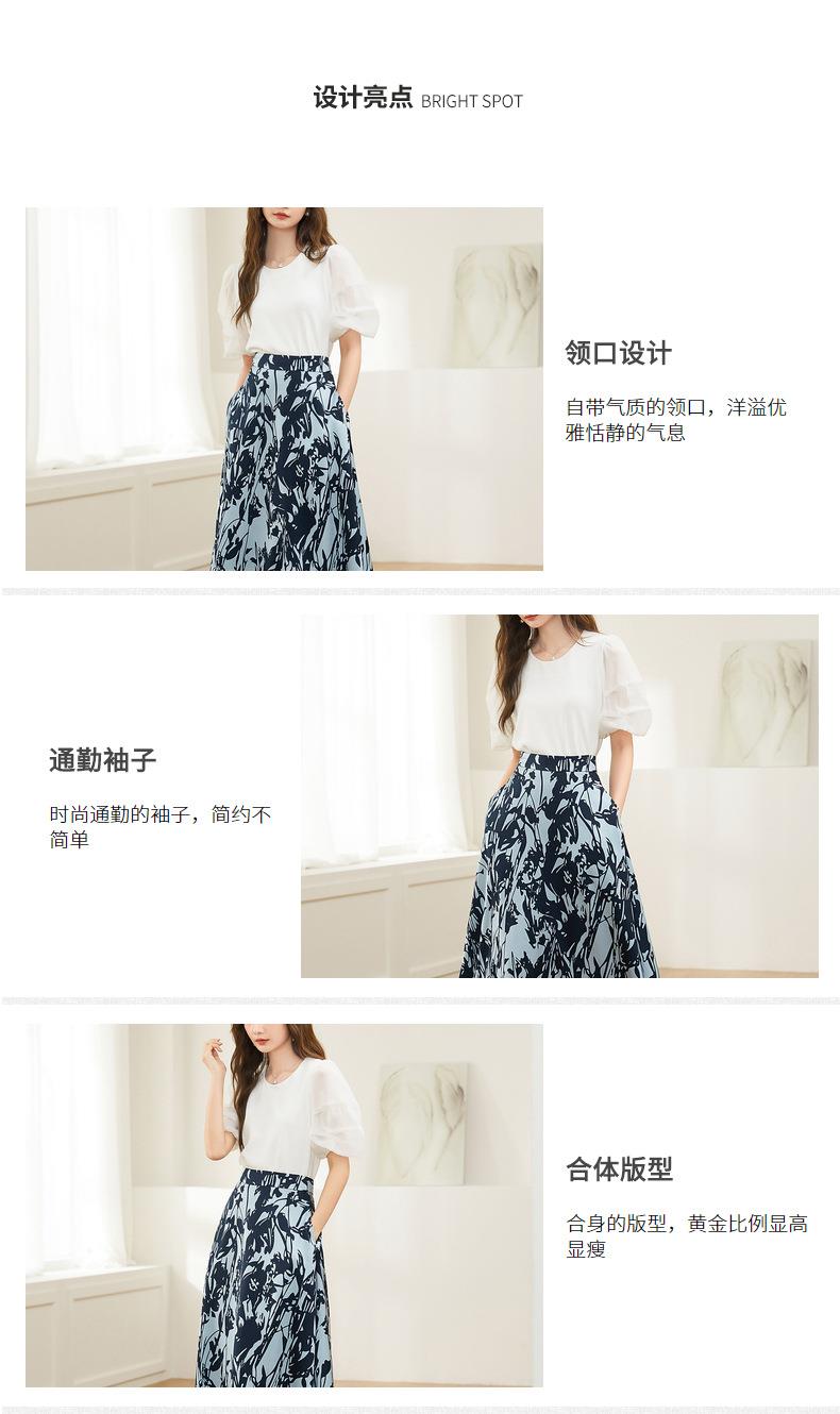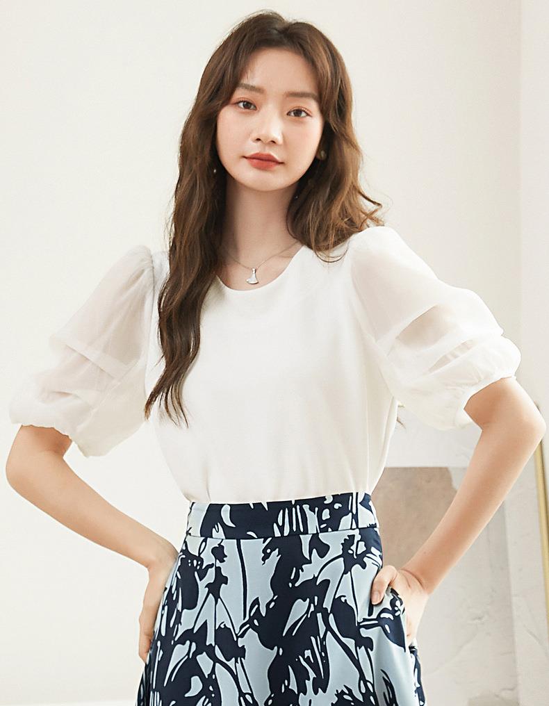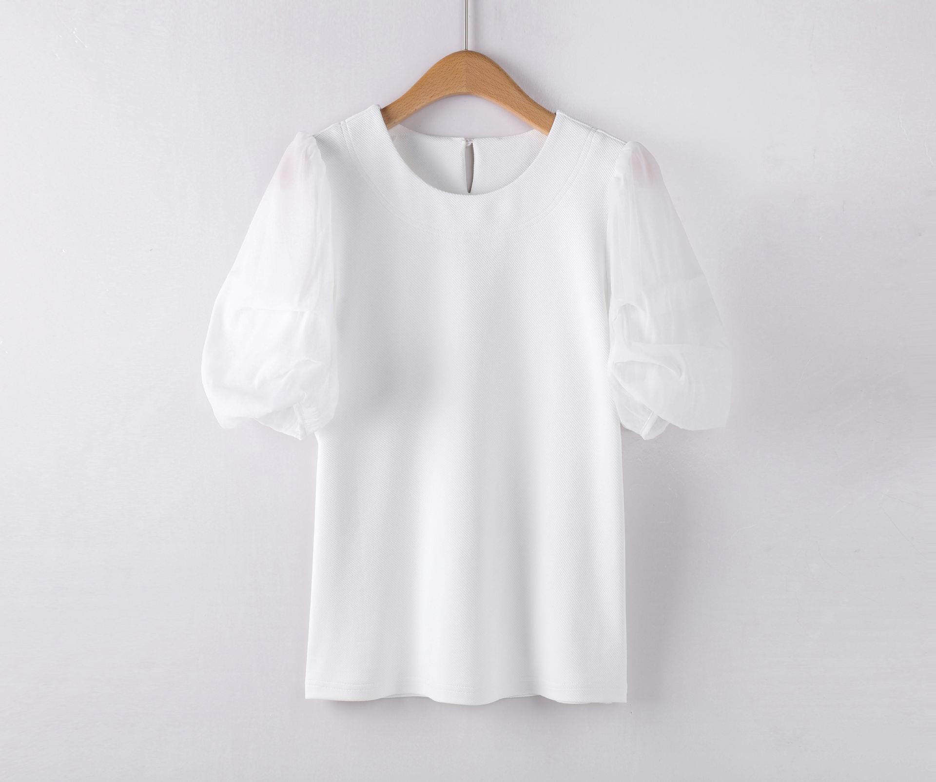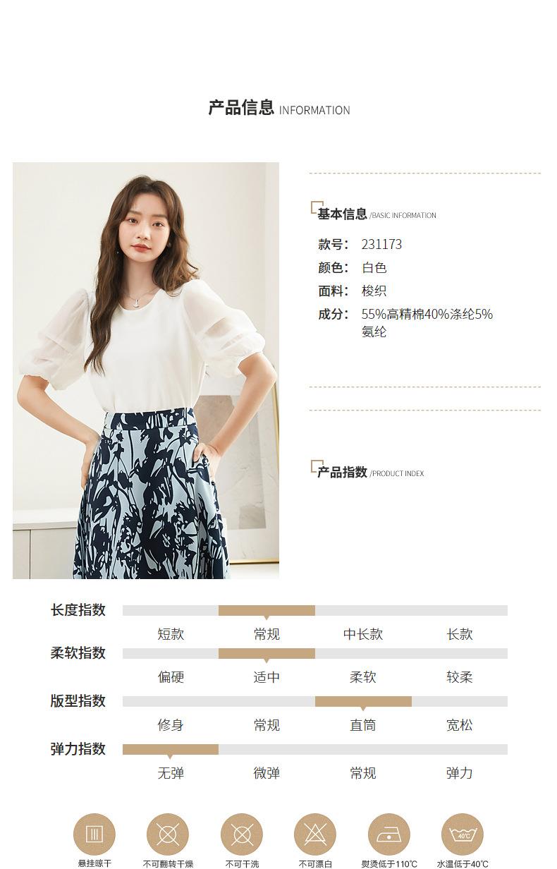 百姿 拼接雪纺短袖衬衫女2023夏季新款圆领简约气质棉小衫231173