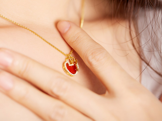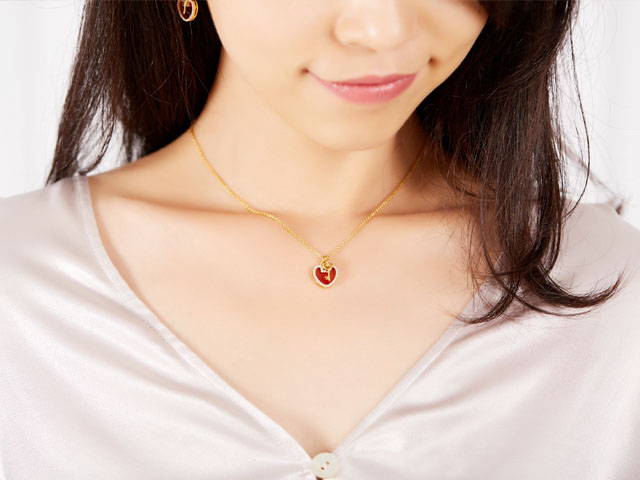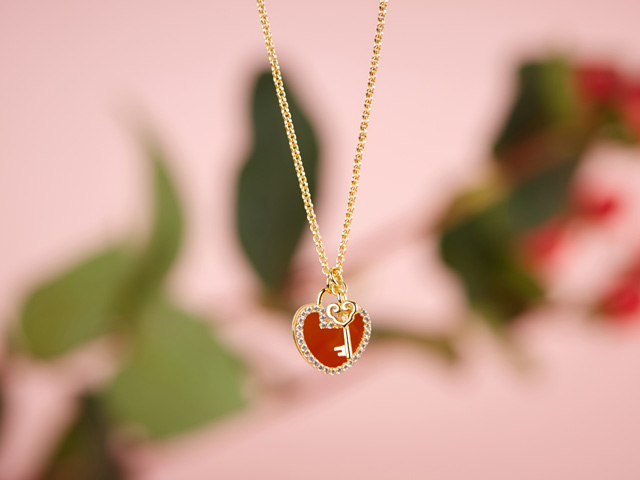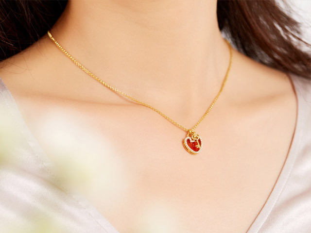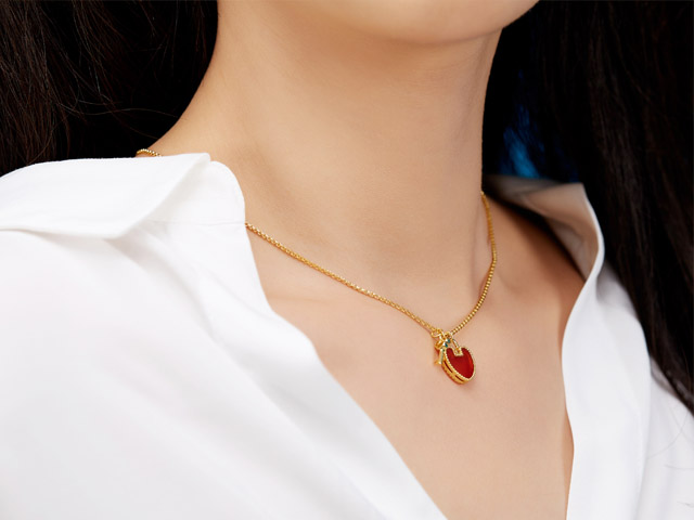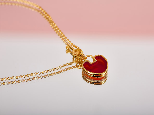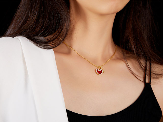 外观整体如一颗红心,灵活的锁扣让它随动作轻轻跳动在胸前,再与如意形态的小钥匙交相呼应,仿若与Ta初见时的怦然心动。