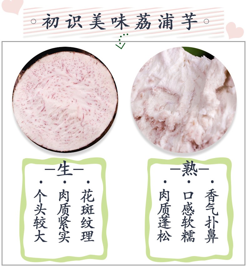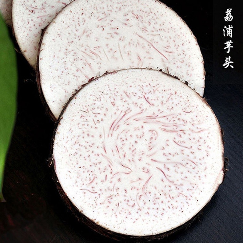产品特点:荔浦芋属于南星科,又叫魁芋,槟榔芋,原为野生芋,是经过野生芋长期的自然选择和人工选育而形成的一个优良品种,个头大,肉质细腻,具有特殊的风味,乃芋中极品,肉质松软,切开芋头可见芋肉布满细小红筋。