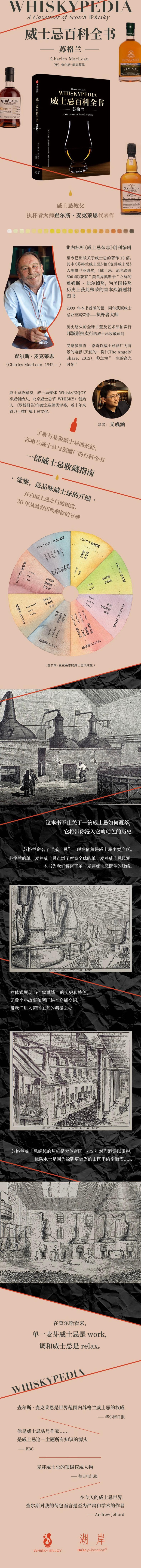书中对苏格兰威士忌的历史、产区、酒标、品鉴方法与风味轮、生产与制作过程进行了详尽介绍和生动描述。展现苏格兰164家蒸馏厂的历史和特色,突出作者觉得有趣的细节,一个个小故事和酒厂秘辛带我们回溯威士忌的发展历程与酒厂生产工艺的流程细节,让我们得以一窥苏格兰威士忌的味道如何在历史长河中被巧妙改变,那些名产区与酒厂的风格又是如何逐步形成的。