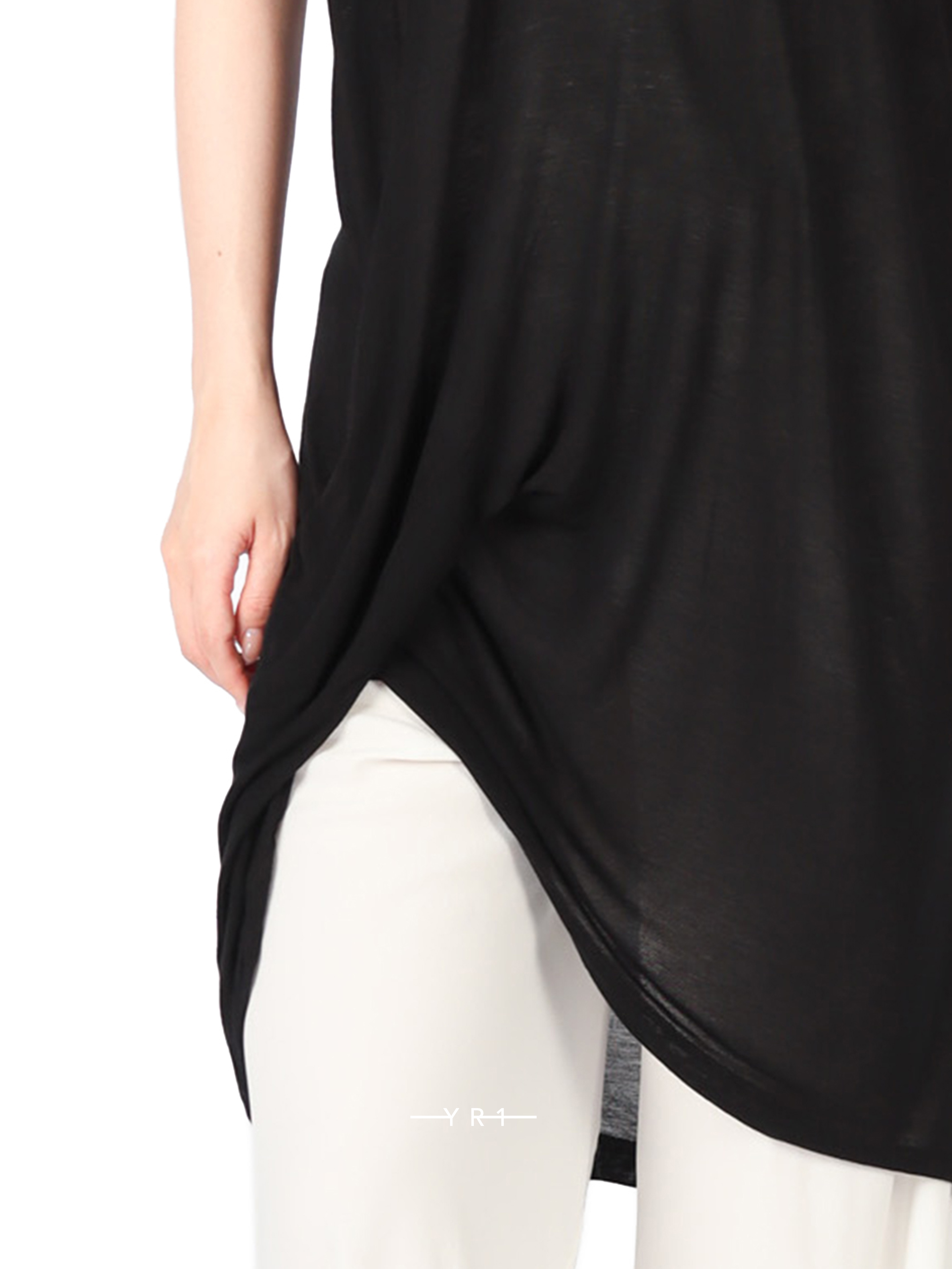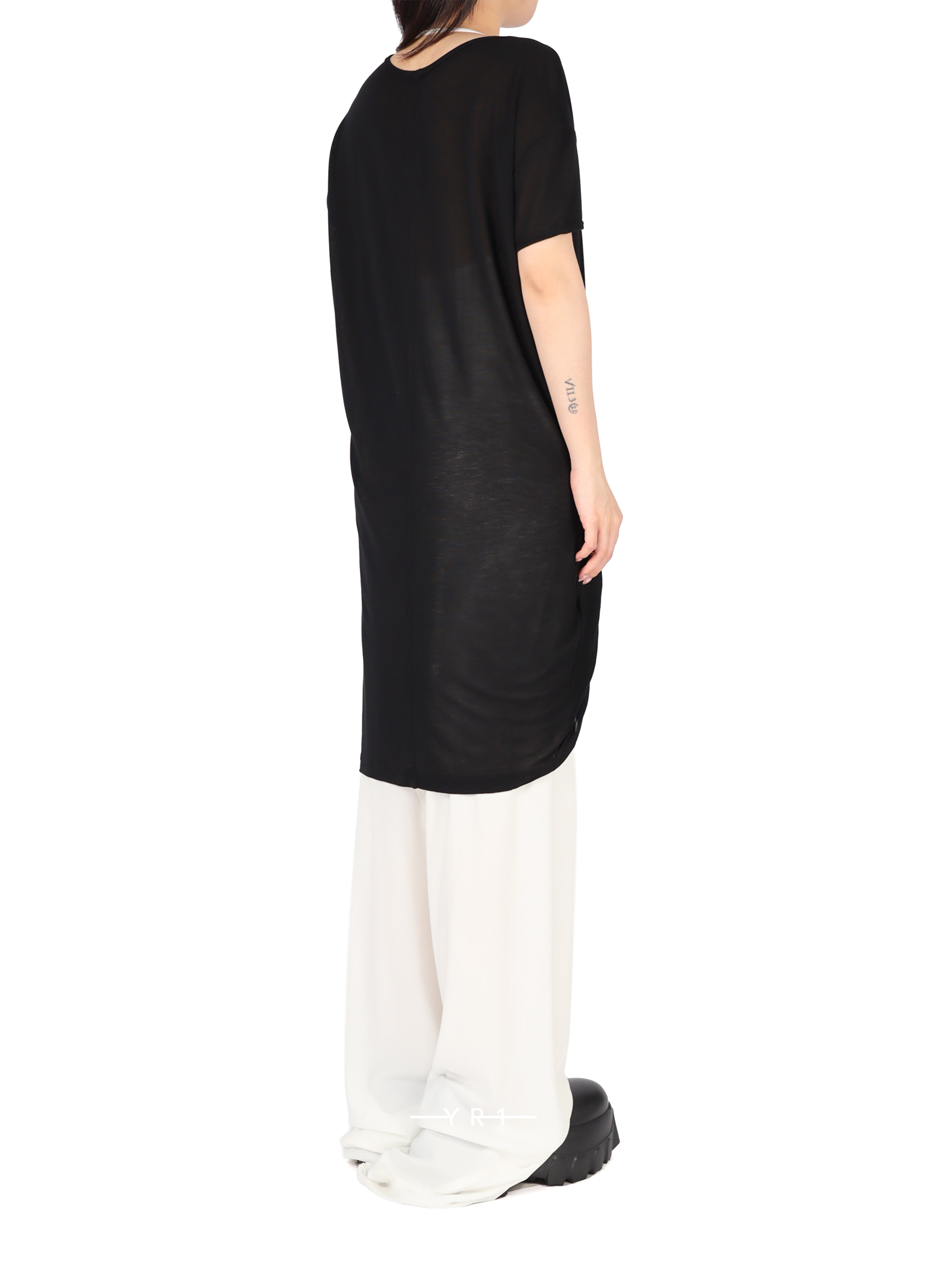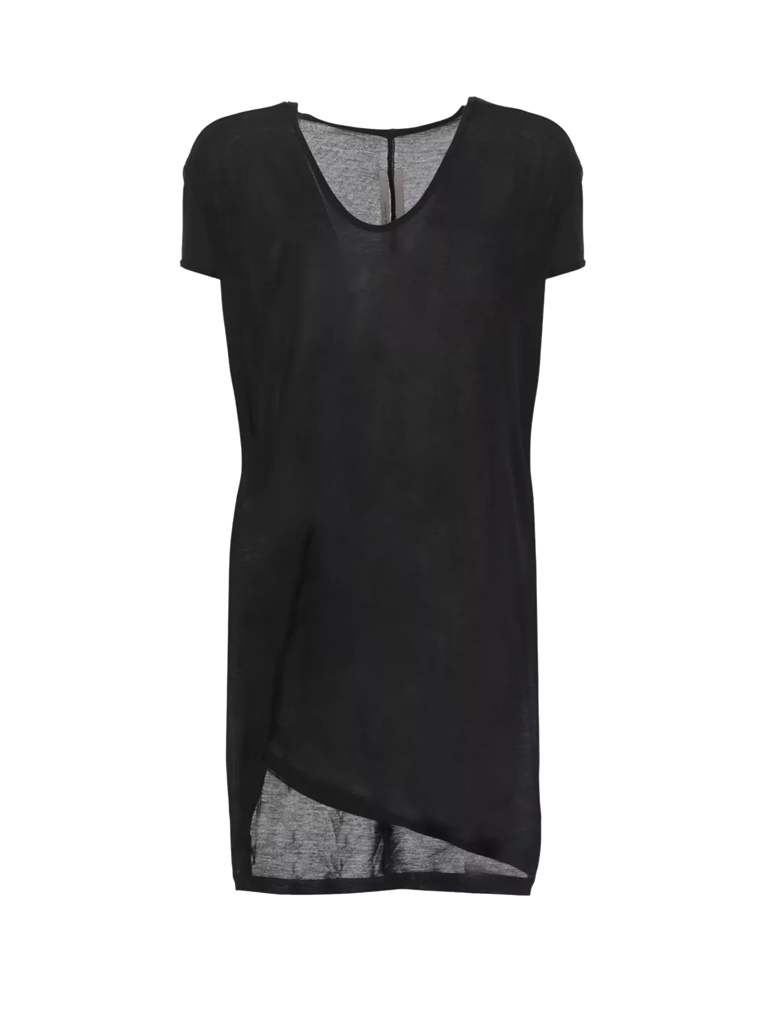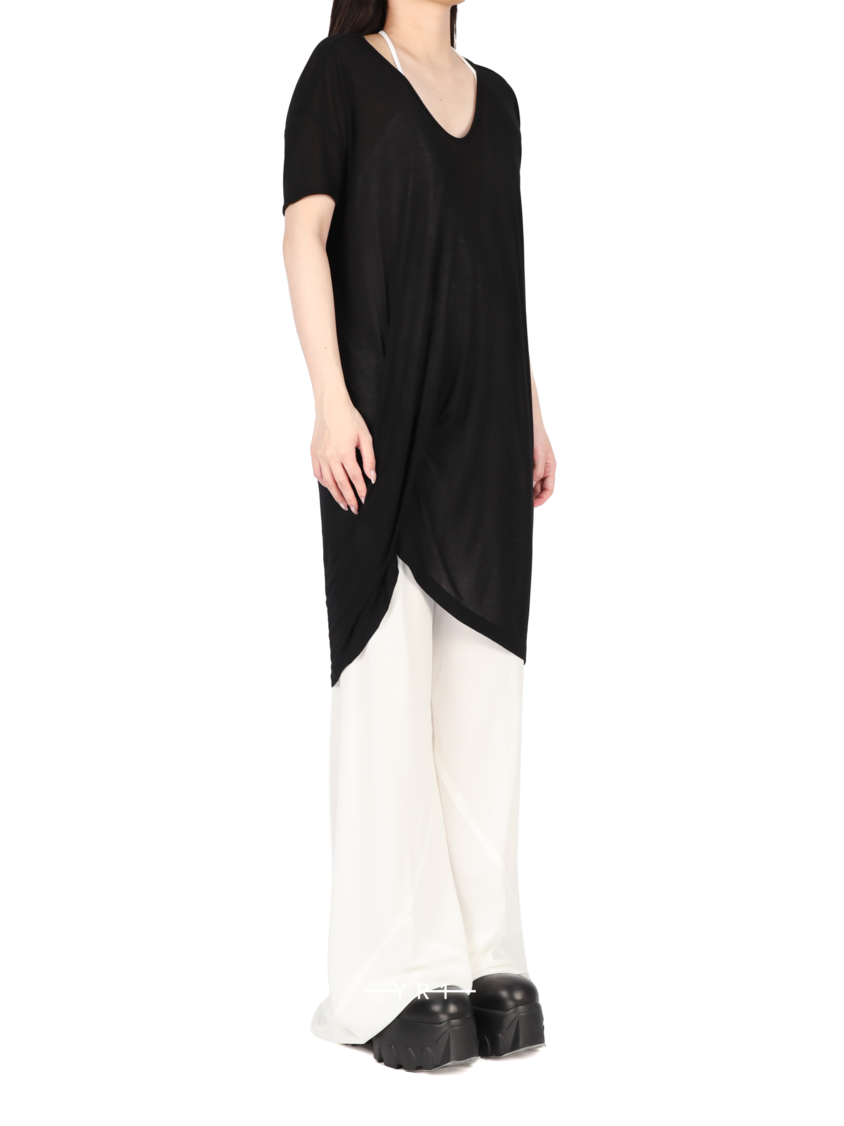 这款高腰T恤长度及臀,宽松版型。它采用柔软的V领设计,短袖,后背中央有一条单缝线。右臀处有褶裥,营造出垂坠感,并形成不对称的下摆。