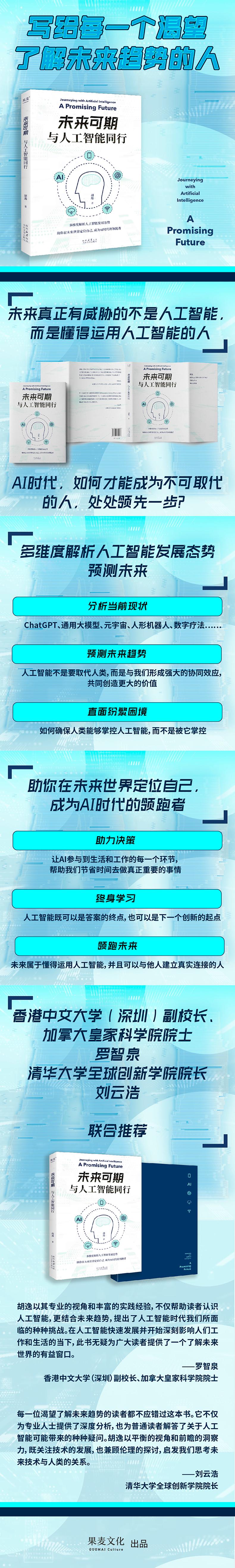 《未来可期:与人工智能同行》是一部探讨人工智能的现在和未来,以及人工智能时代的种种难题的作品集。在ChatGPT横空出世的今天,我们只有了解人工智能,跟上它的脚步,才能不被时代淘汰。家用智能器、数字疗法、具身智能、元宇宙、虚拟人、数字分身……越来越多的新概念已经或即将涌入我们的生活,并切实影响衣食住行的方方面面。作者在书中不仅分析了当前的人工智能发展,更预测在不远的将来,人工智能如何一步步走进和改变我们的生活,如何给我们带来靠前的便利,又如何给我们带来纷繁复杂的困扰。人工智能的发展与人类自身的发展是一体两面的关系。作者真正想要预测的并不是人工智能技术会发展成什么样,而是人类会通过人工智能技术发展成什么样。