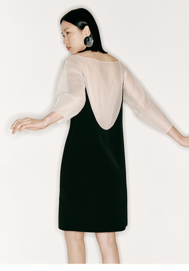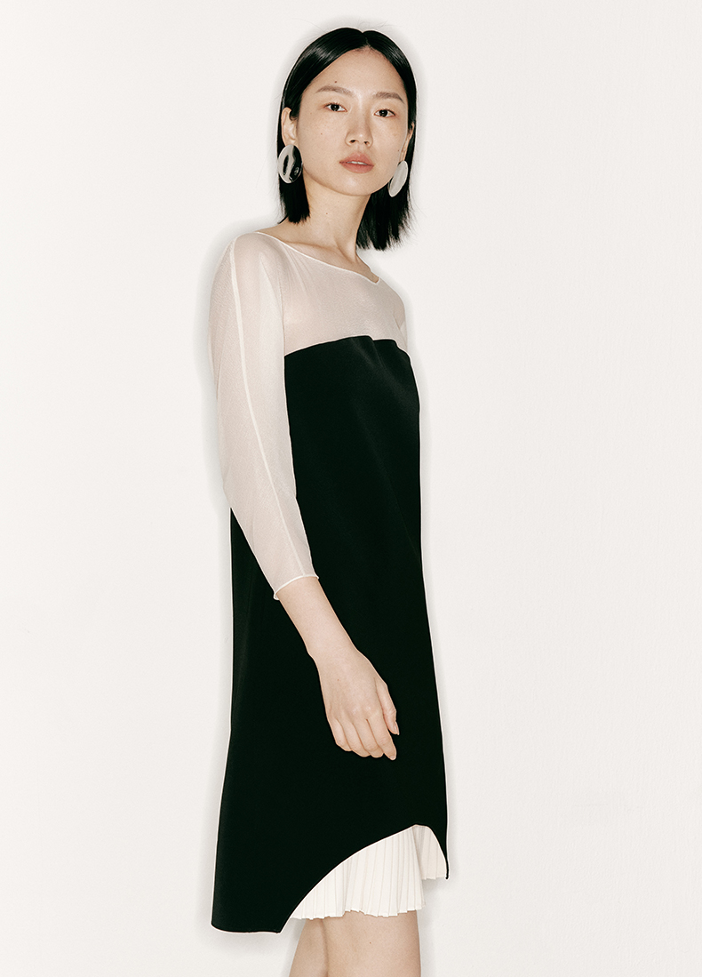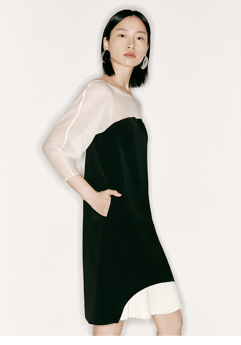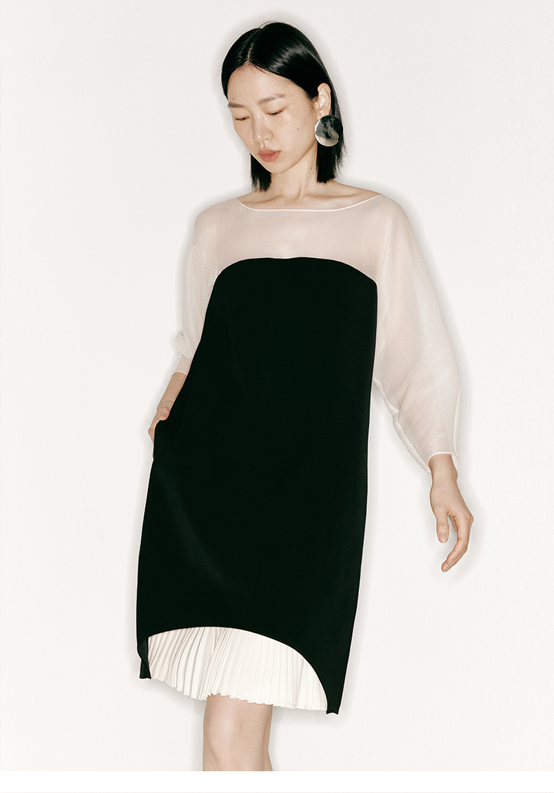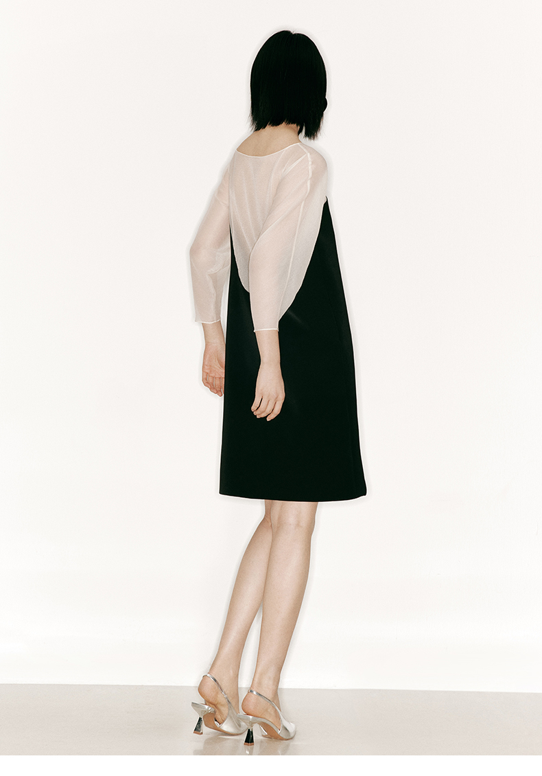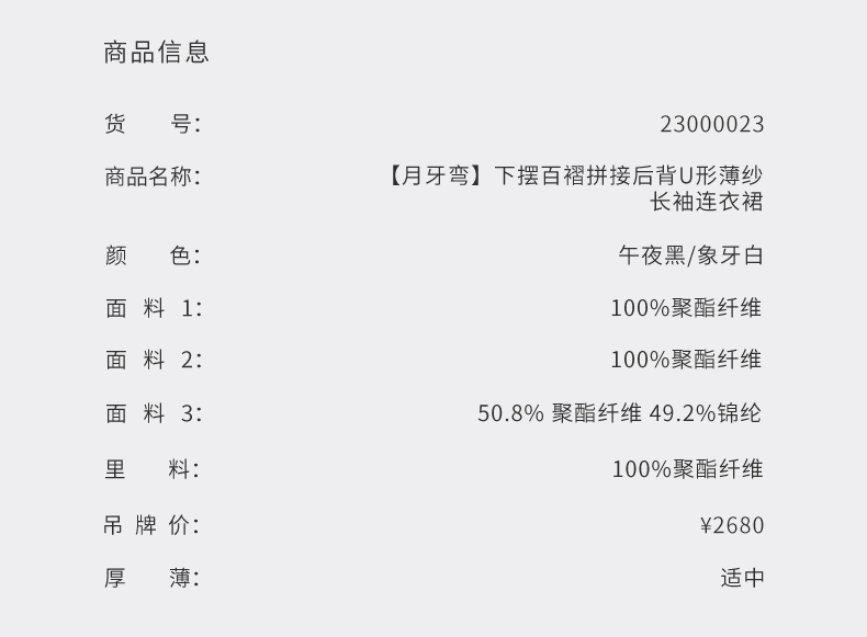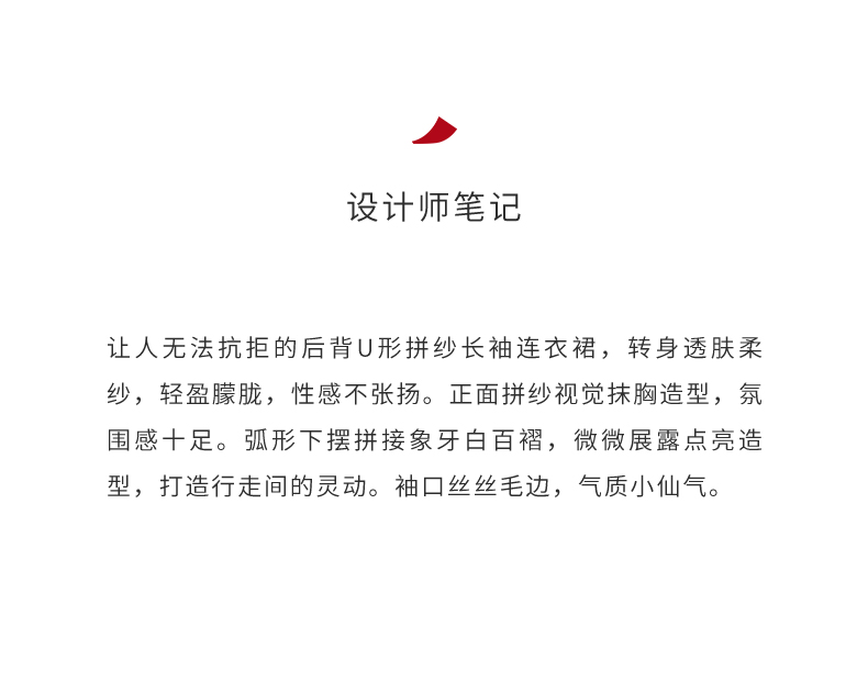 【月牙弯】下摆百褶拼接后背U形薄纱长袖连衣裙/23000023