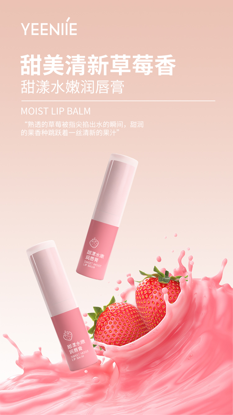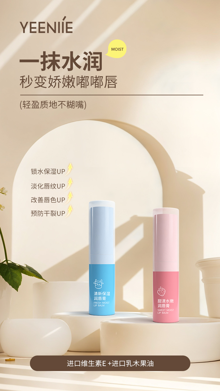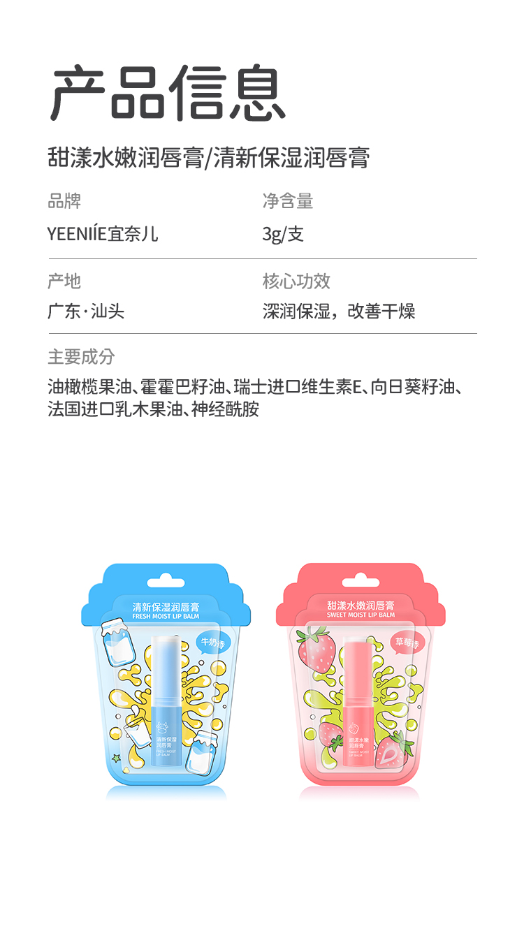 宜奈儿清新保湿润唇膏(牛奶香)甜漾水嫩润(草莓香) 3g(250550-250549)