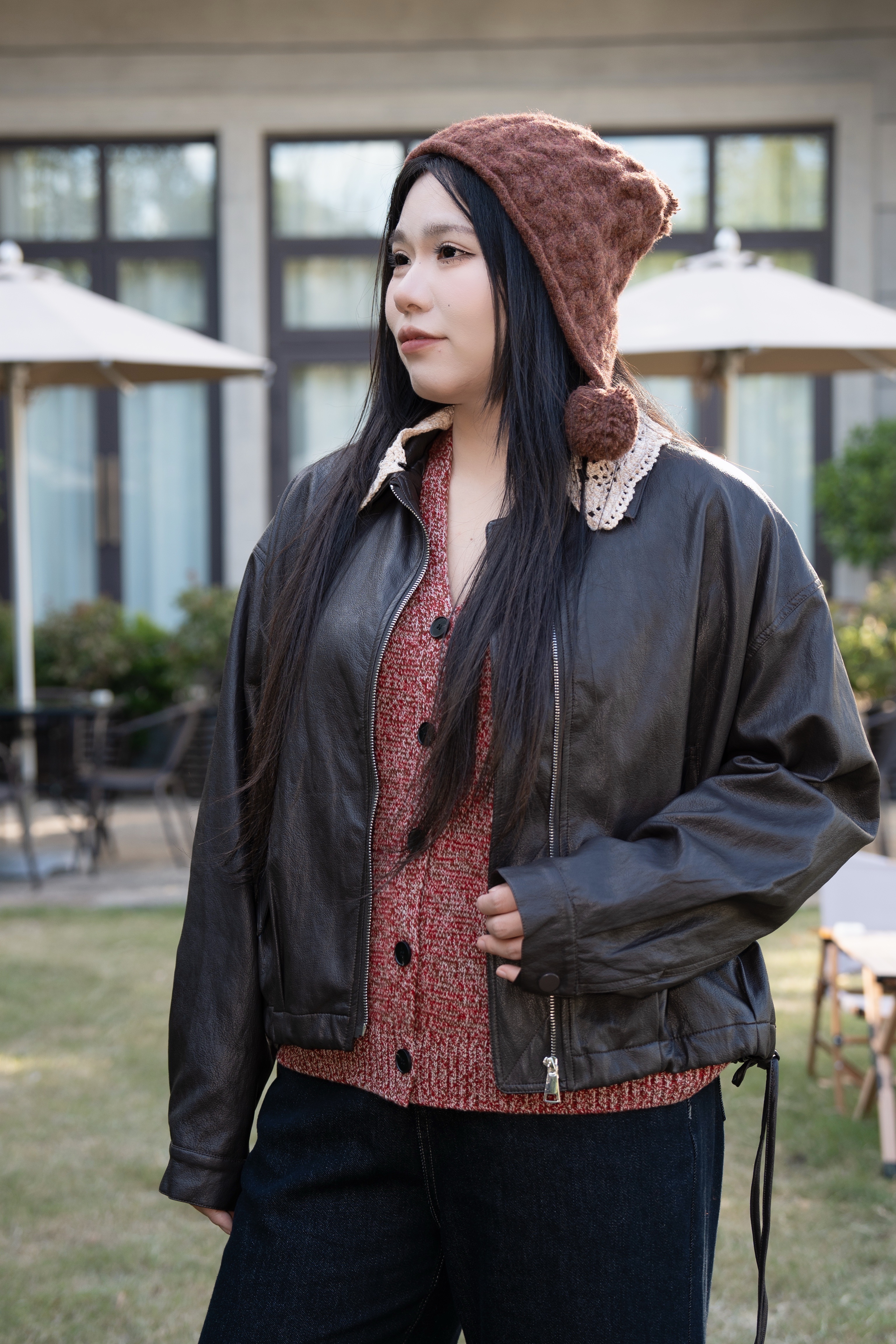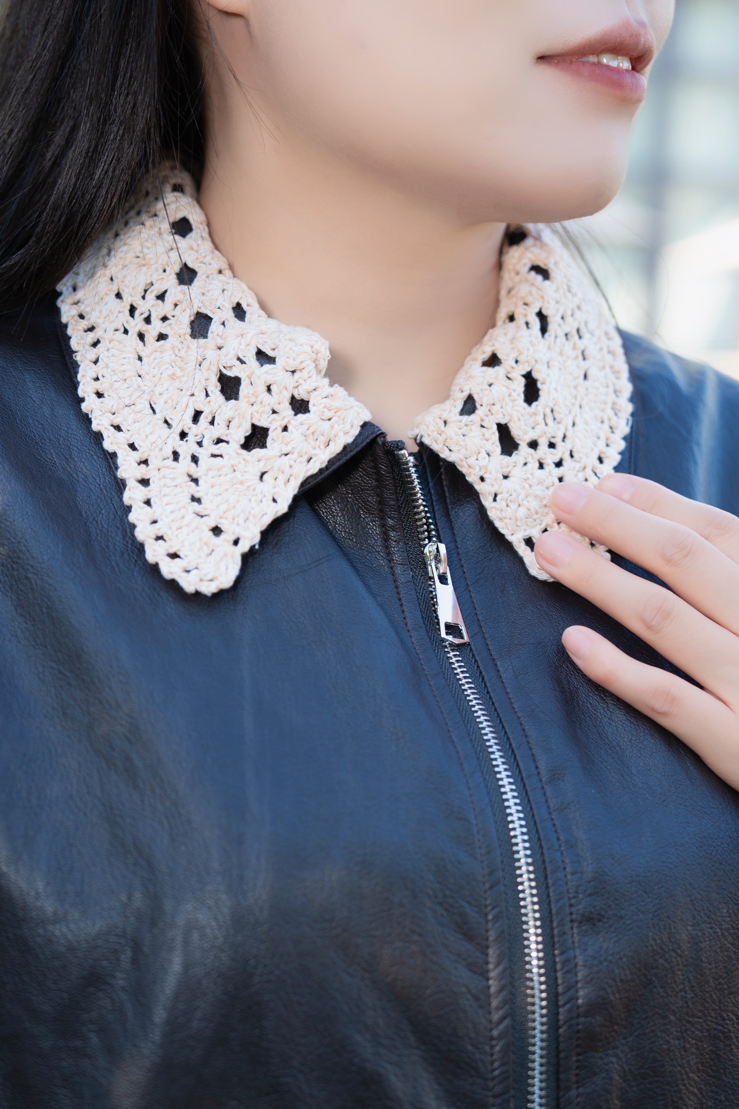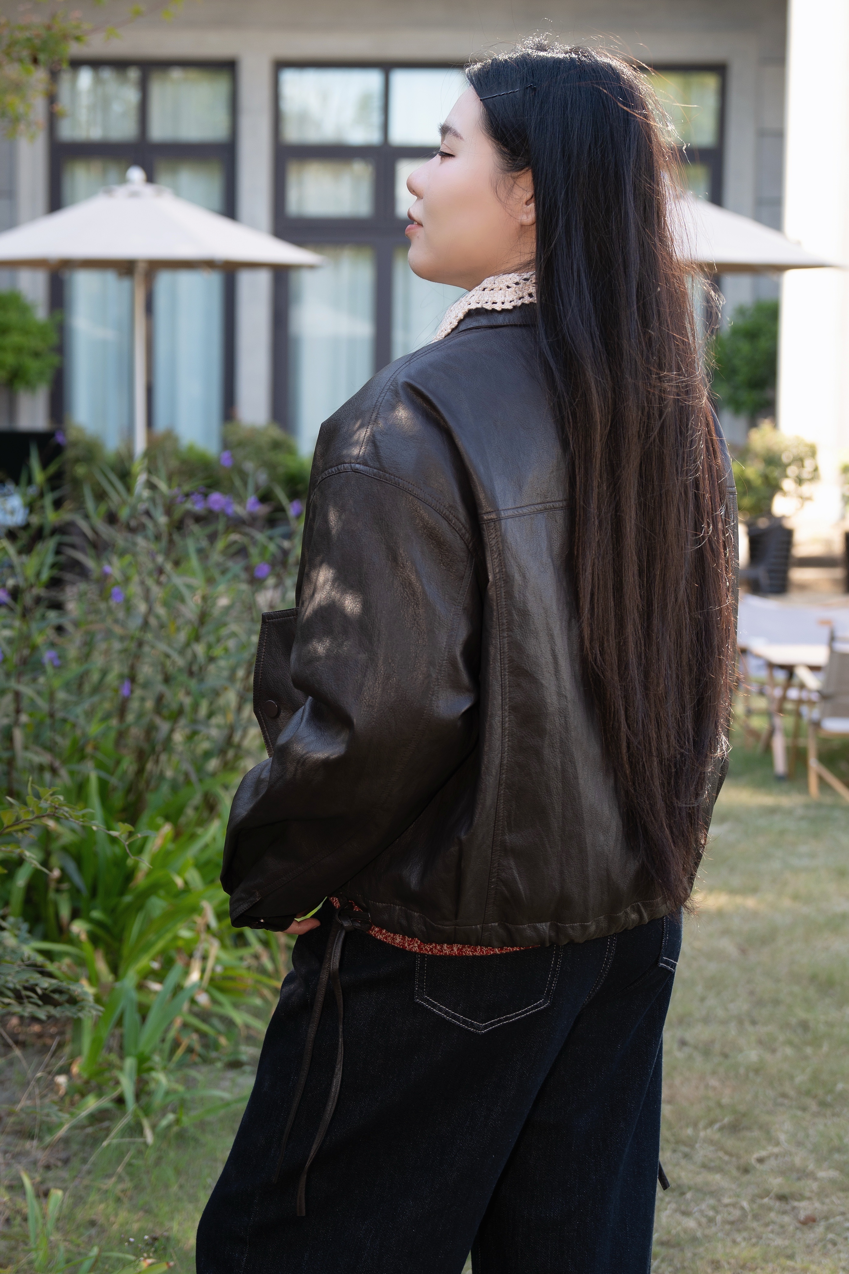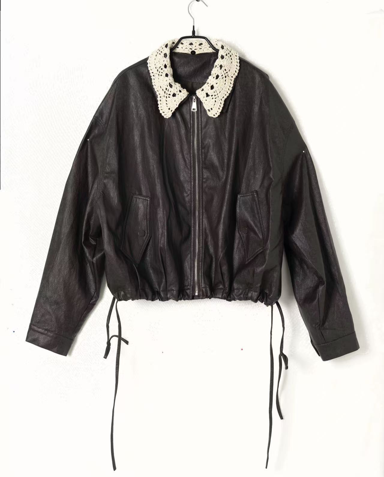 一周发货【可拆卸领口 钩织花边领皮衣夹克】深咖色,拉链款,穿脱方便~花姐朋友出口俄罗斯款货源,高性价比款,环保蛋白皮,质感满分,光泽度佳~