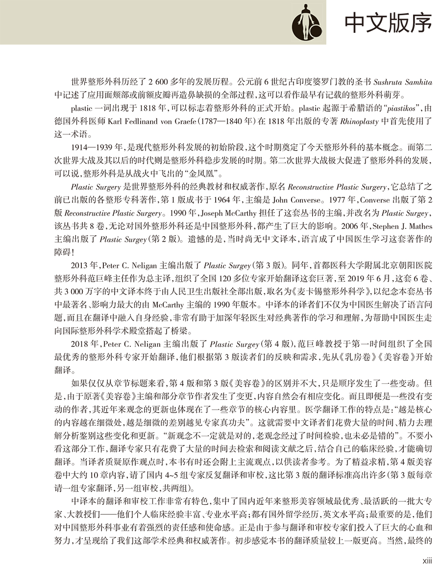 《麦卡锡整形外科学》是世界整形外科的经典教材和*威著作,无论是对国外整形外科还是对中国整形外科,都产生了巨大的影响。第4版《麦卡锡整形外科学:美容卷》涵盖全新彩色临床照片、视频及其他在线增值内容,全书详尽覆盖了近年来美容整形外科领域的理论知识和技术的作要点。作为整形外科领域的经典教材,第4版麦卡锡延续了前几版以解剖部位划分章节的排版方式。对每个部位首先着重详解基础解剖,再根据不同创伤或疾病类型详述具体的外科手术原则、理论和技术。