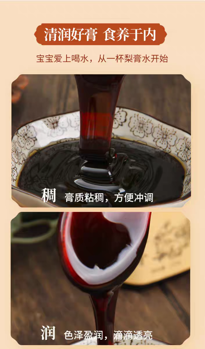 也有些商家,另辟蹊径,添加蜂蜜、枇杷叶、甘草等中药成分,以中草药噱头来夸大功效,然而"是药三分毒",特别对老人、小孩、孕妇等体弱者,如长期食用,对身体潜移默化的损害无法估量,这与梨膏温补的效果相悖。国家非遗大师于爱美老师亲自为都市惠古法熬制传统膏方,不用任何添加剂,只选用老树梨,老树梨汁多、清甜滋润,含天然原儿茶酸,对梨膏的品质是至关重要。熬制时整颗梨入锅,熬制时融合梨皮、梨肉和梨核成分,才是传统意义上真正的莱阳慈梨膏。