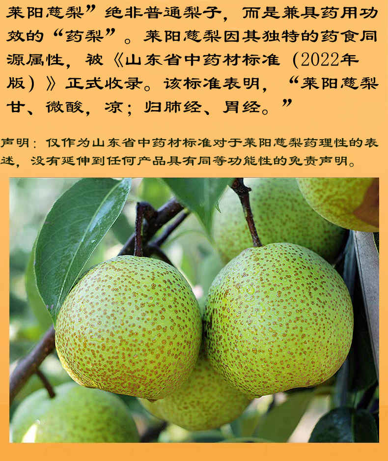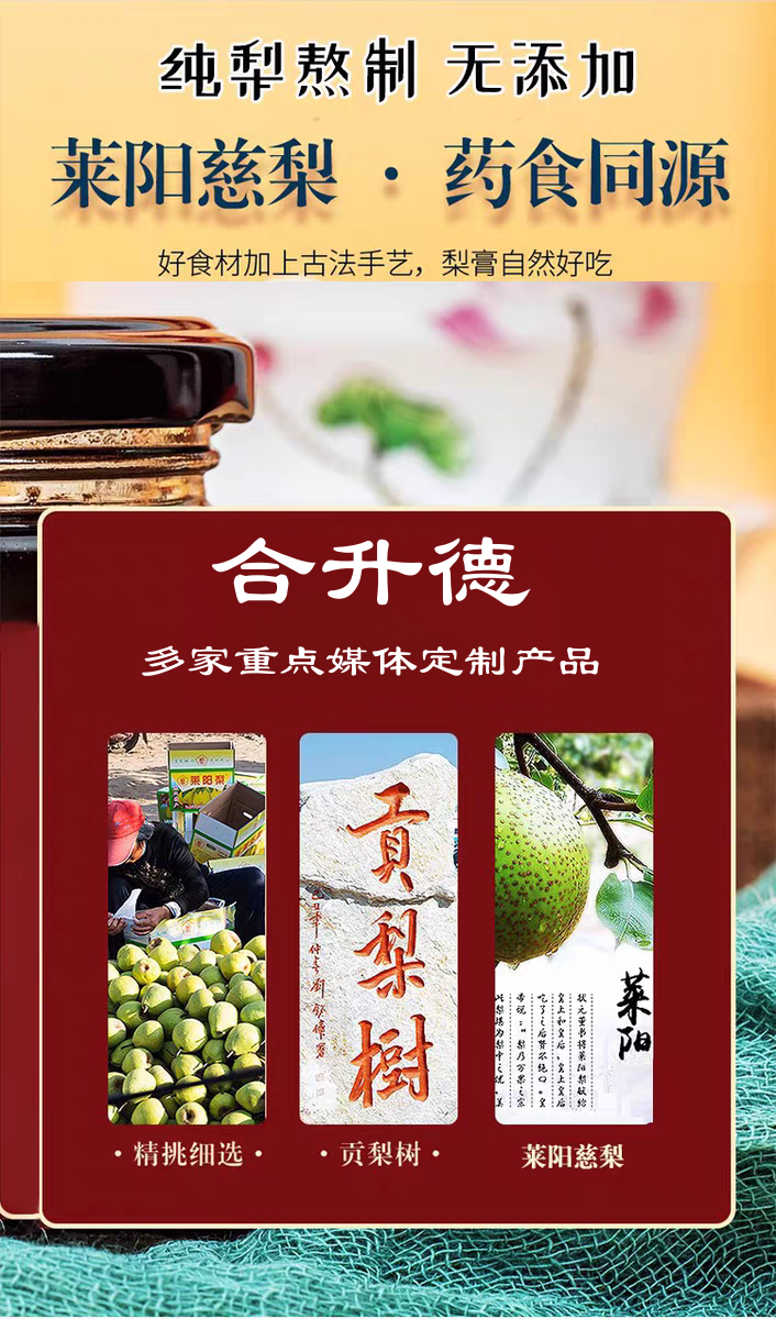 特油沙地长出来的莱阳慈梨 ,采摘树龄10 年以上的完熟期慈梨,果糖、 有机酸含量比一般的梨高 2~3%, 确保营养和糖分到达高且稳定的含量,这是都市惠品控坚决不用落地梨最主要的原因。在原产地从业者说,近年来,烂果浓缩汁、果糖、香料和粘稠剂调兑的梨膏,以低价占领全国市场,并冠以"纯梨膏"的名号,吃这样的梨膏,不仅没有任何效果,还会给身体增加负担。