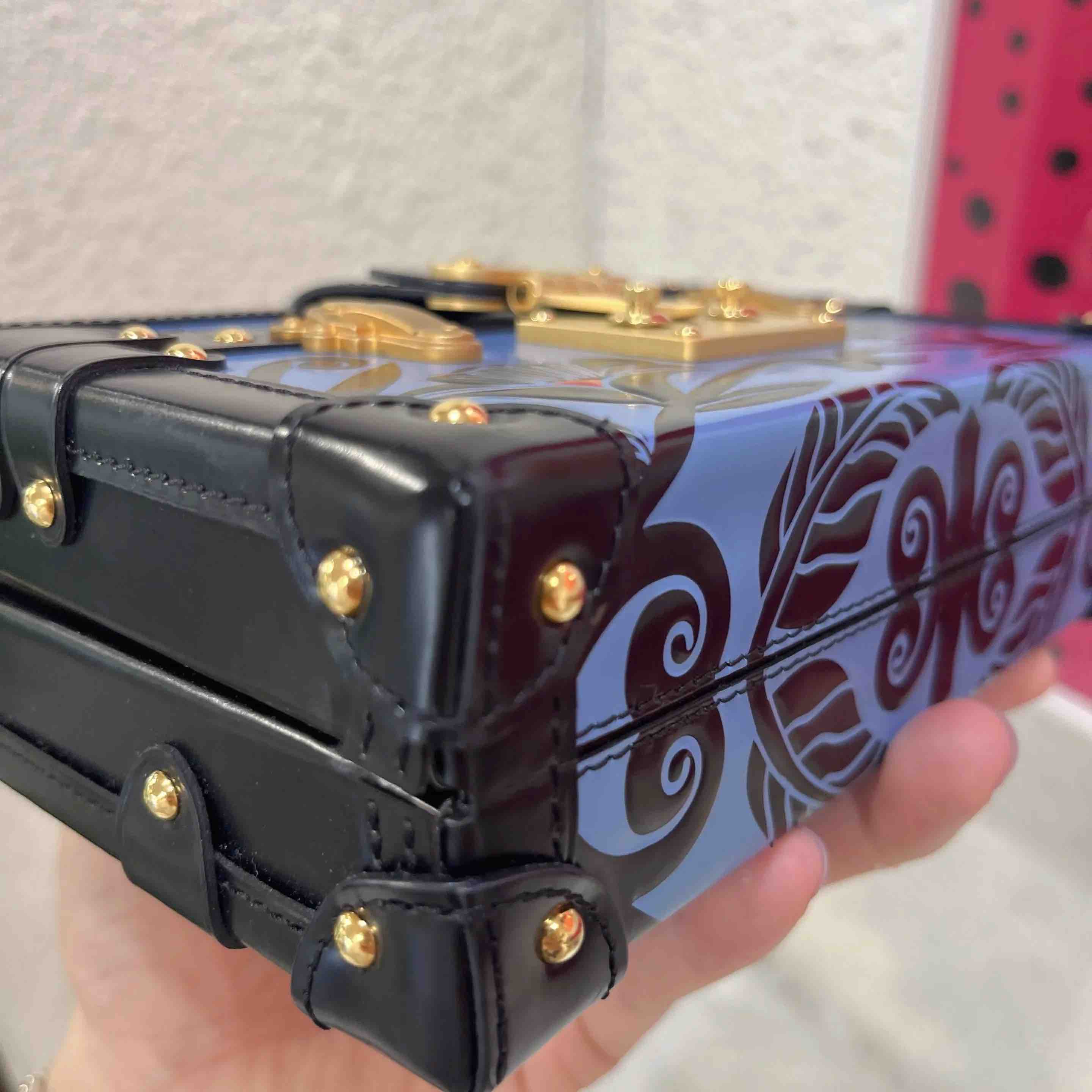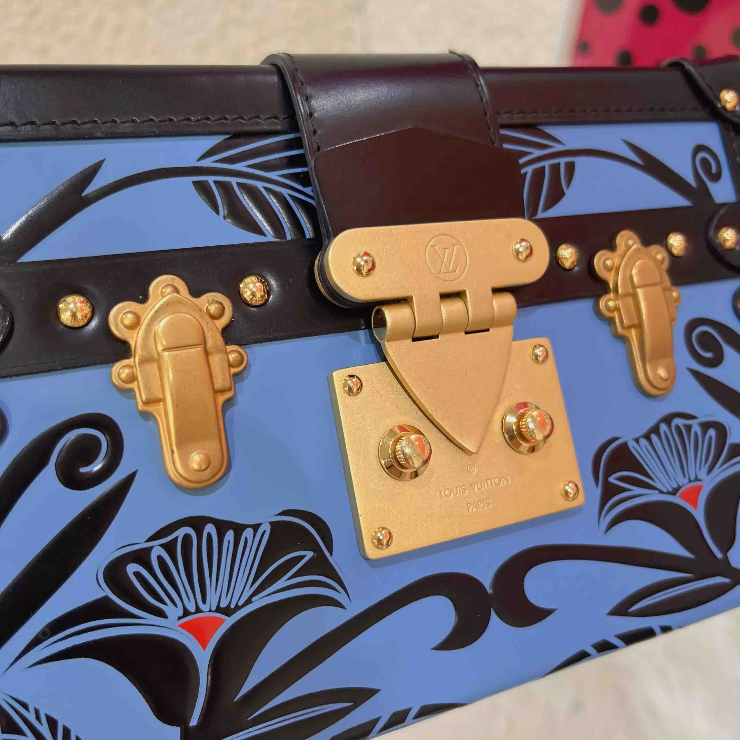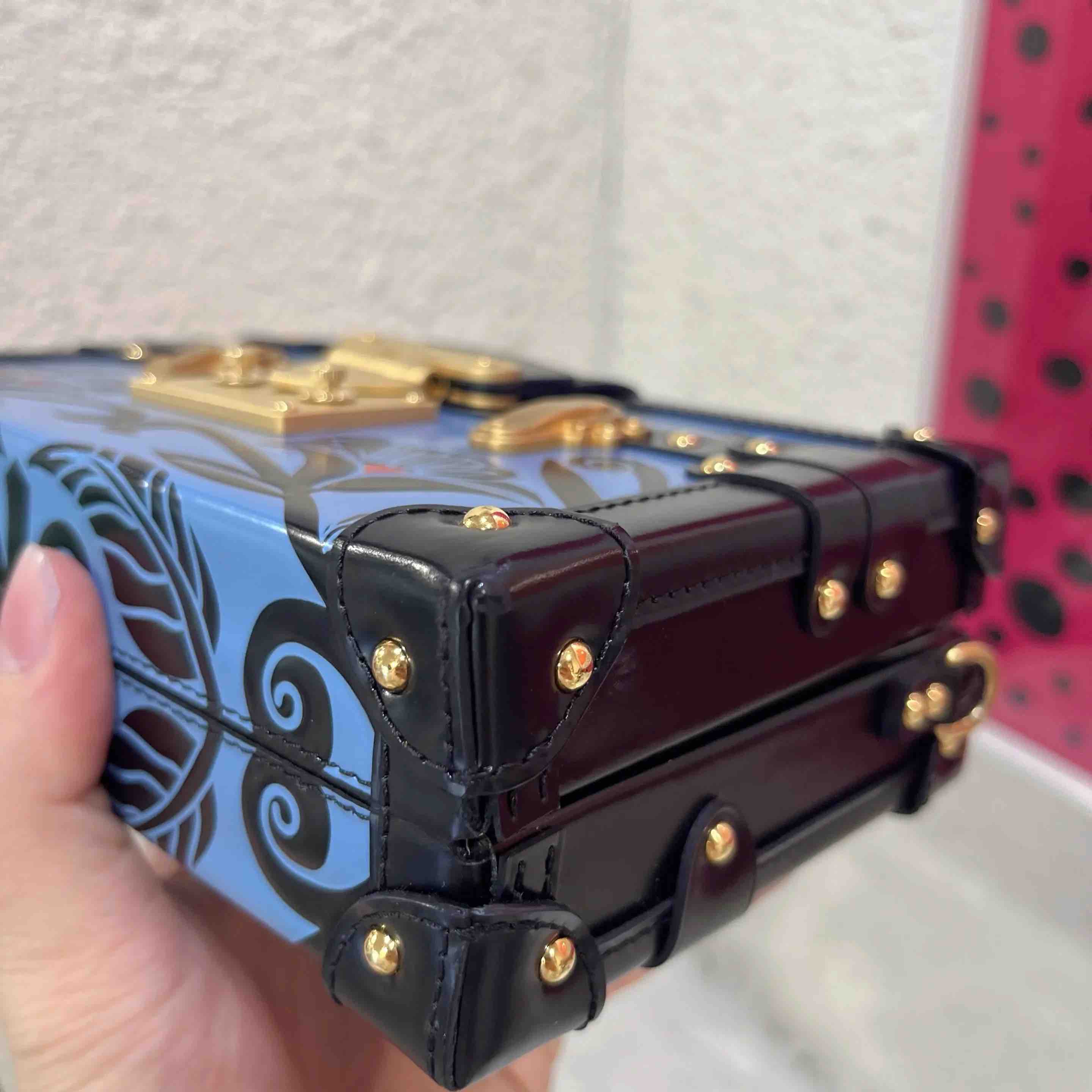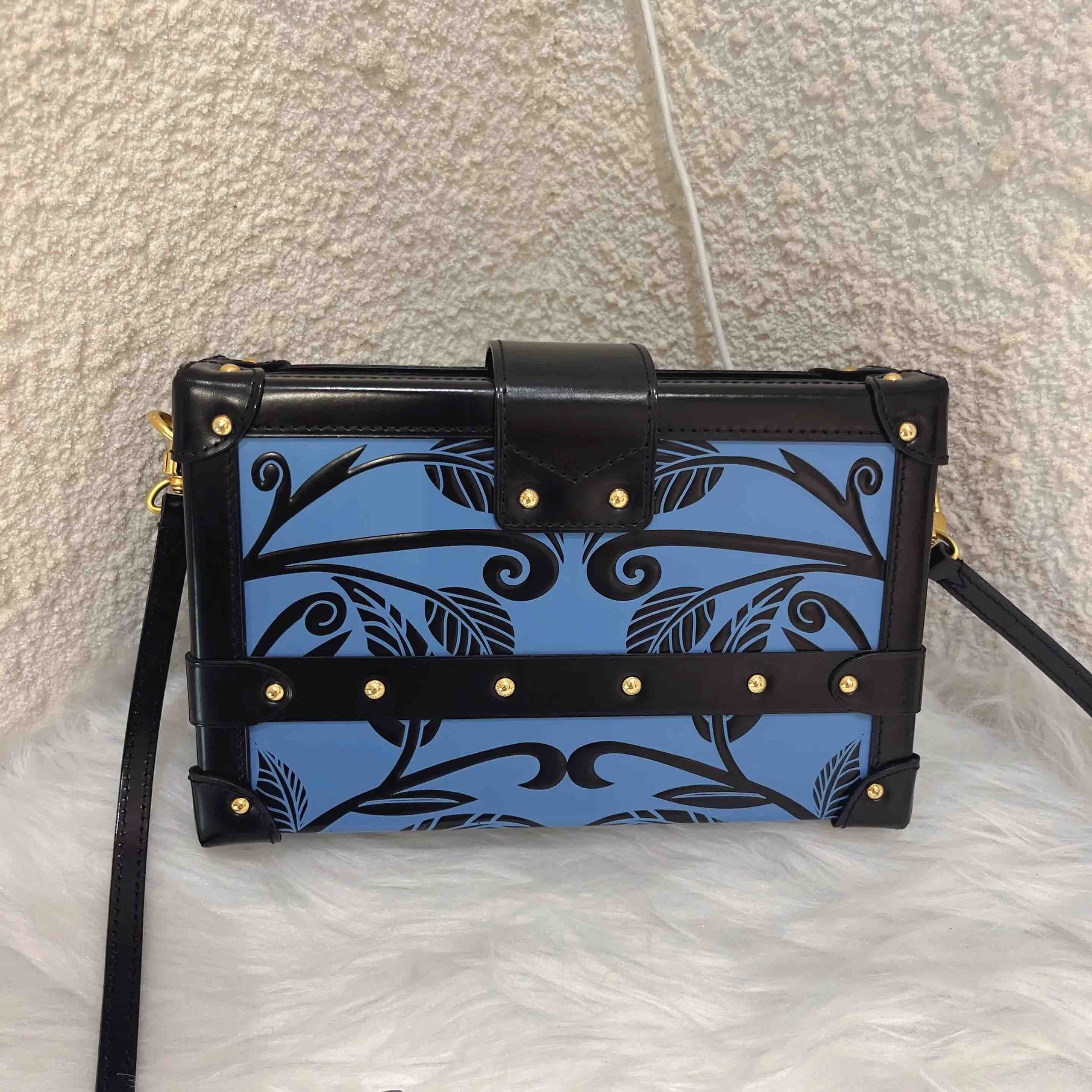【商品详情】正品二手 Lv petite malle 牛皮 蓝拼黑 花卉印花 金扣 硬盒子🐾 95新 19*12 配件:票 肩带 防尘袋。边角正常使用感。LV限量款蓝色花卉盒子包 优雅复古