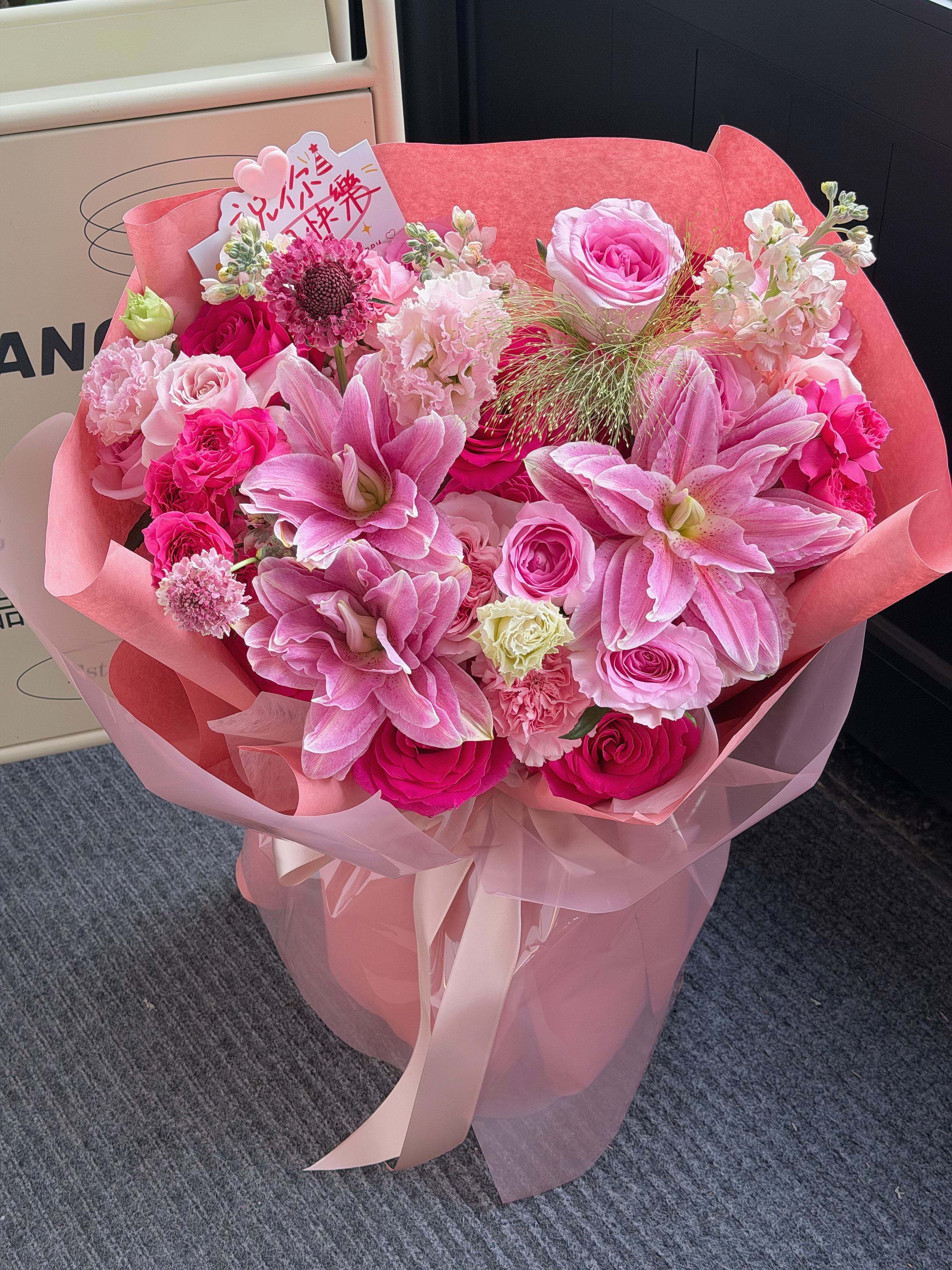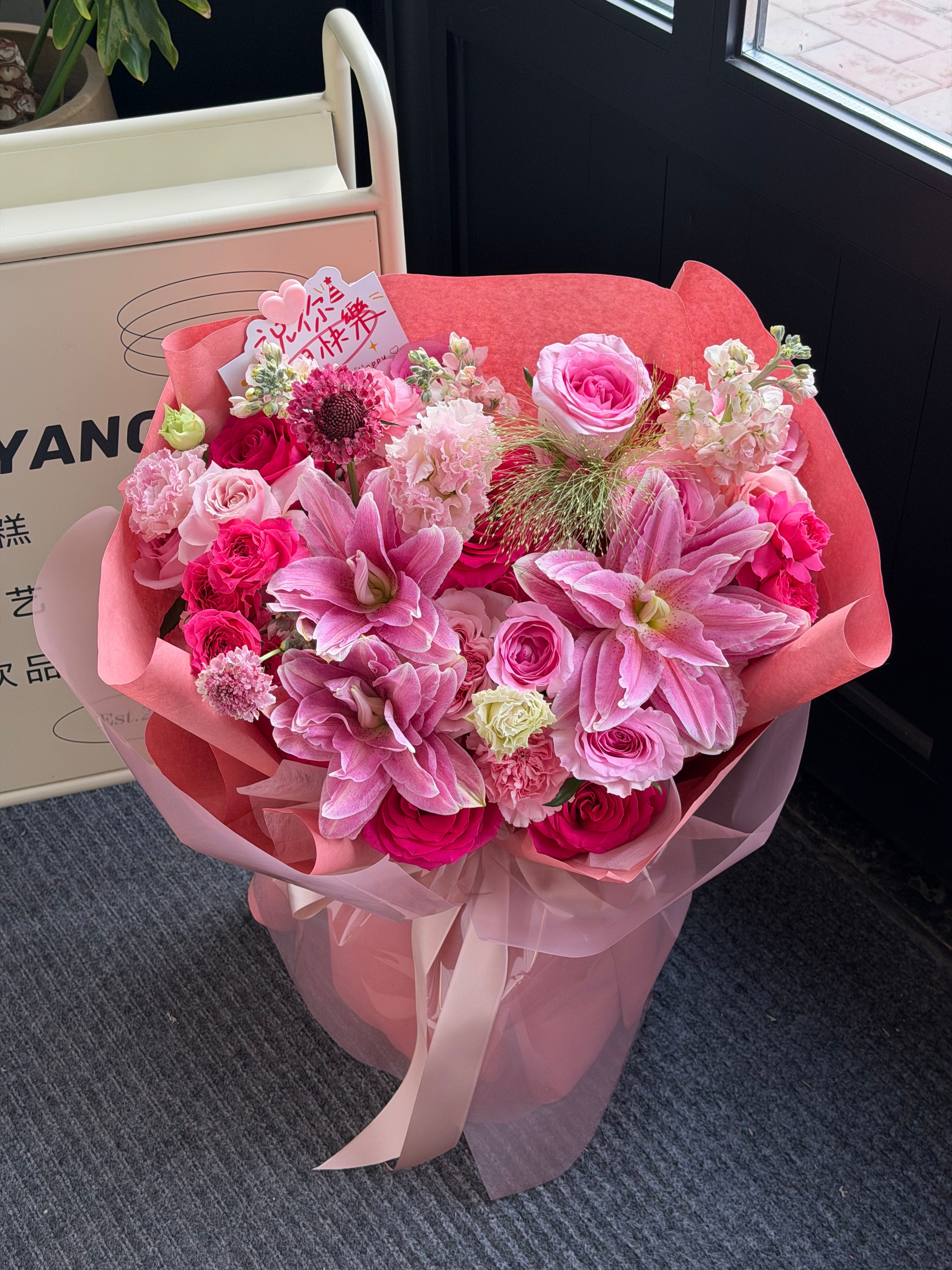 重瓣粉百合 × 玫红玫瑰 × 浅粉雪山