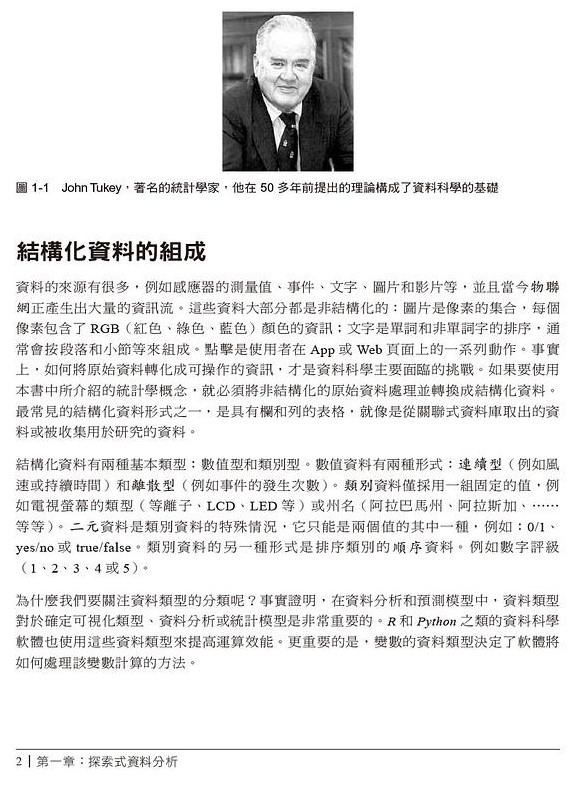 「這本書並非是另一本統計學教科書,也不是機器學習手冊。本書透過清楚的解釋和豐富範例,將實用的統計術語及原理和當今資料探勘的行話及實務聯繫起來。對資料科學的初學者和老手來說,這都是一本非常出色的參考書。」 —Galit Shmueli, 暢銷書《Data Mining for Business Analytics》主要作者,台灣清華大學特聘教授