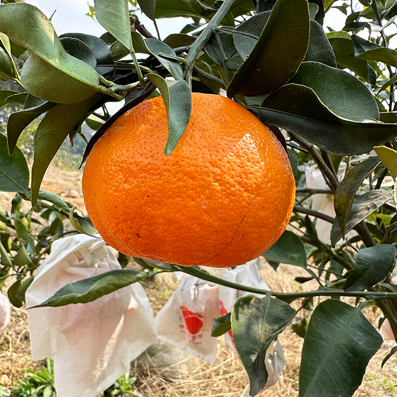 柑橘长出果子后,农人手工套上果袋,以预防果子被外界所伤害,也可以让果皮更加光泽。