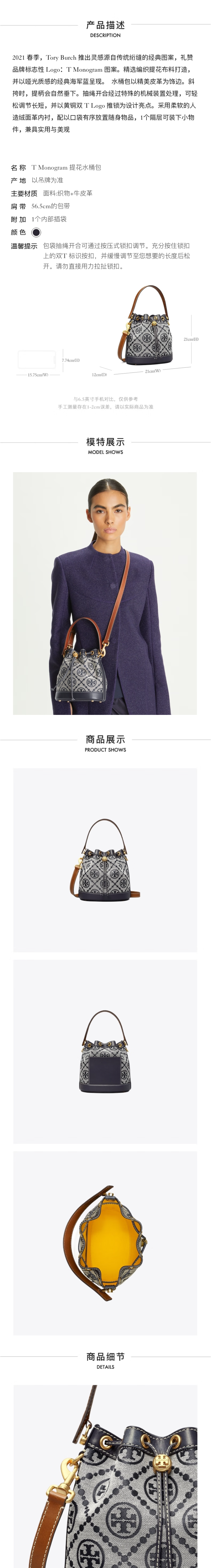 【爆款老花水桶】Tory Burch/汤丽柏琦 T MONOGRAM 提花斜挎水桶包 香港直邮 清关约7个工作日-w