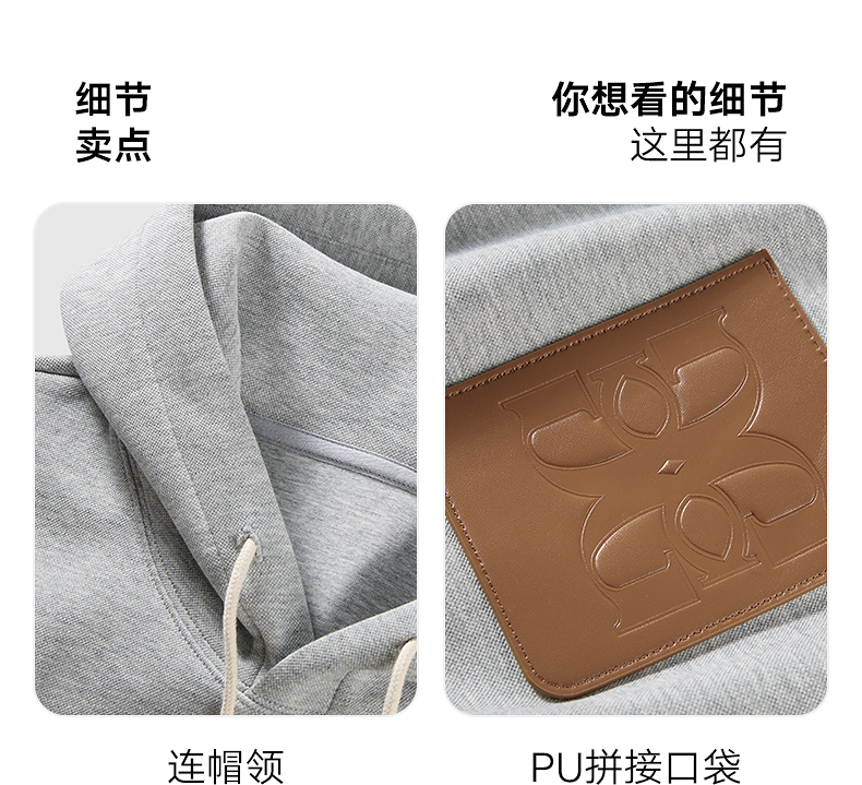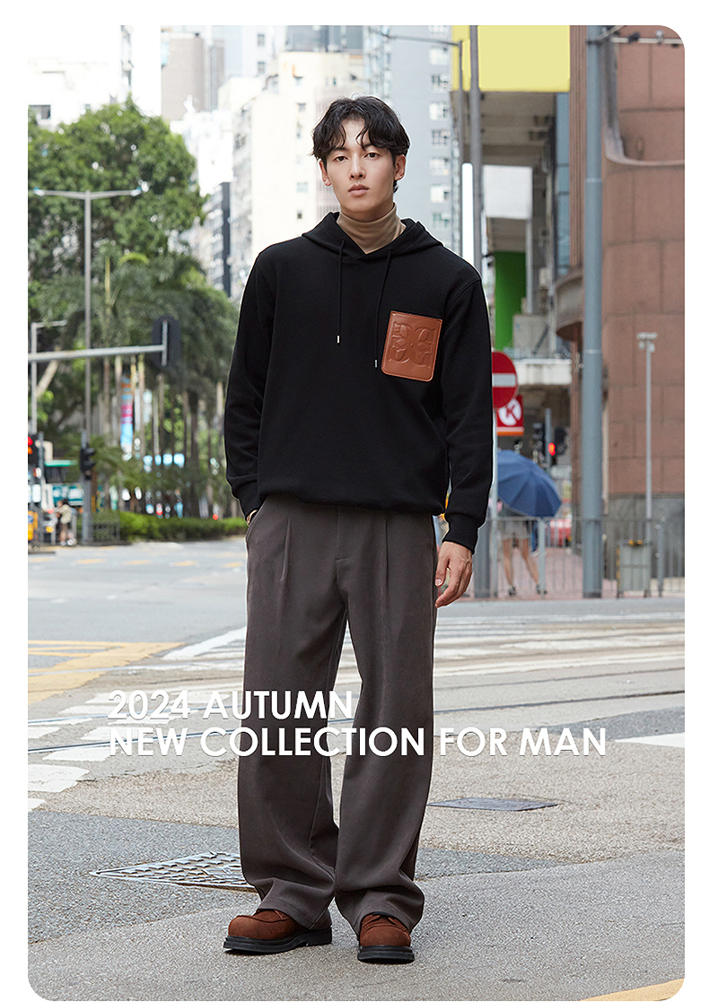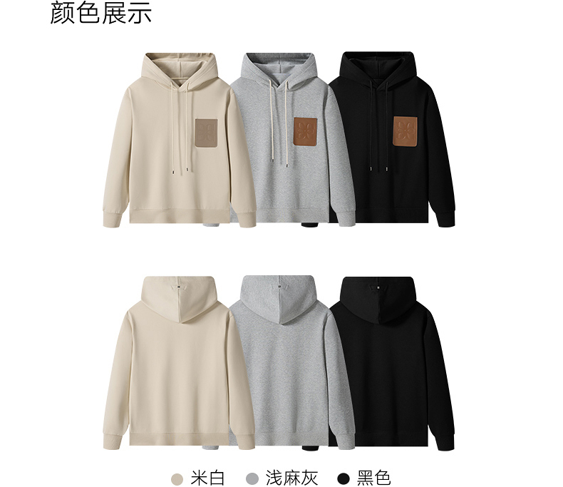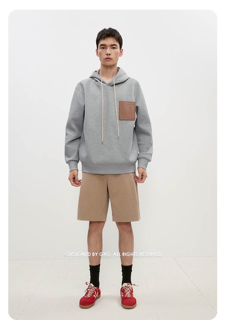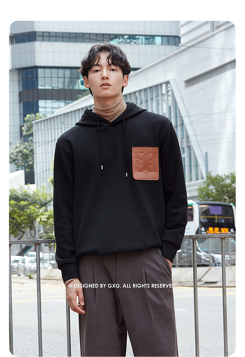 GXG男装 多色空气层撞色皮质口袋复古休闲连帽卫衣男 24秋季热卖