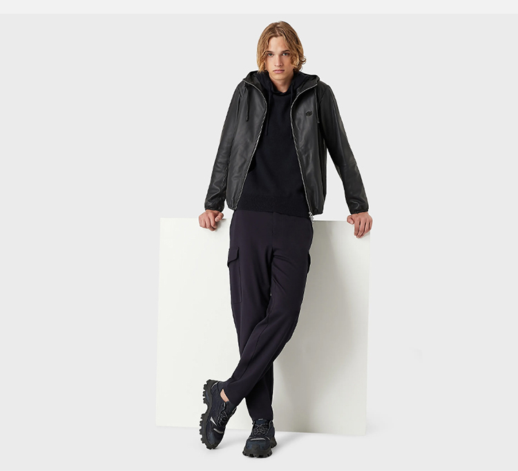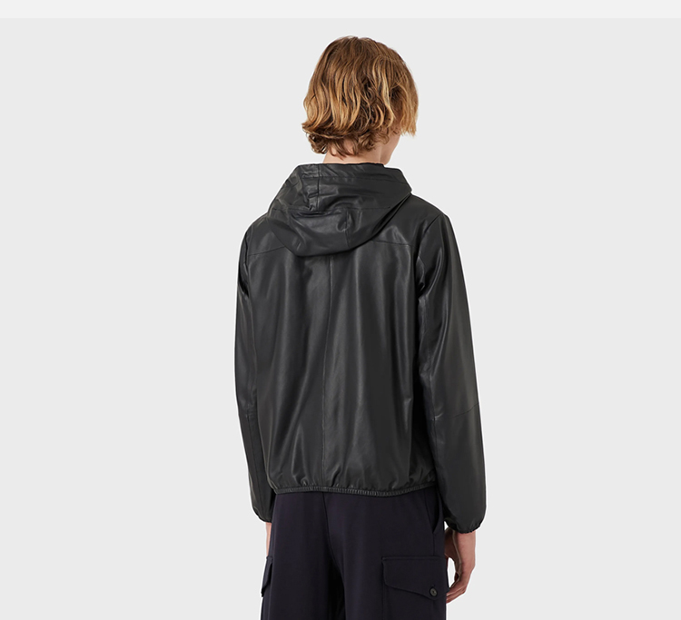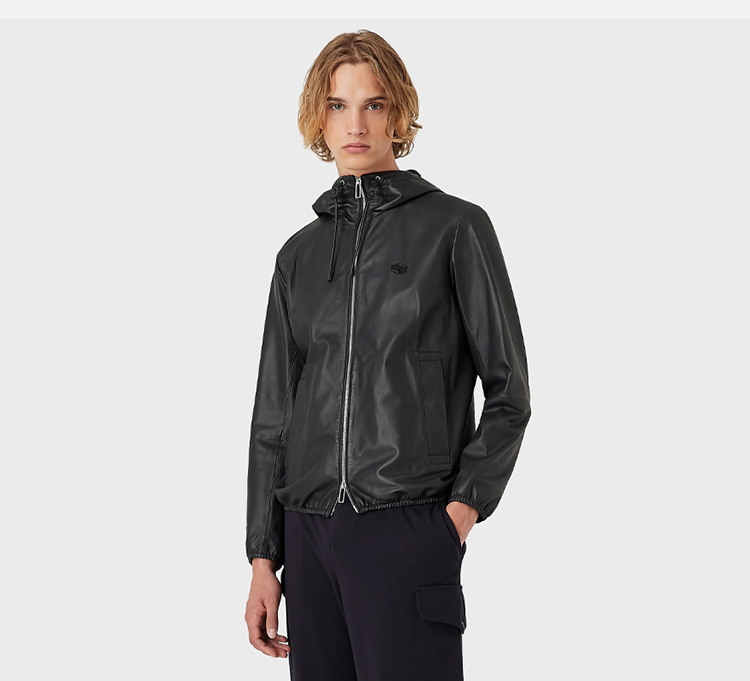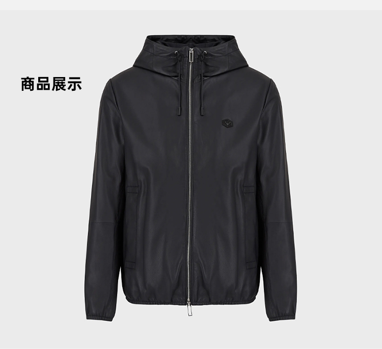 EMPORIO ARMANI 阿玛尼 男士羊皮徽标贴花连帽皮衣外套 深蓝色 01R54P 01P54 922