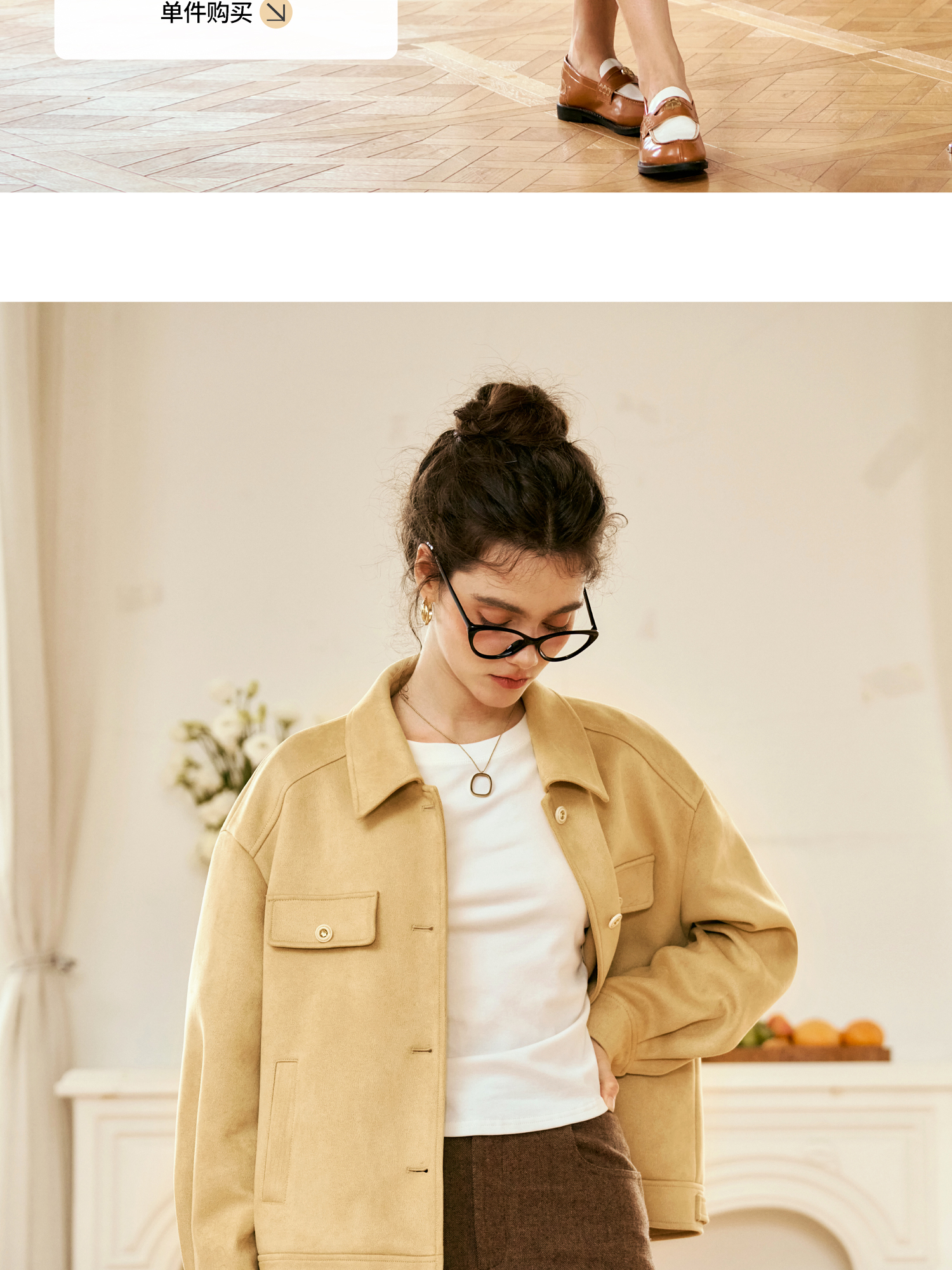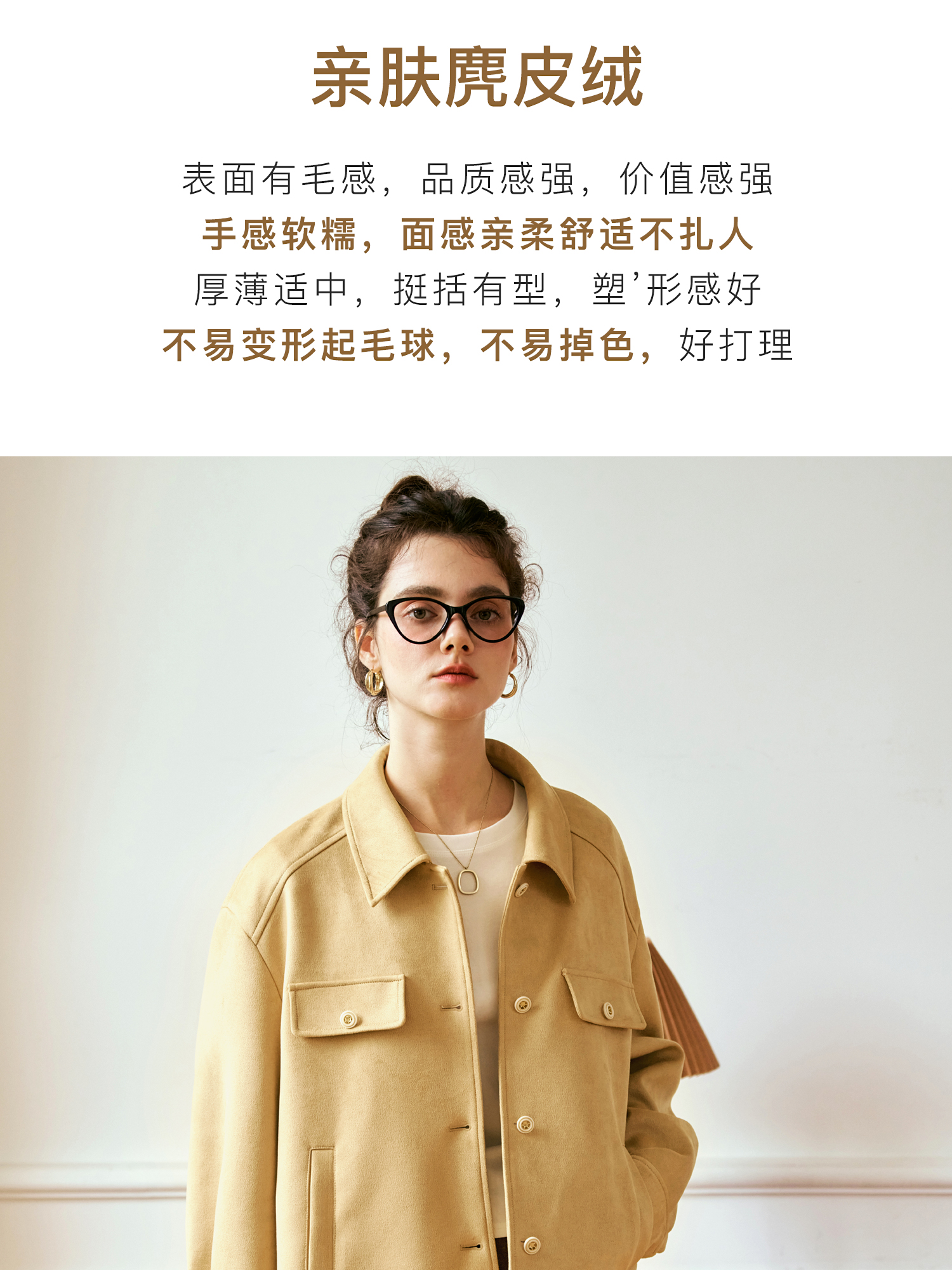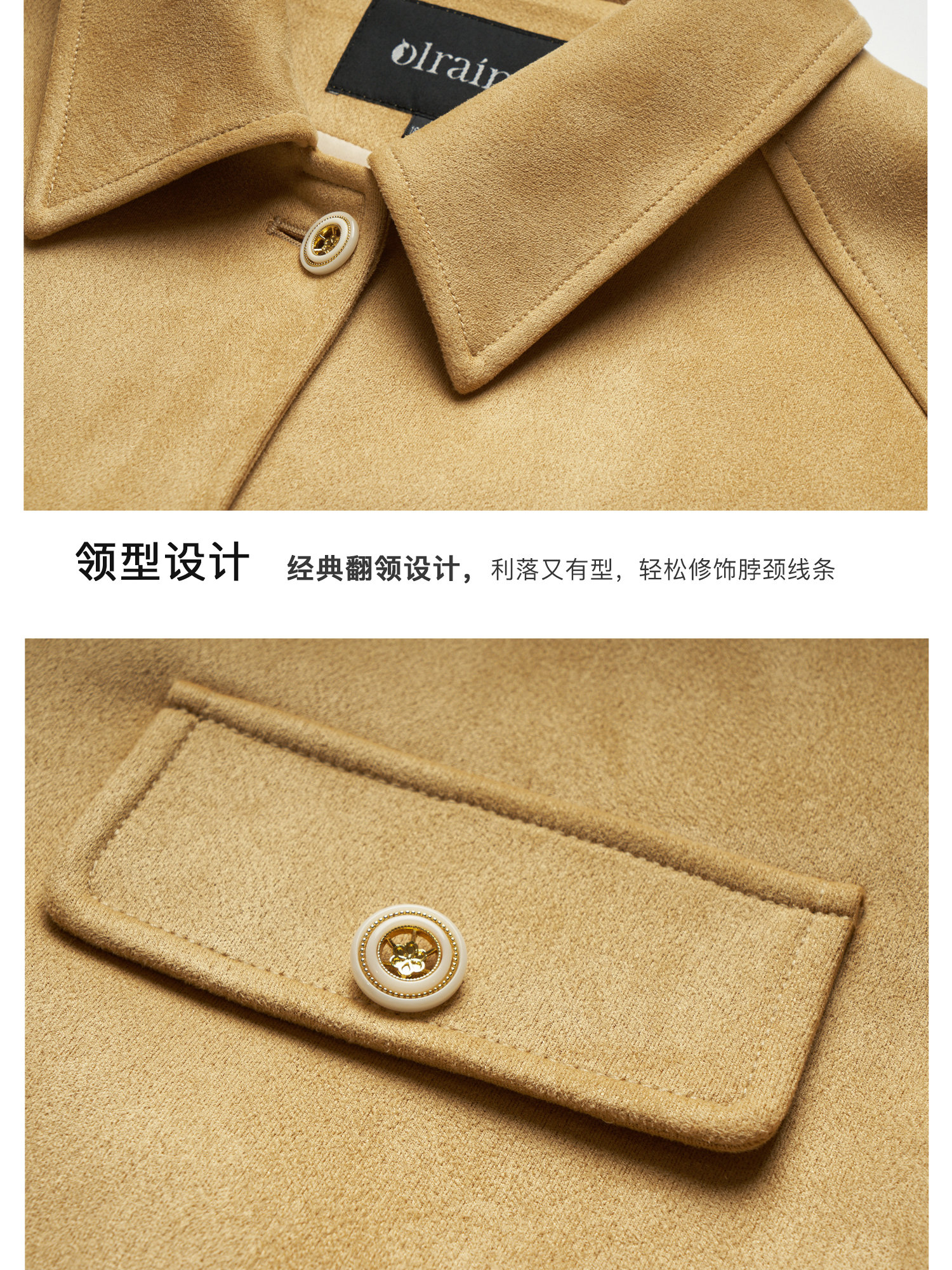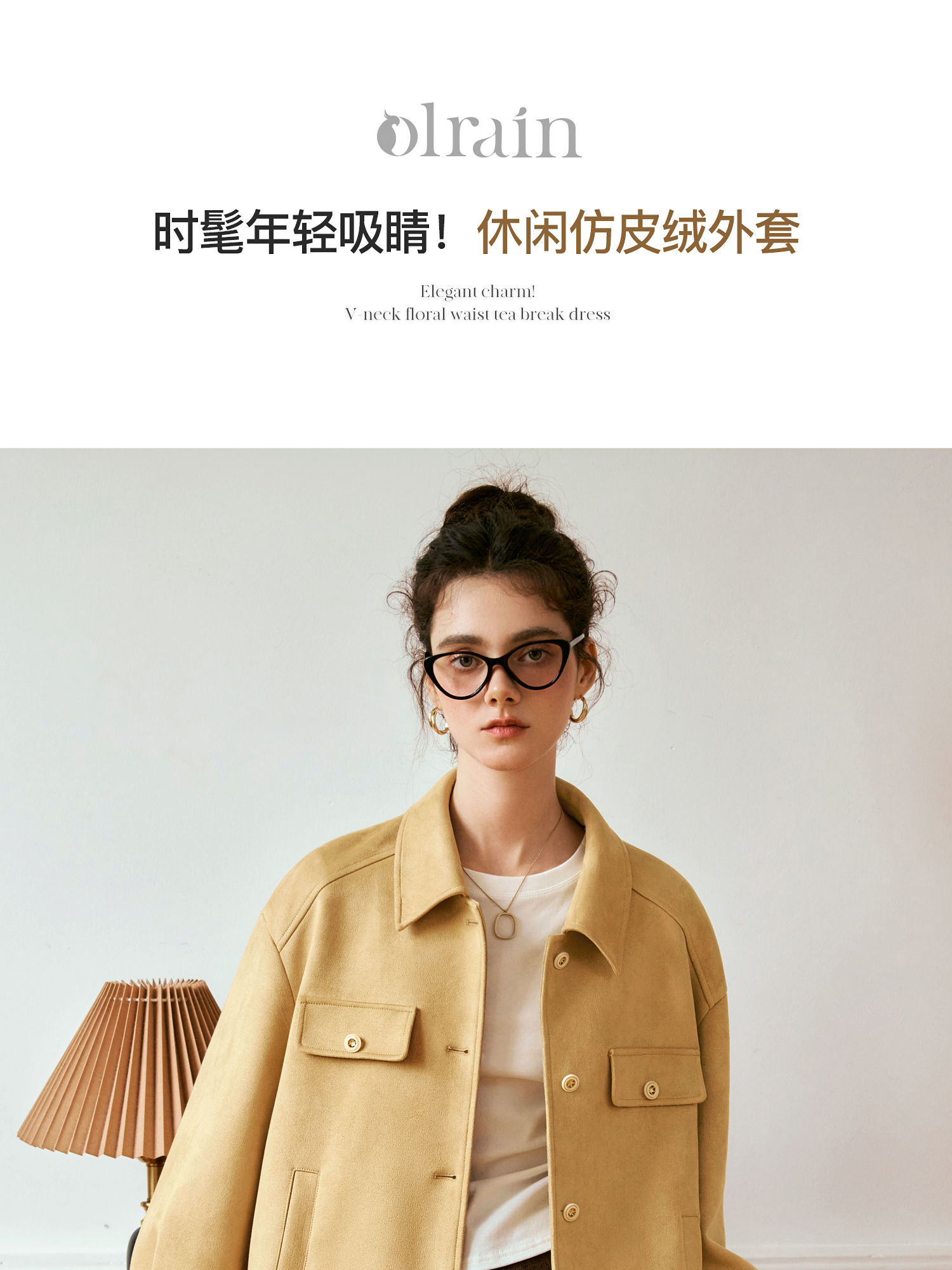 OLrain欧芮儿卡其色工装短外套女秋季2024新款宽松休闲仿皮绒上衣