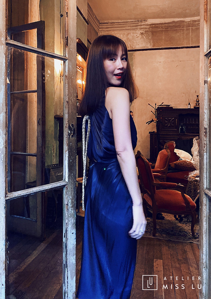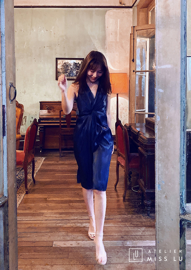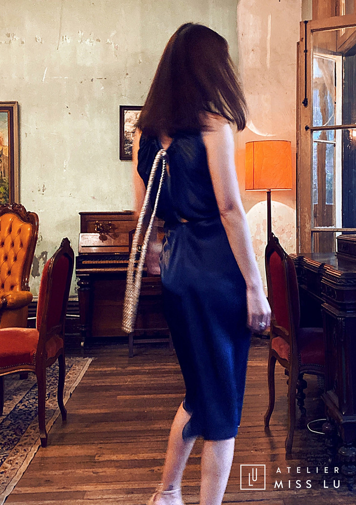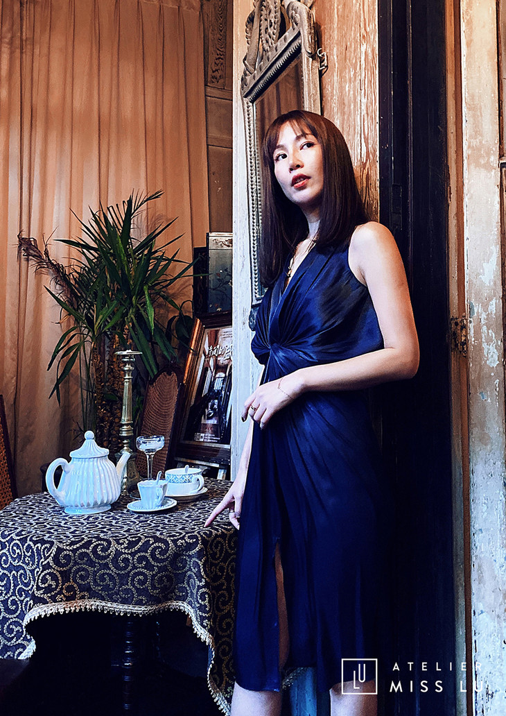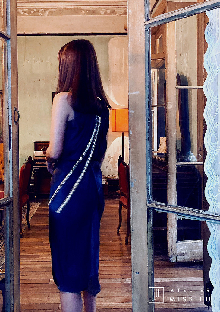 AtelierMissLu / Onirii-神秘蓝色带褶修身短款晚礼服背部装饰带