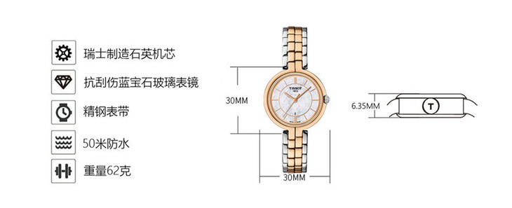 | 防水 | 50 m | 表带 | 精钢PVD镀玫瑰金间金表链 按钮式蝴蝶扣 |