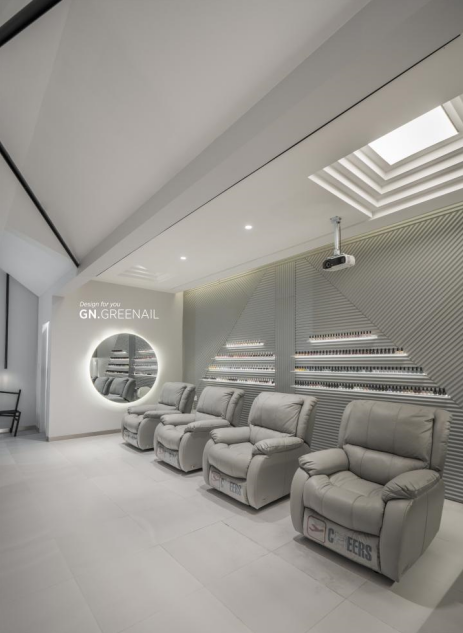 入驻在上海各大高端商场的Greenail,简约、时髦、富有设计感的装修。挑高的层高设计,让这个空间宽敞无比。墙壁上还有投影,做指甲的时间也不会感到无聊!