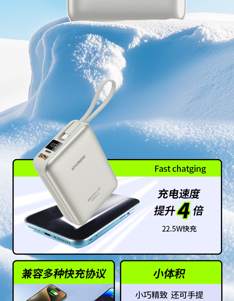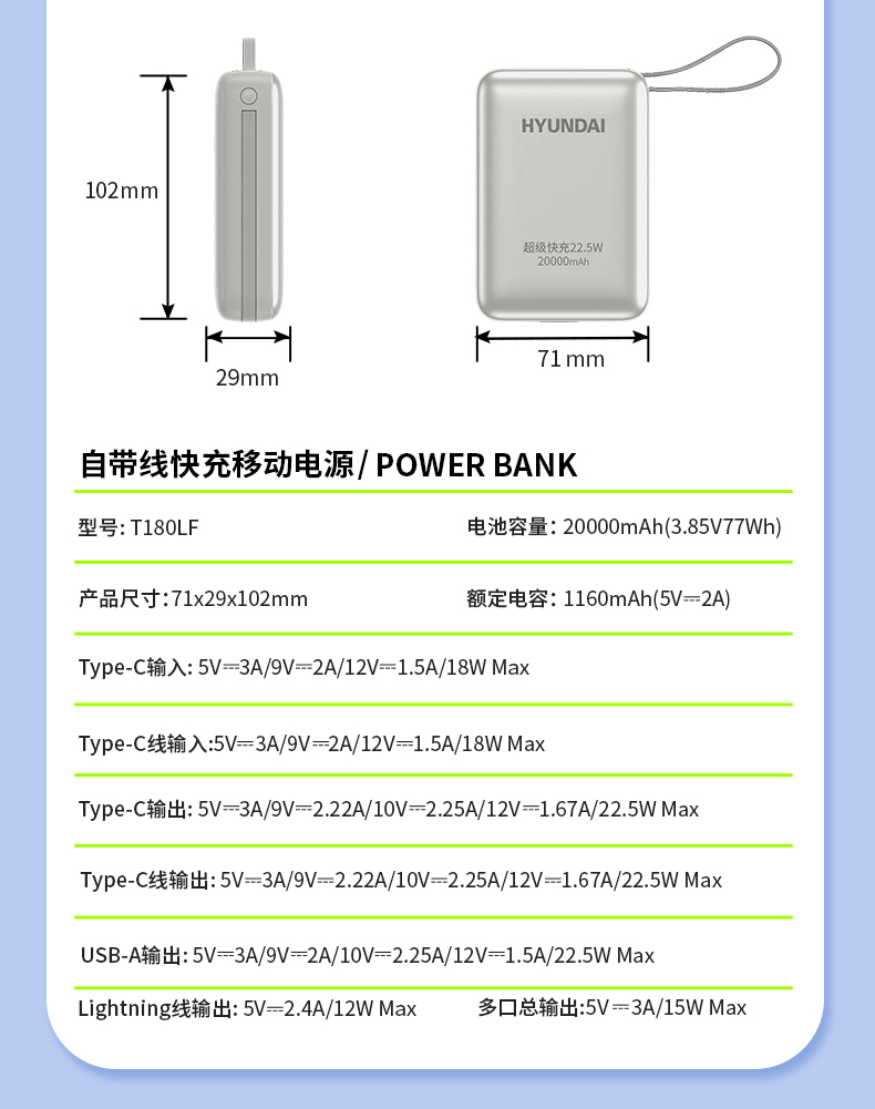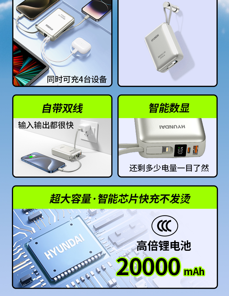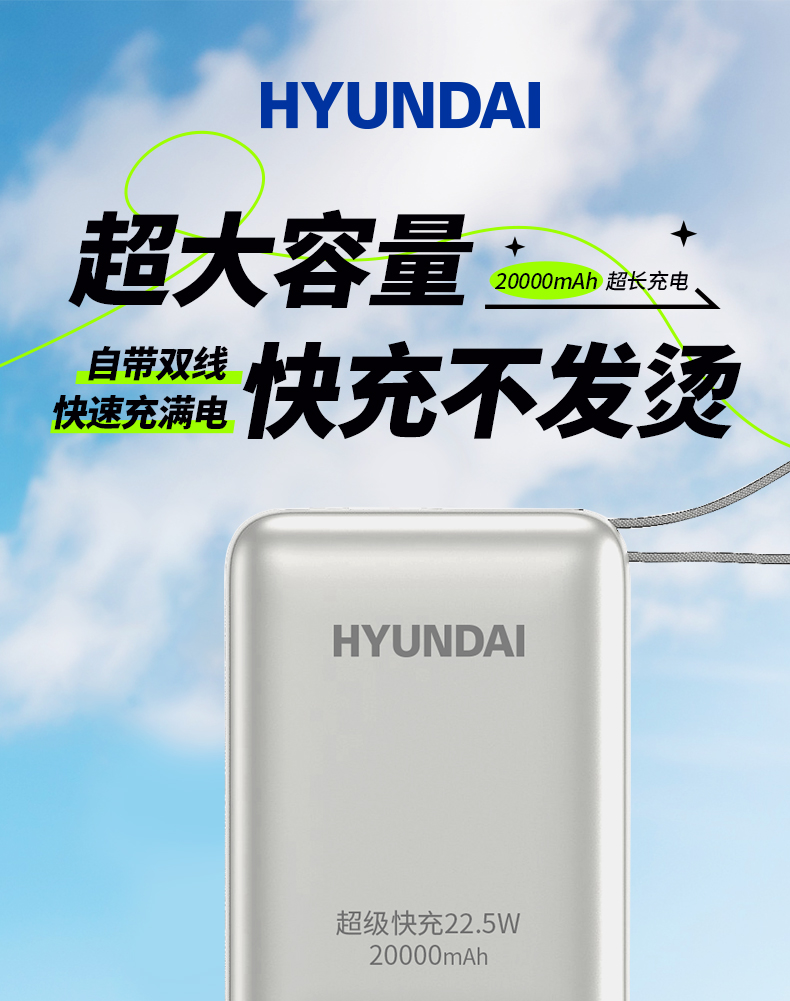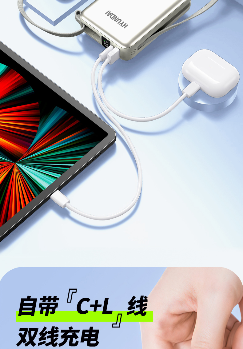 HYUNDAI 自带线快充移动电源20000毫安电源22.5W快充 T180LF