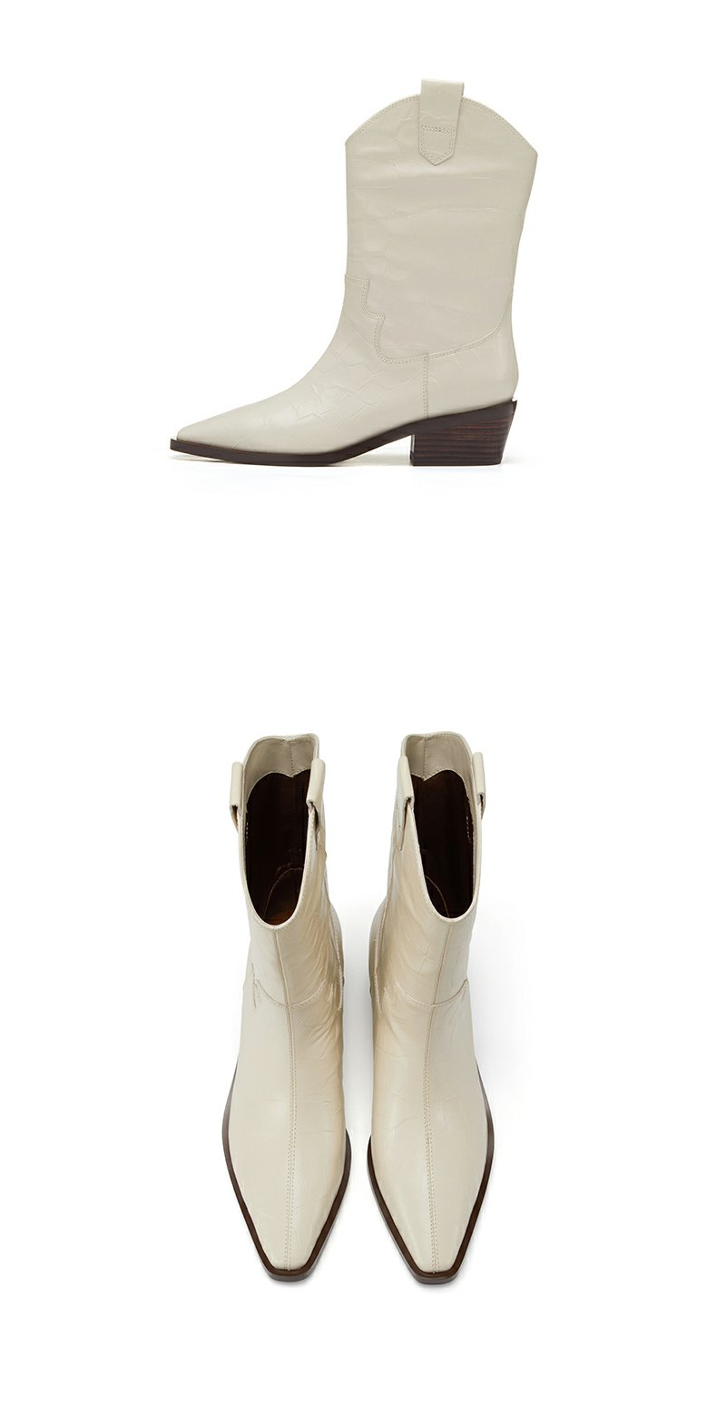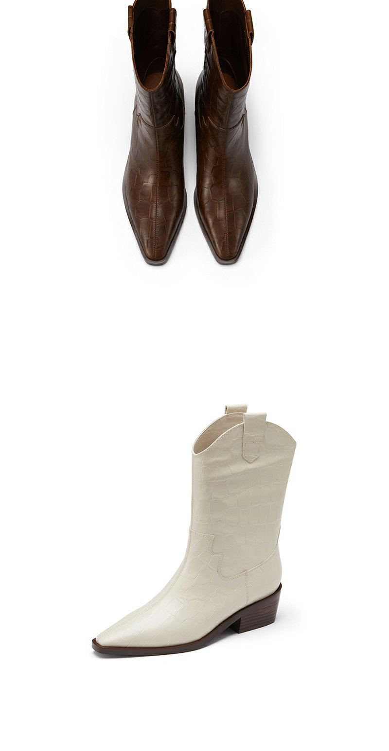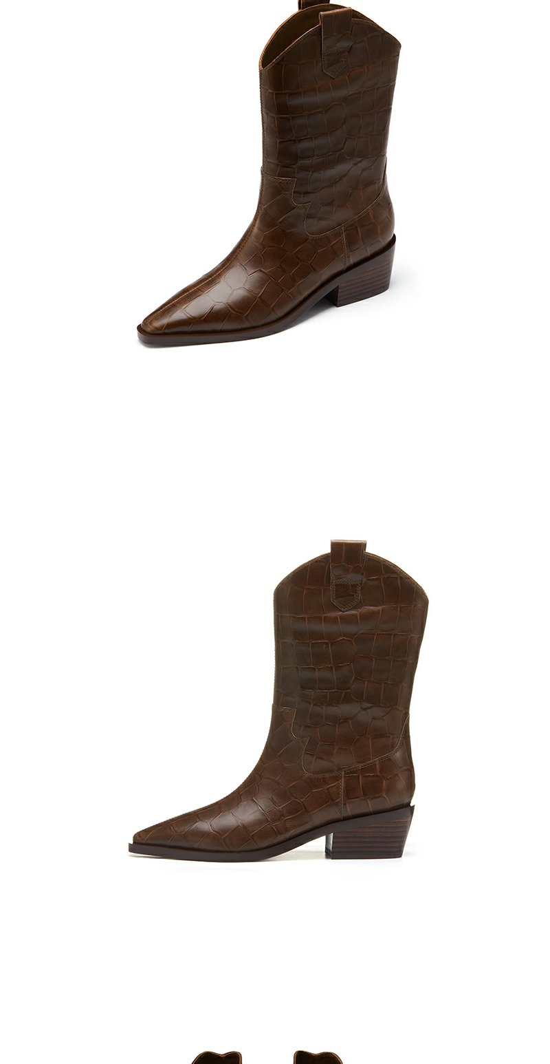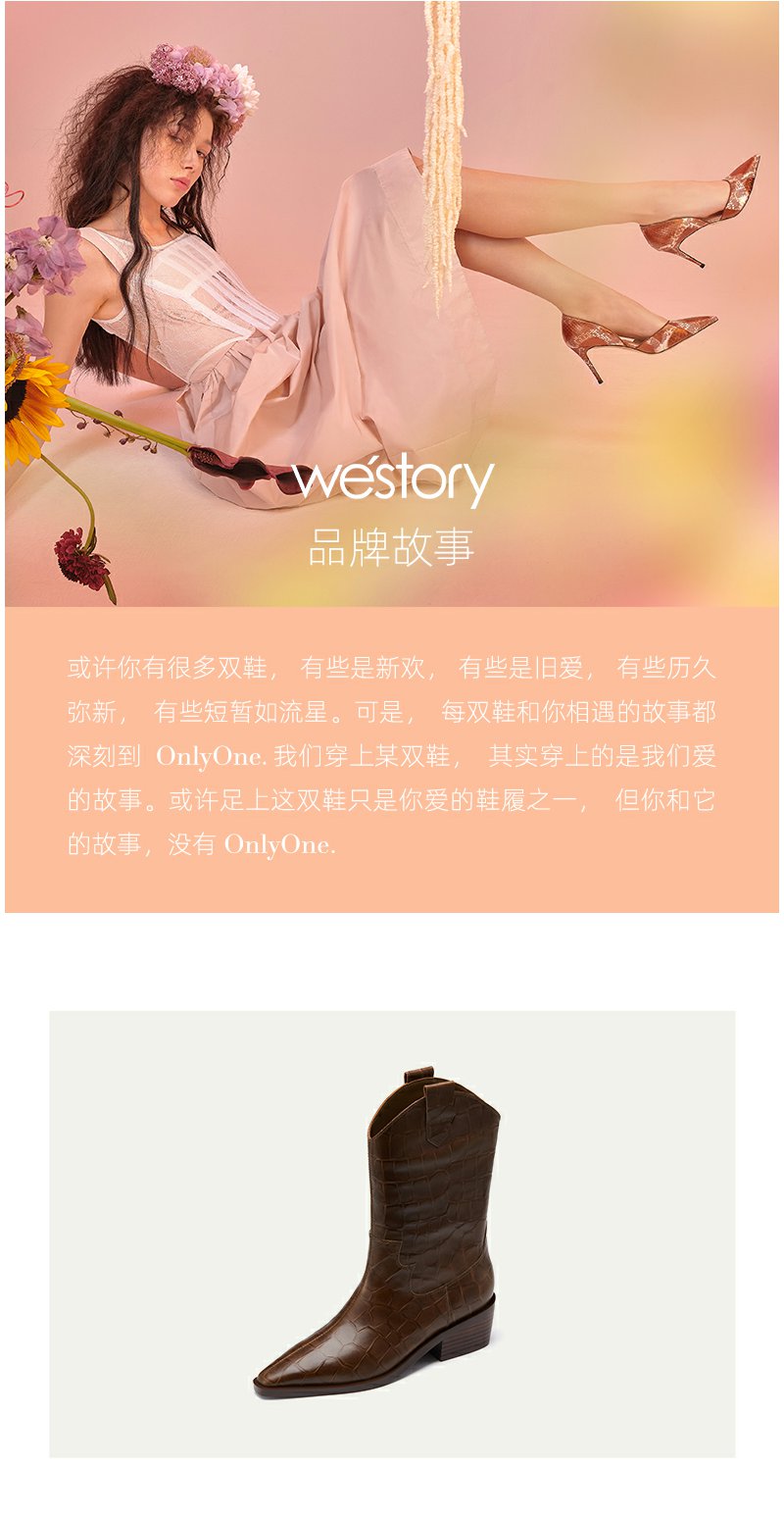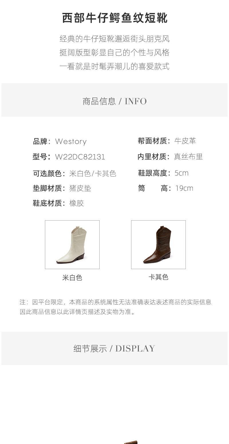 westory小方头粗跟短筒牛仔风套筒鳄鱼纹骑士靴秋冬新款82131