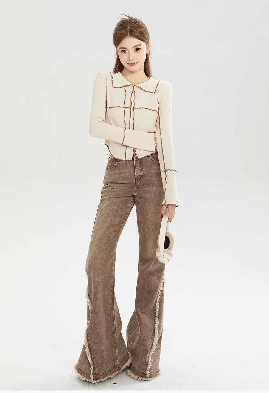 P&X设计师女装秋 长袖翻领百搭修身打底短款T恤 824302194 卡其