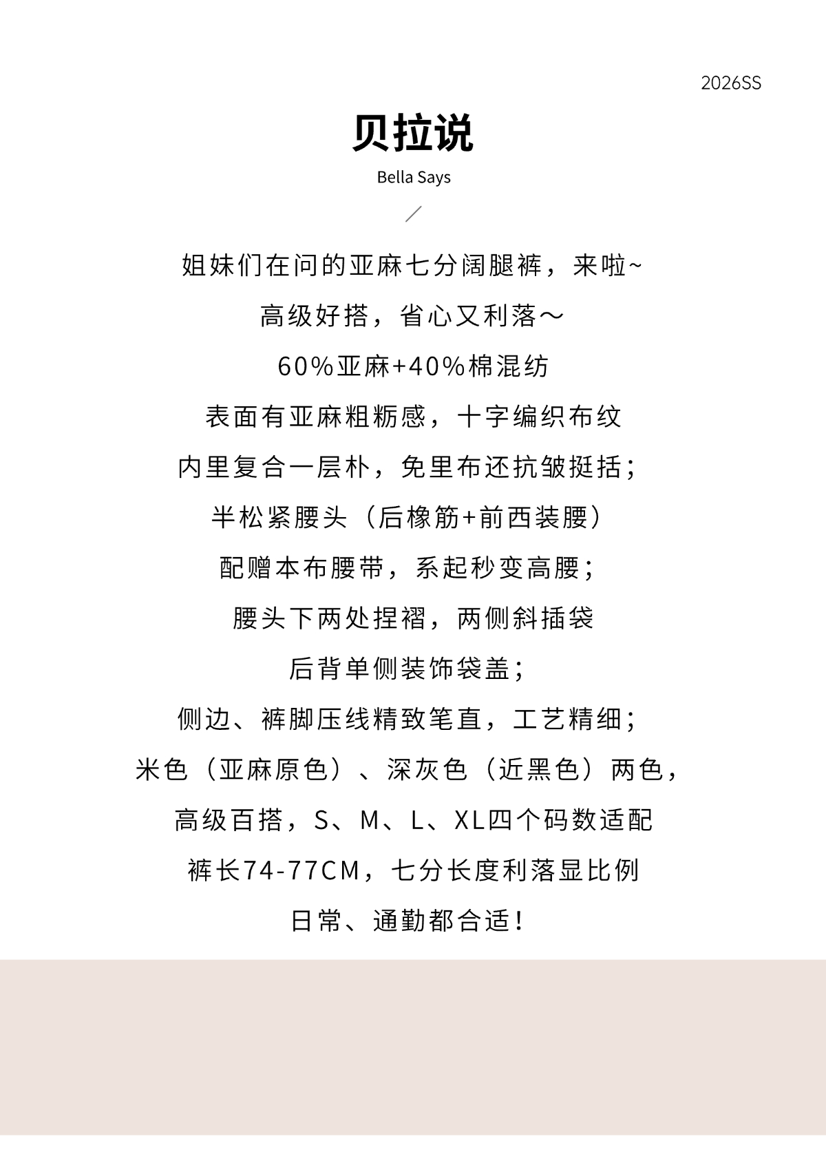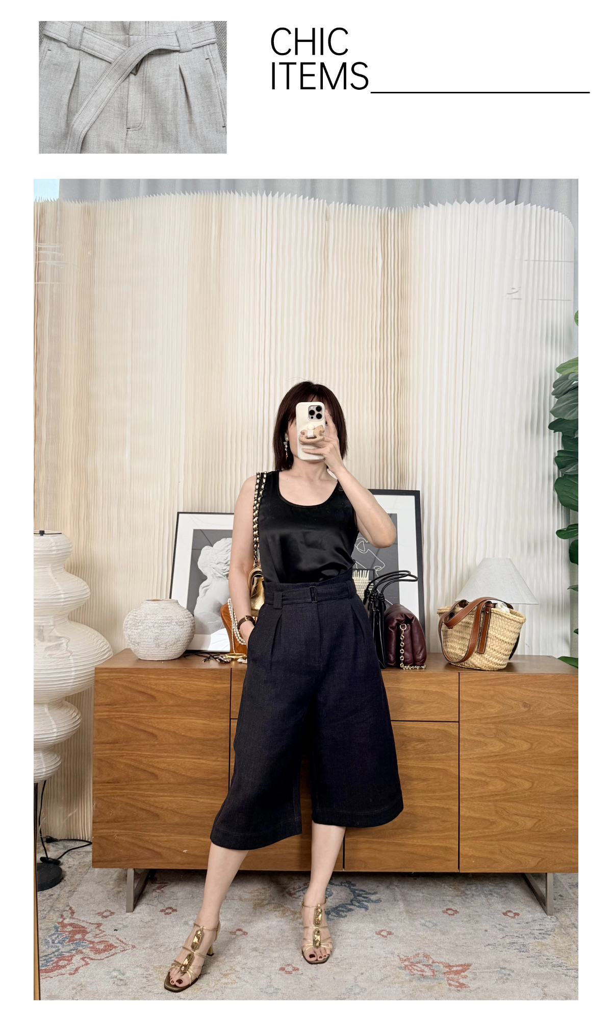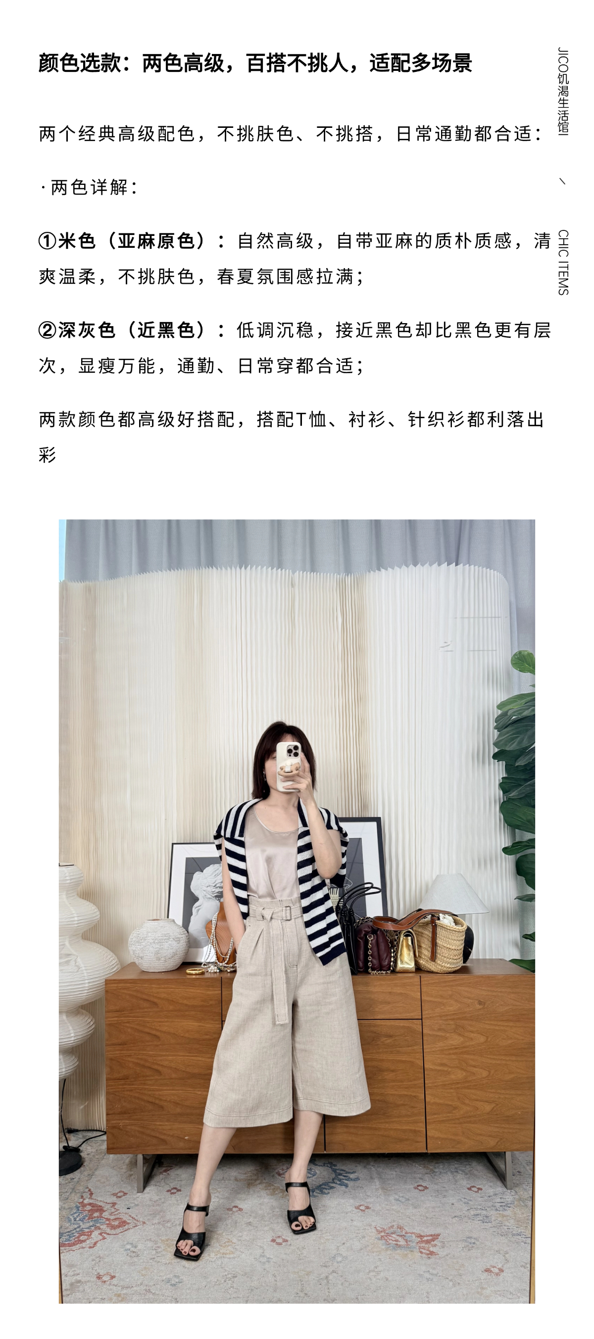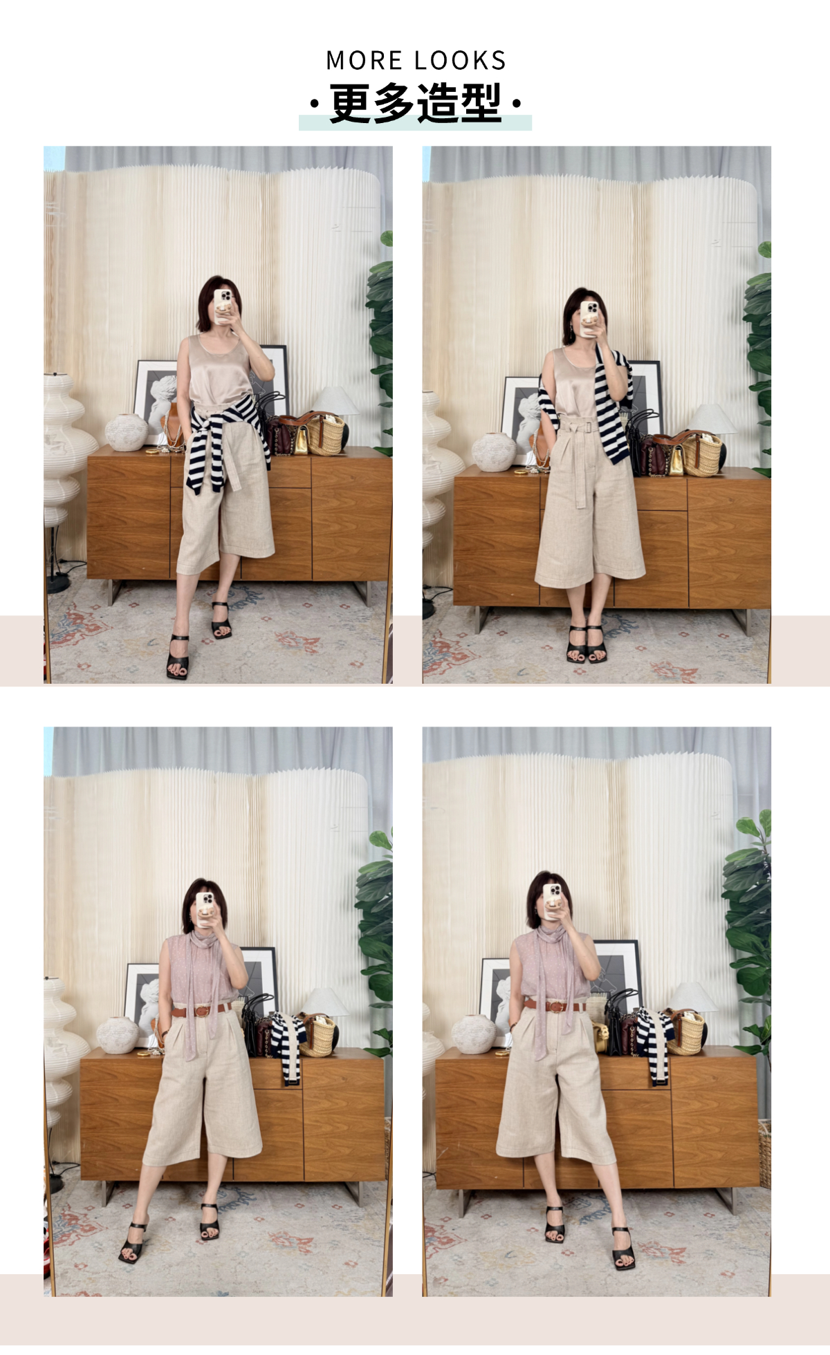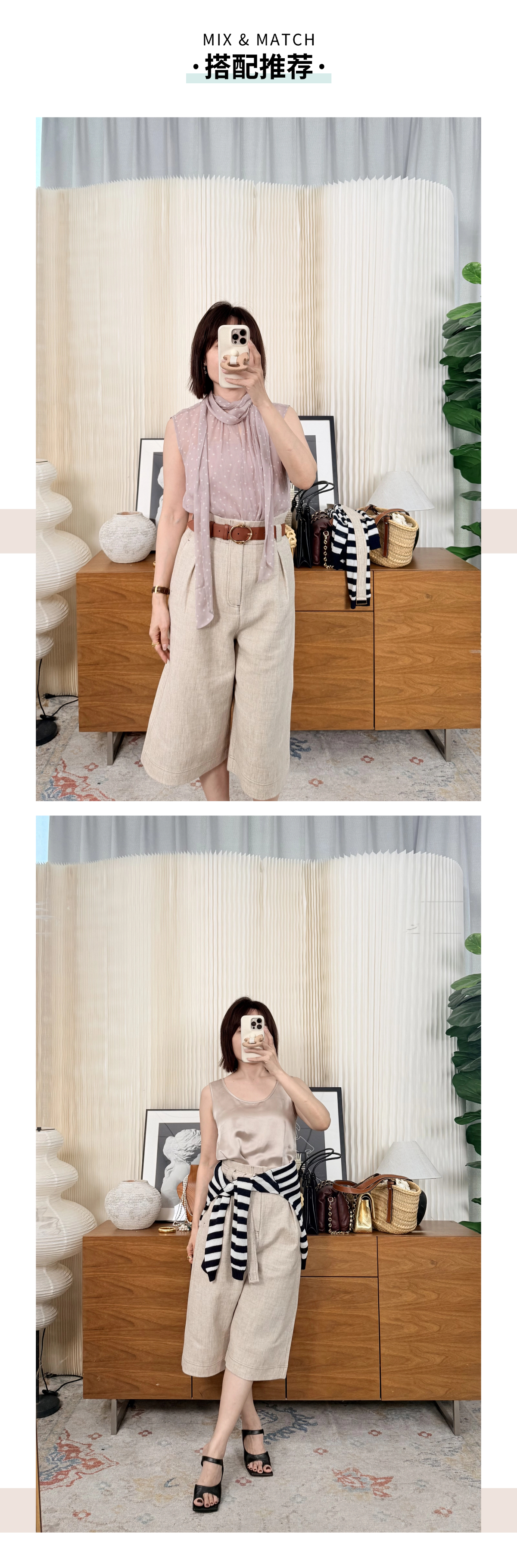 女爵士魅力 定纺60亚麻40棉混纺 高腰七分阔腿裤 抗皱挺括时髦款