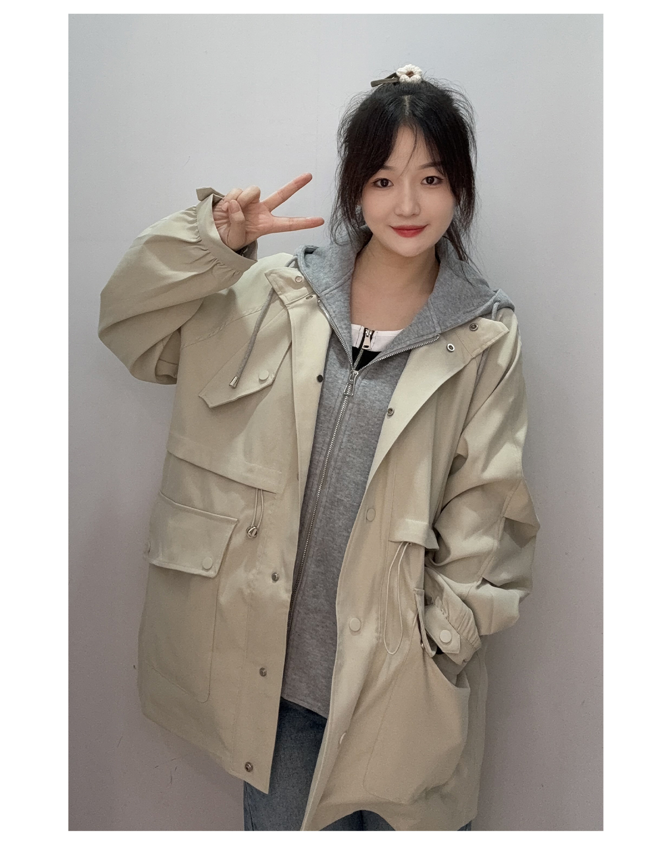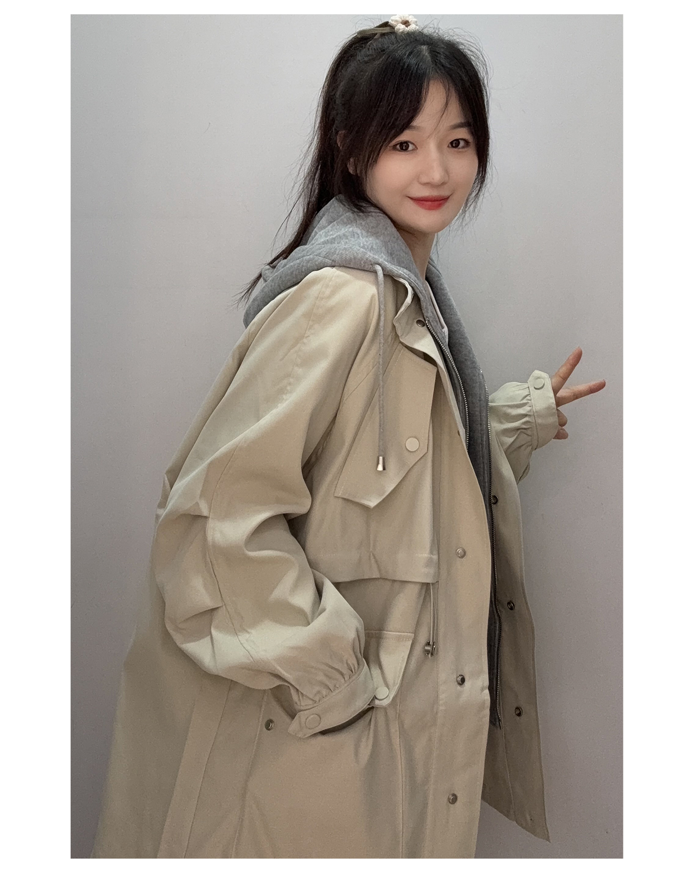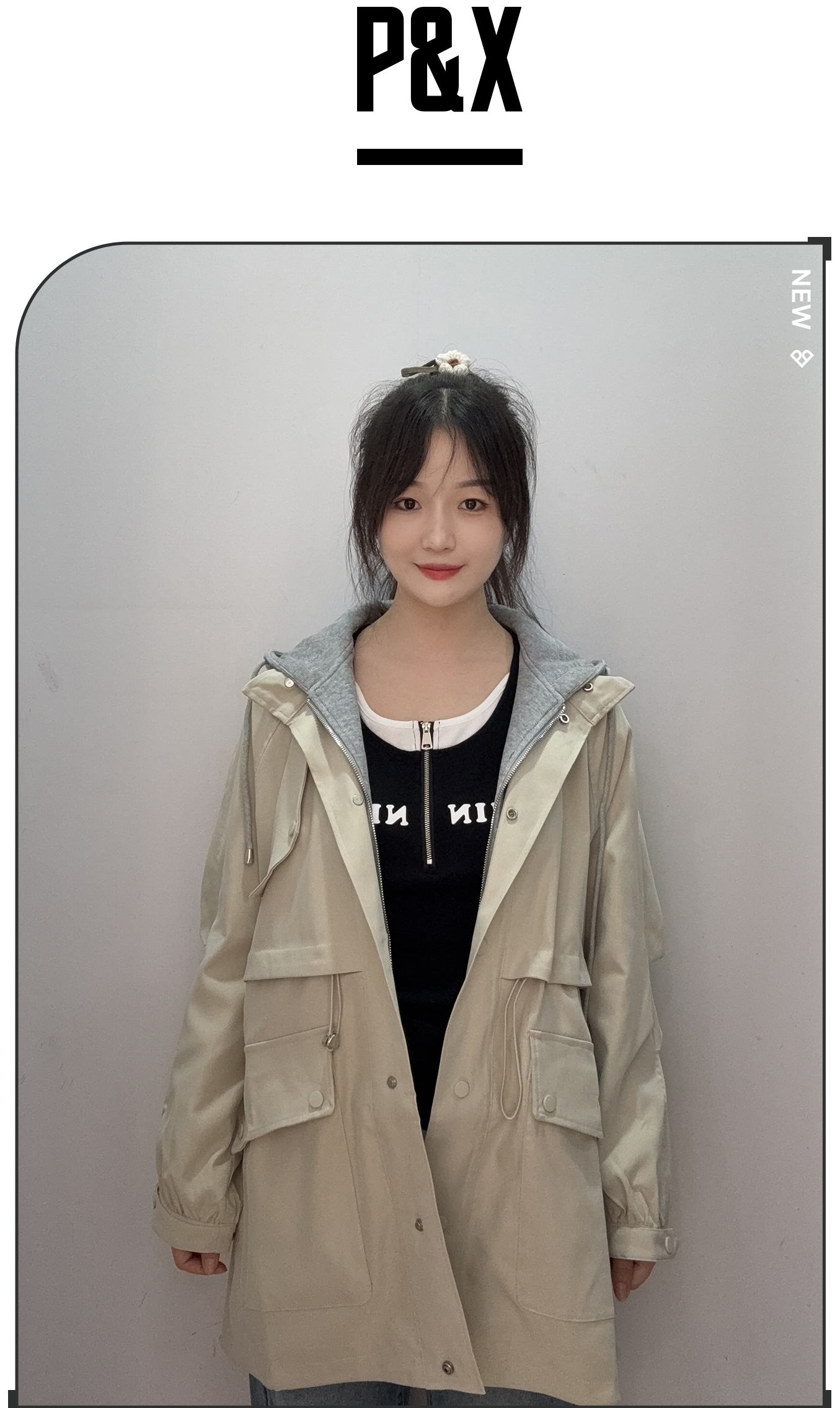 &X设计师女装春秋常规款冲锋衣连帽中长款风衣824119838 杏色