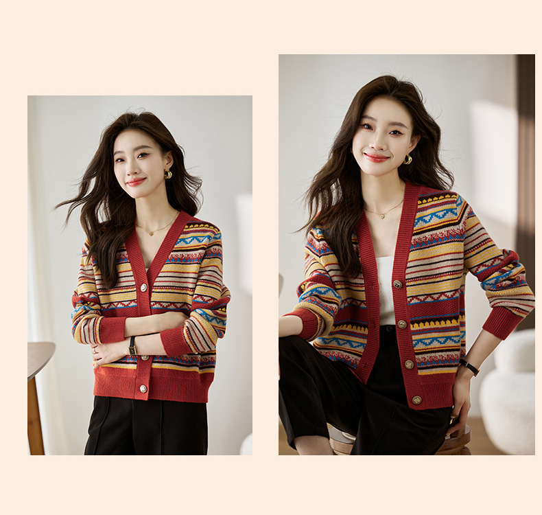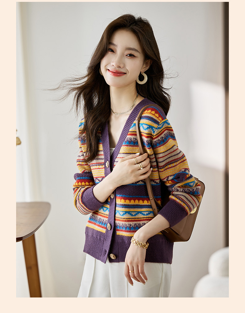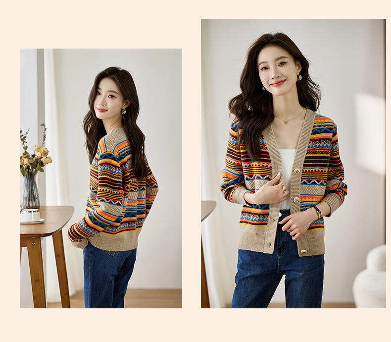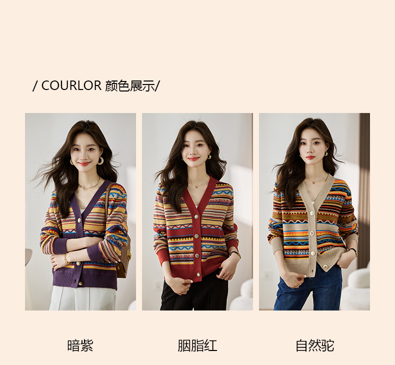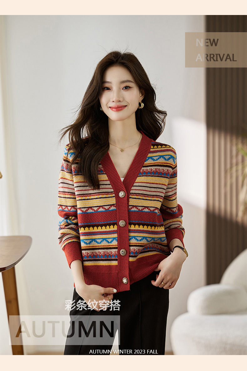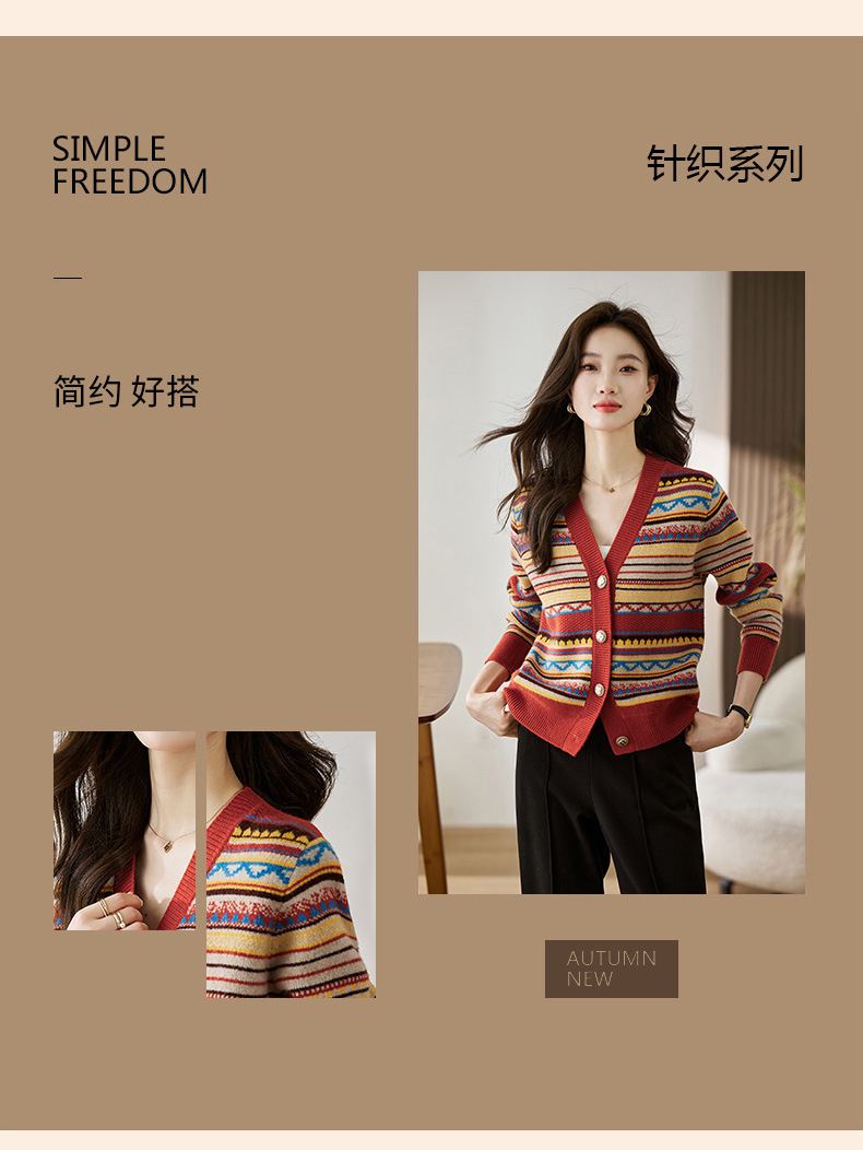 条纹V领针织开衫,春秋季新款时尚宽松百搭洋气外穿外搭上衣CC-108-92037
