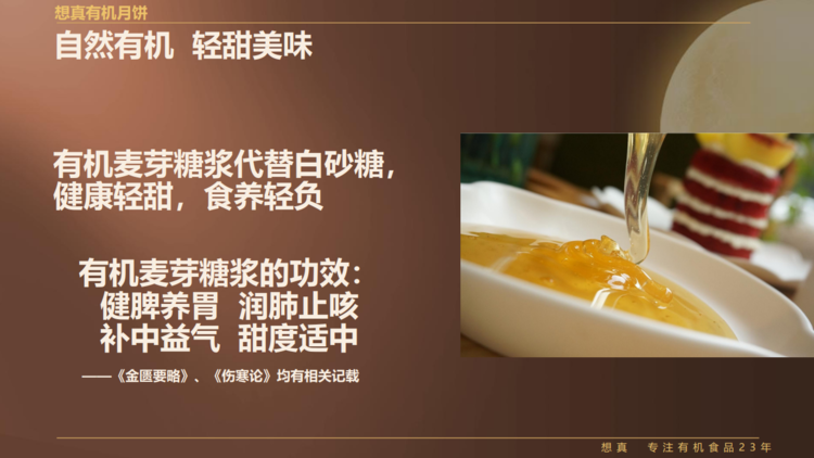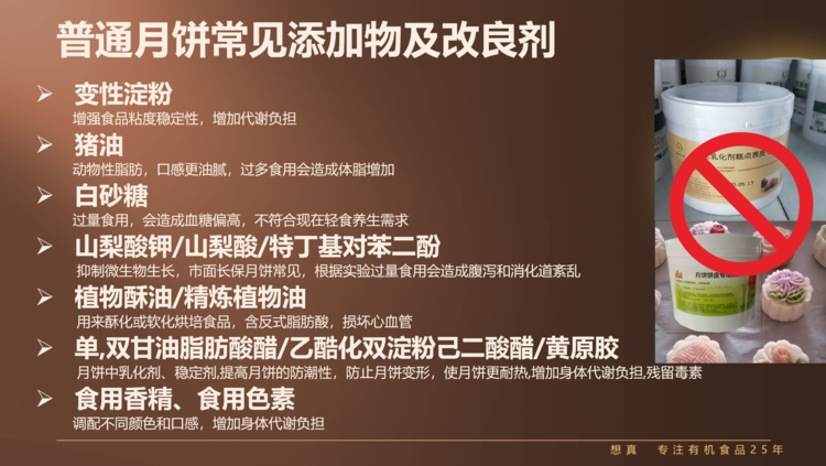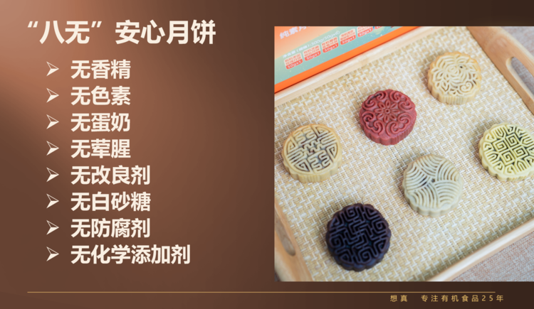 ② 配方好食养才好:想真有机月饼由专注有机食养25年的想真公司出品,由执业药师、营养师、健康管理师联合研发月饼配方,健康配比,纯素食养,配料干净,美味安心。