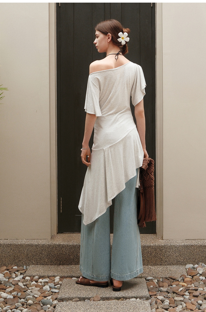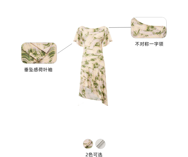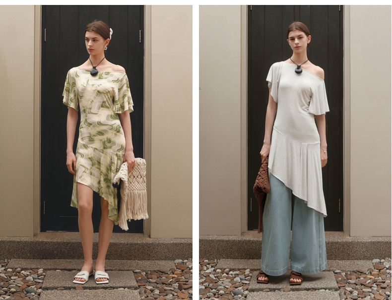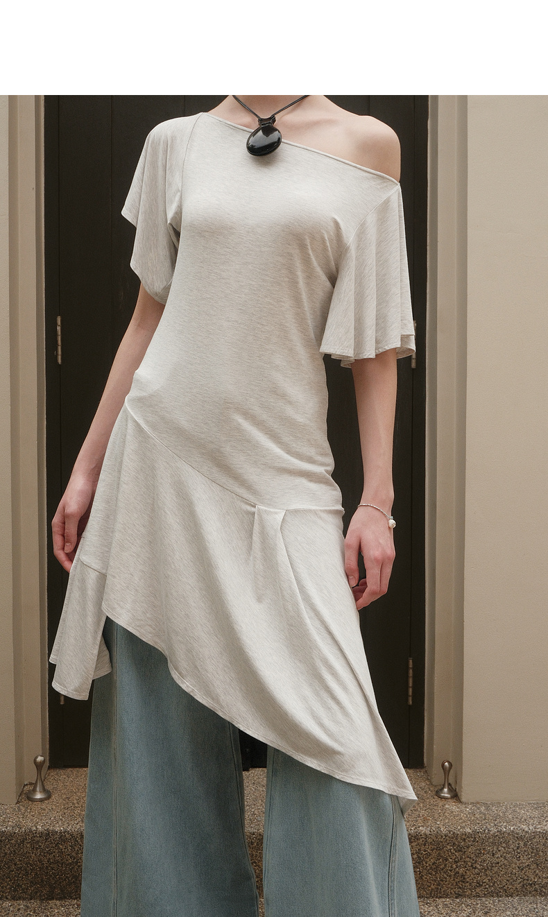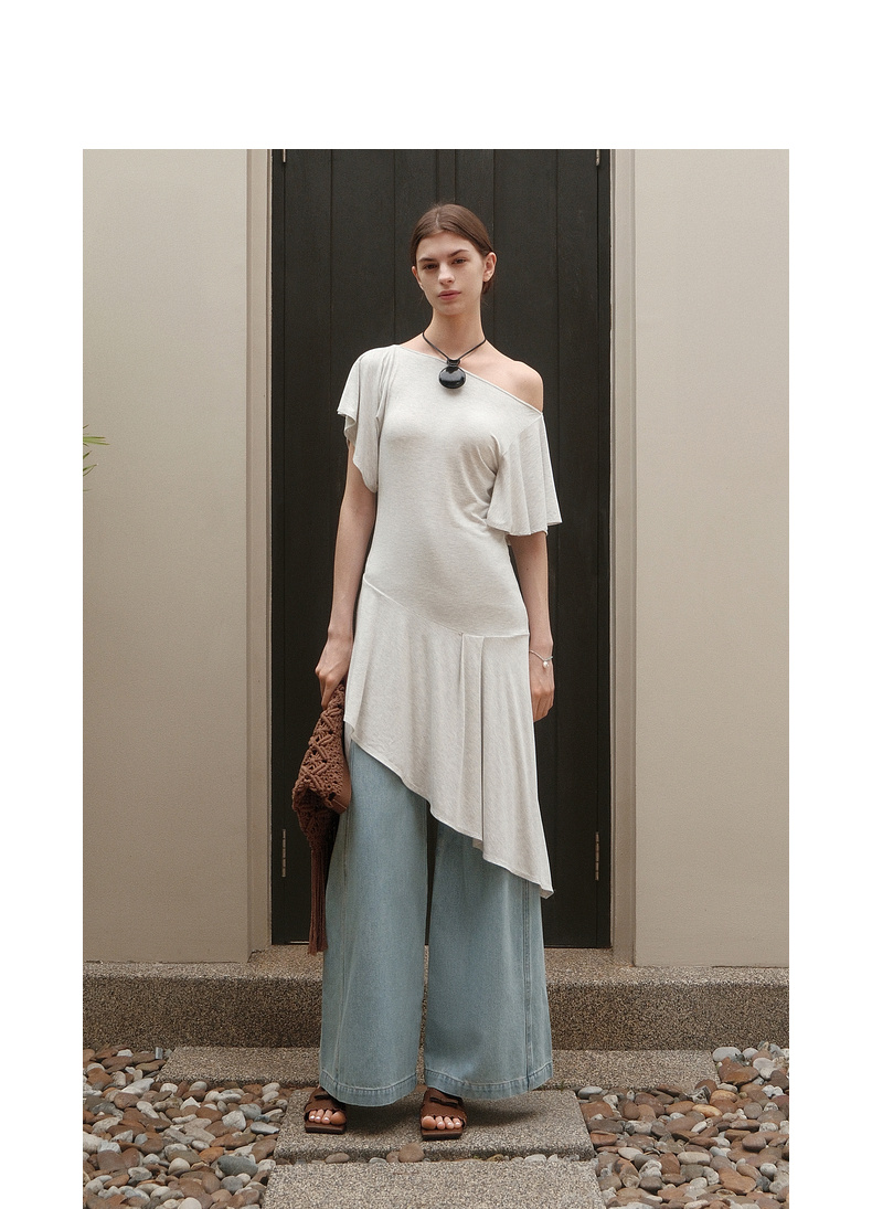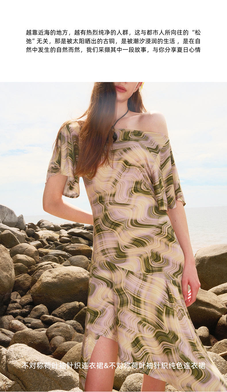 lost in echo2025夏季新款度假不对称露肩荷叶袖透气针织连衣裙女