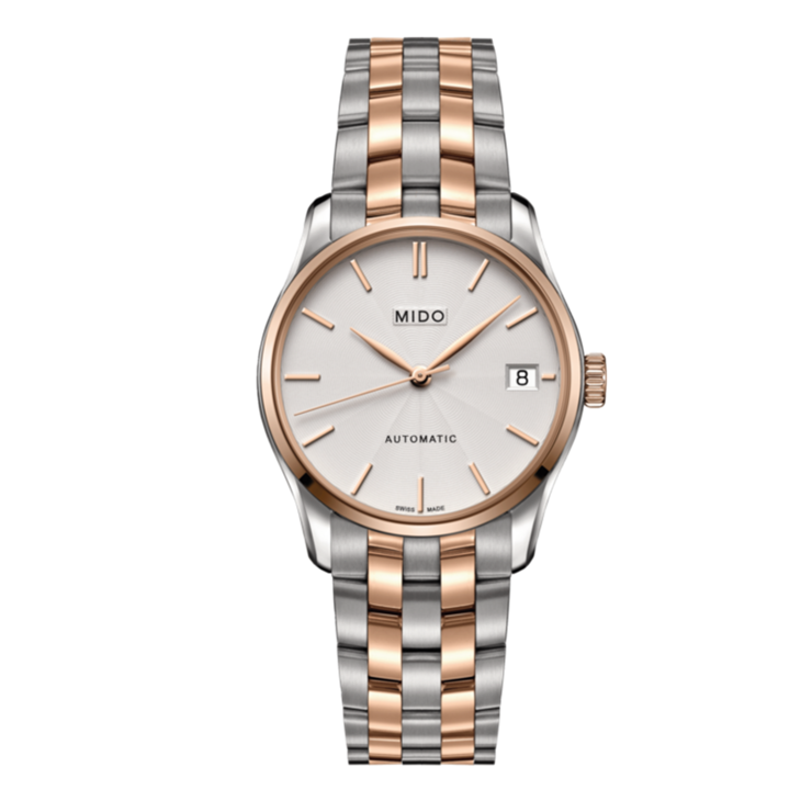 镜面 材质 | 蓝宝石水晶玻璃 | 表盘 | 精钢 PVD镀玫瑰金表壳 银白色表盘 大三针 日期显示 镶贴时标 透底 |