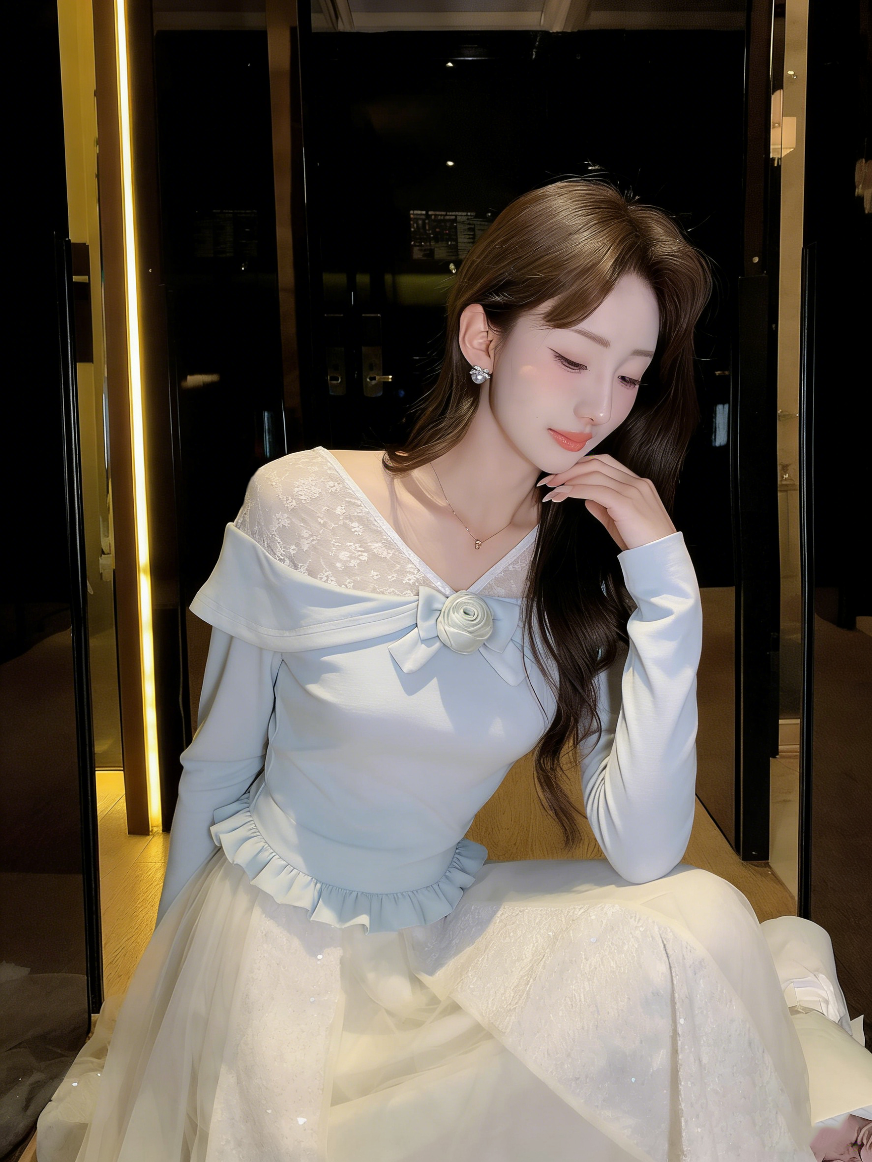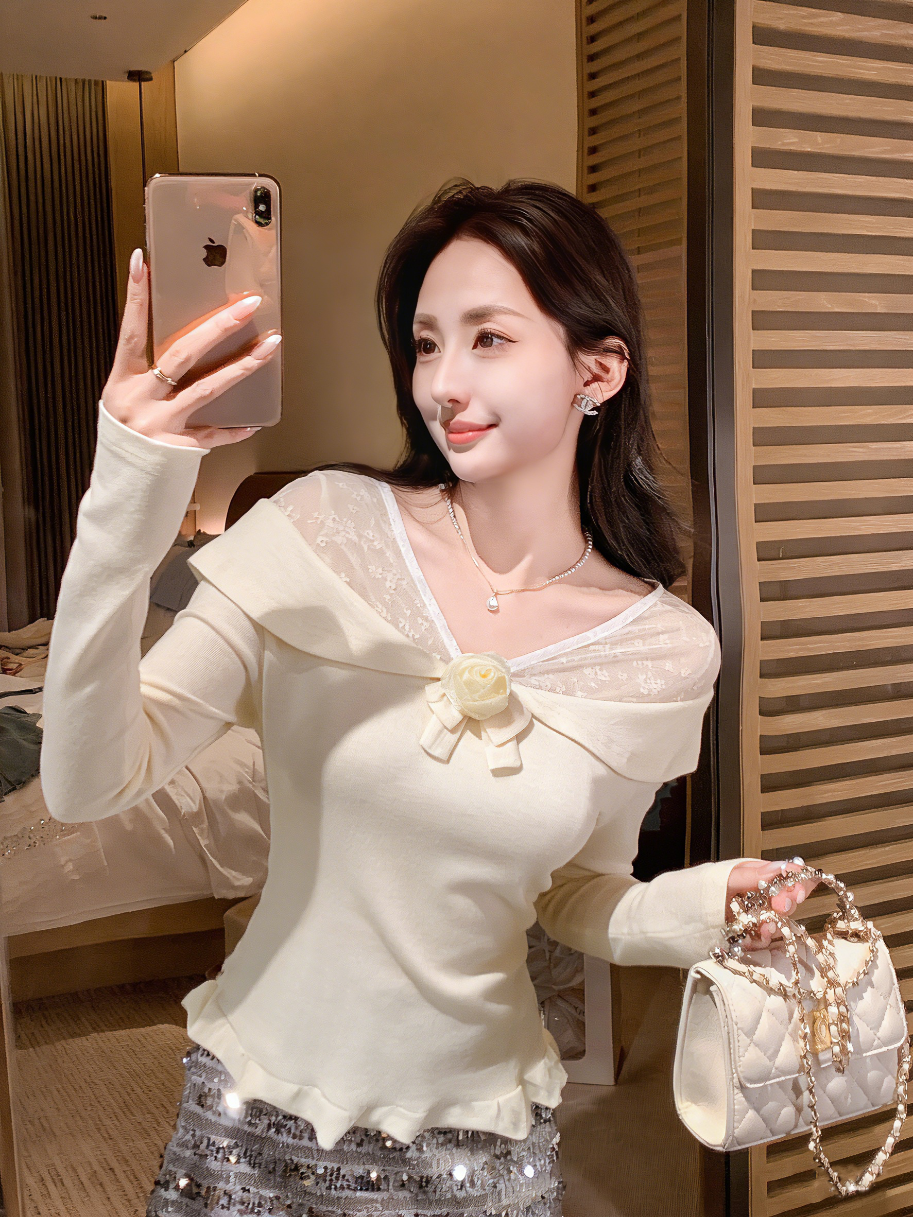 张心子【雾都晚宴】名媛优雅气质闪闪香槟斜肩上衣 U2509003