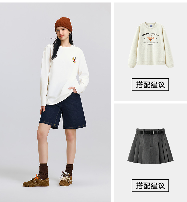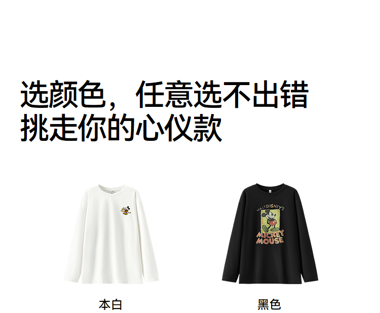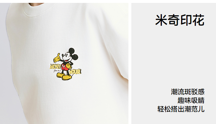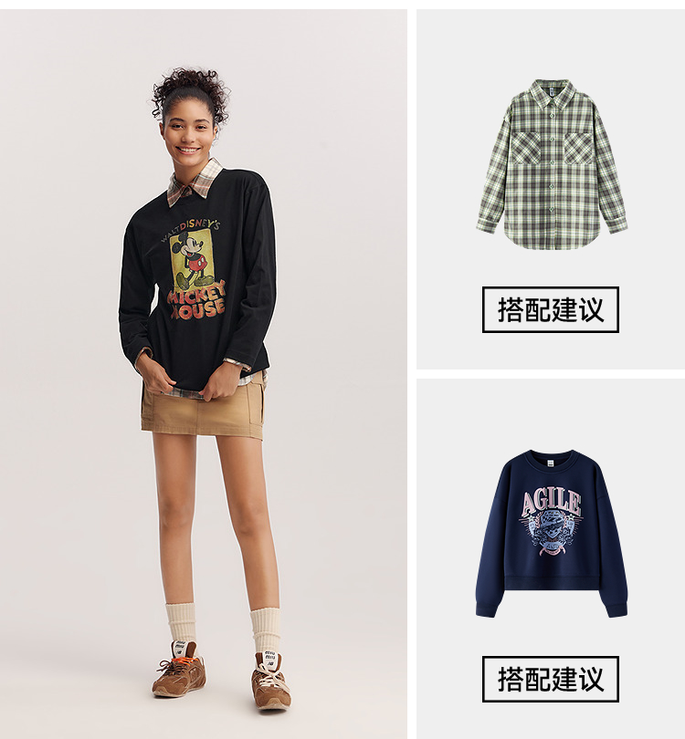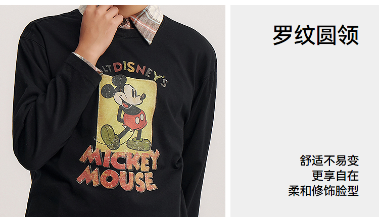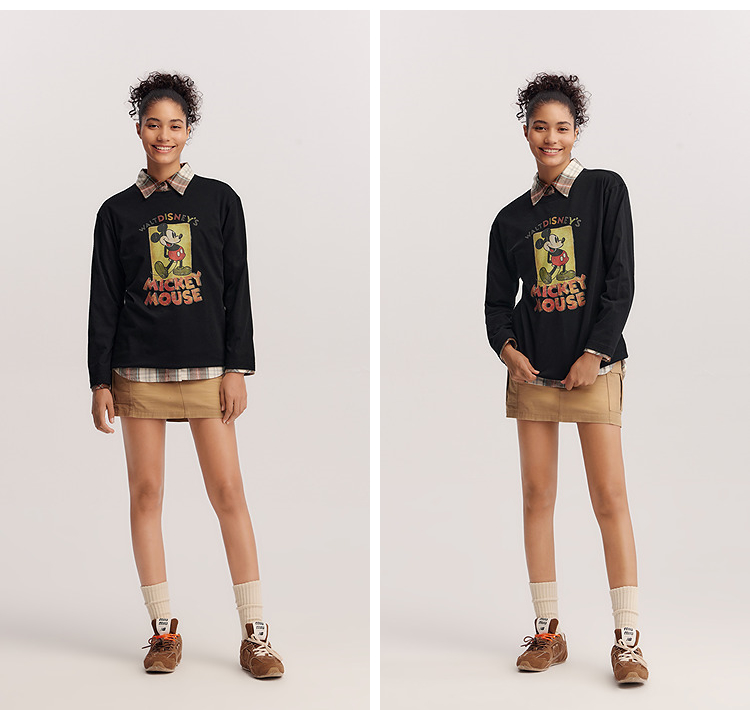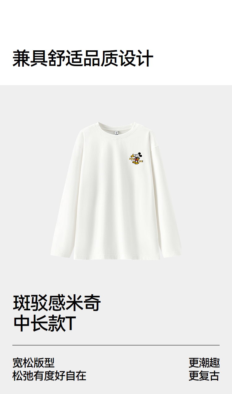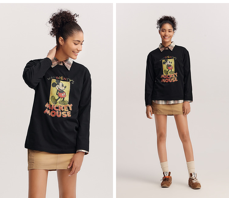 森马迪士尼合作系列长袖T恤女春季中长款米奇宽松落肩复古风上衣