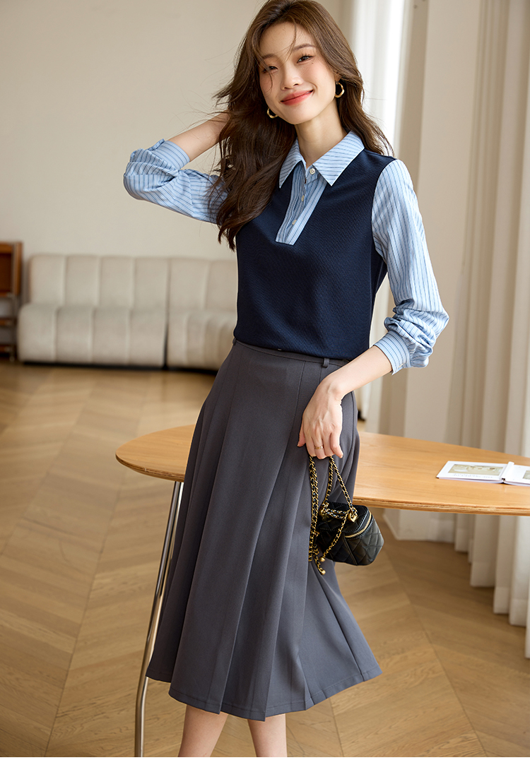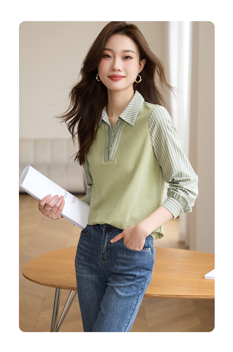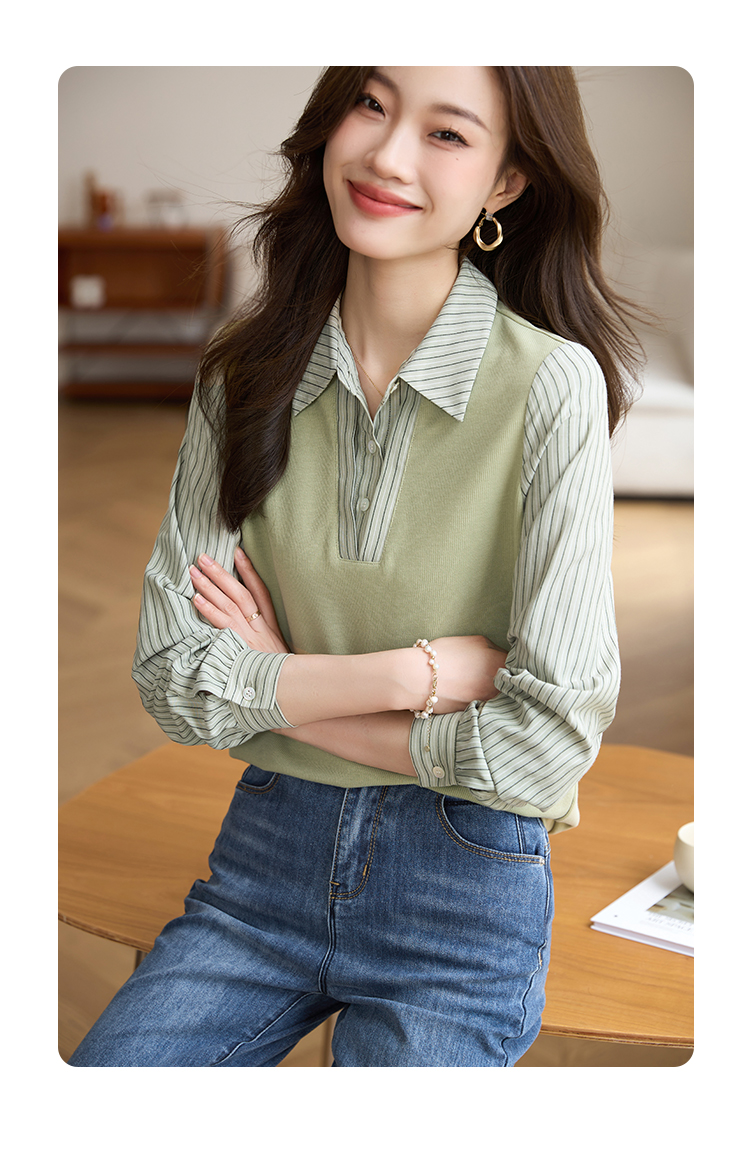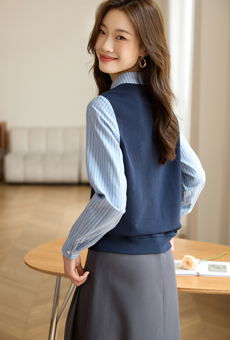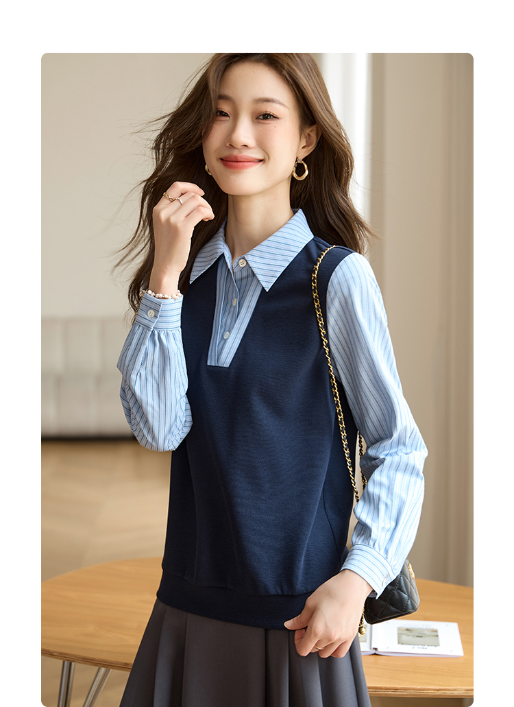 【专属特价】熙世界假两件撞色条纹长袖衬衫拼接针织上衣女士衬衣2025早秋款